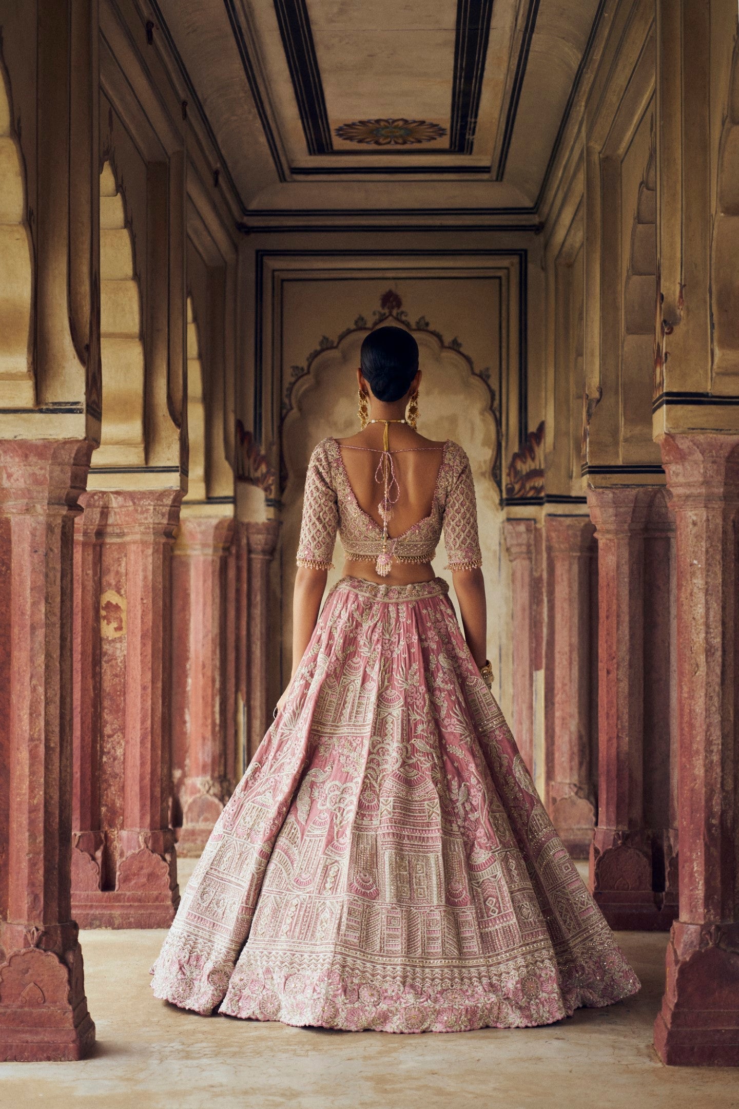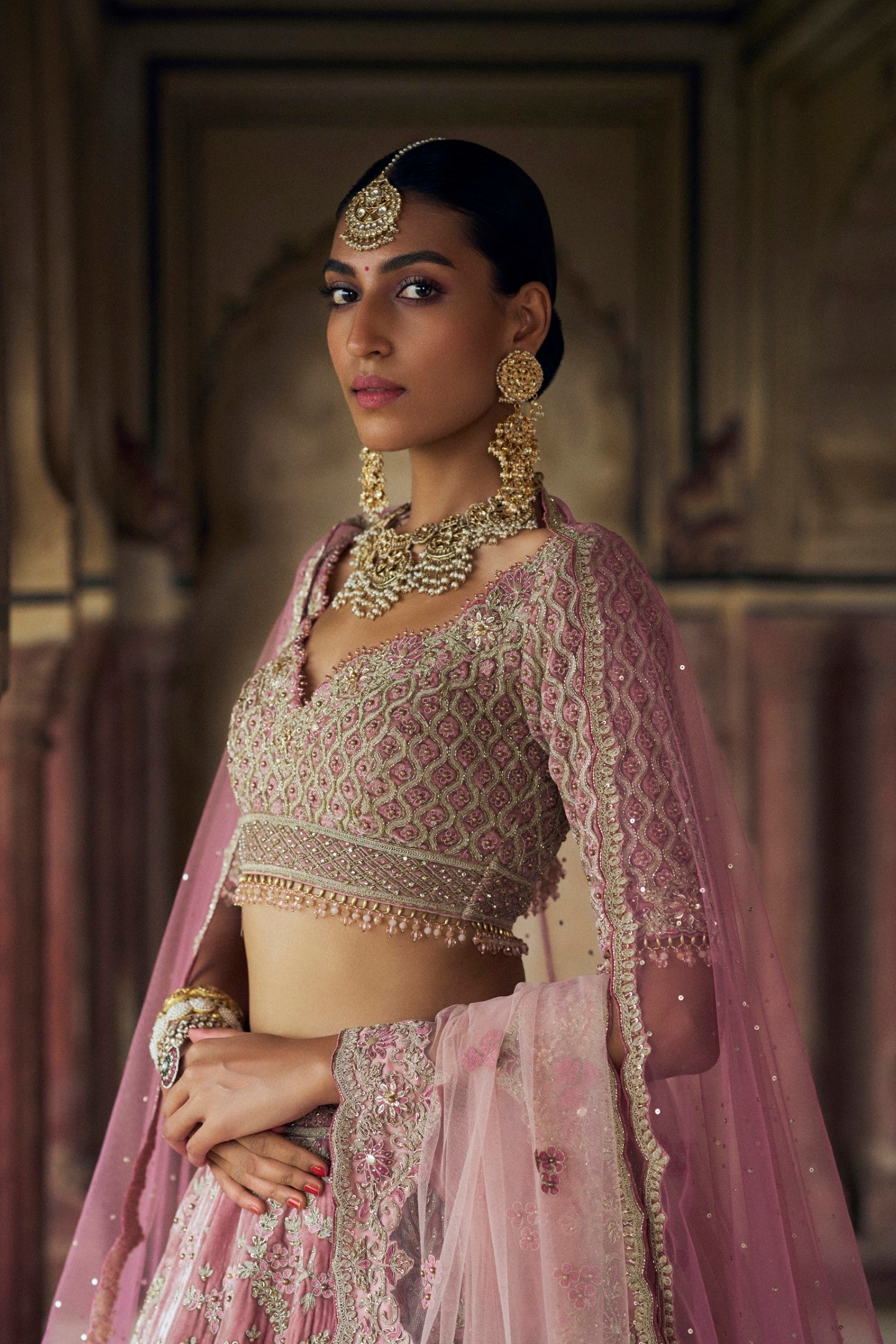 Blush pink velvet lehenga choli set with net dupatta embroidered in rosegold kasab highlighted with dabka, sequins, beads and crystals. It has an optional second worked dupatta and head veil that can be ordered separately.