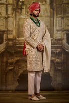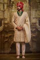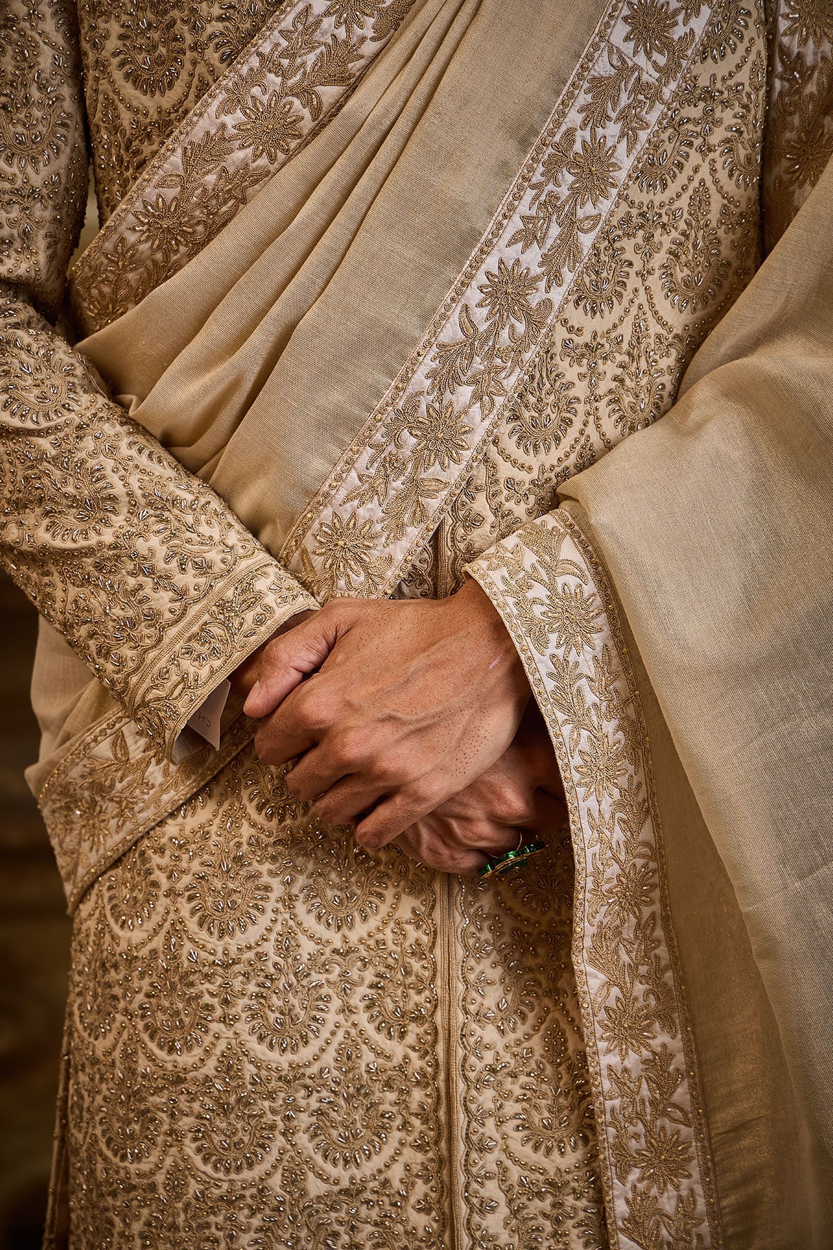Blush Raw Silk Sherwani Beige Dori Work Embroidery Highlighted With Dabka, Moti And Accompained With A Cotton Silk Kurta And Pant. An Optional Gold Raw Silk Stole, Belt And Worked Jutis Can Be Ordered Additionally.