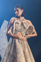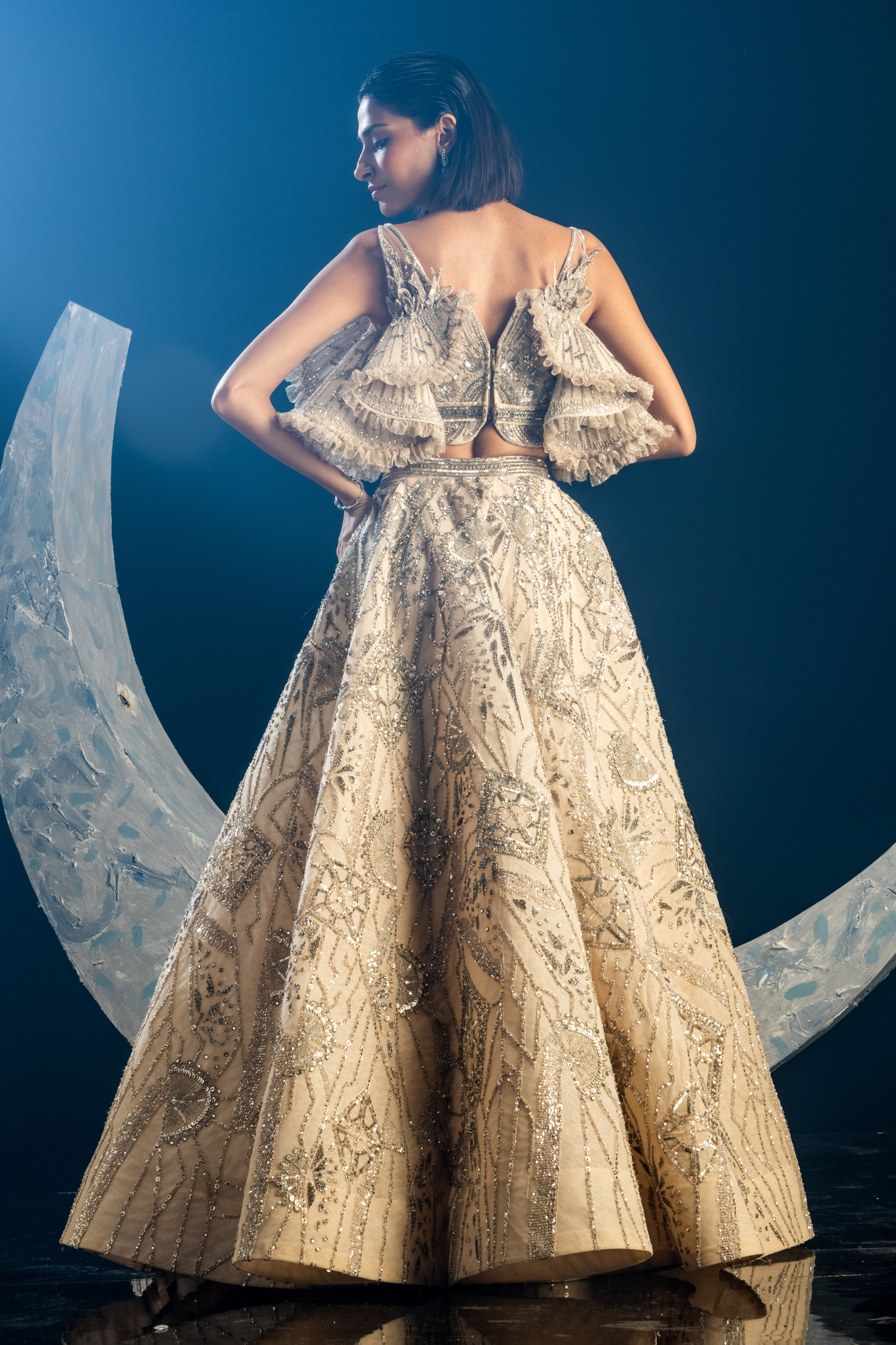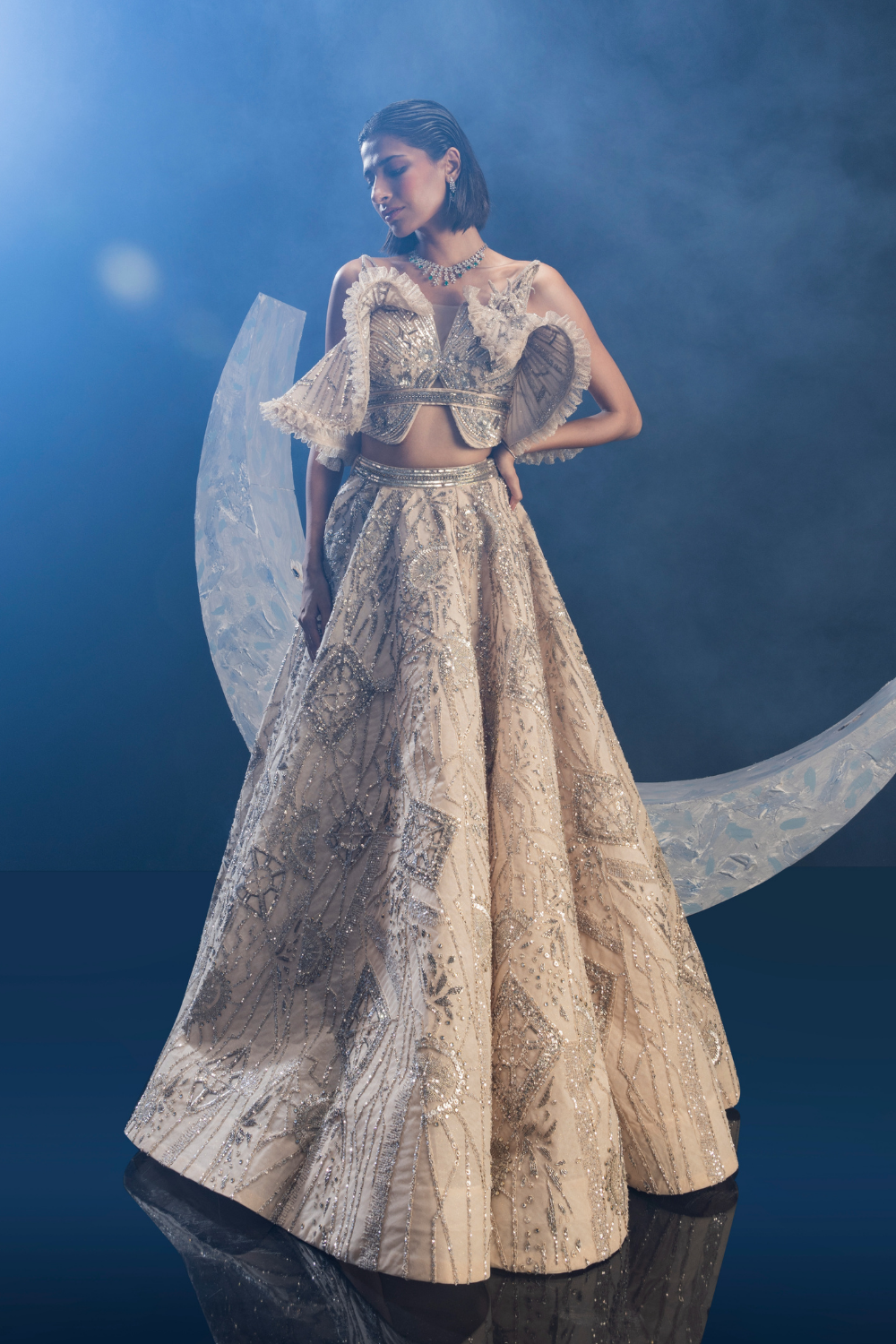 Blushed Pastel top and skirt with radiant geometric embroidery and bejeweled wing structures.