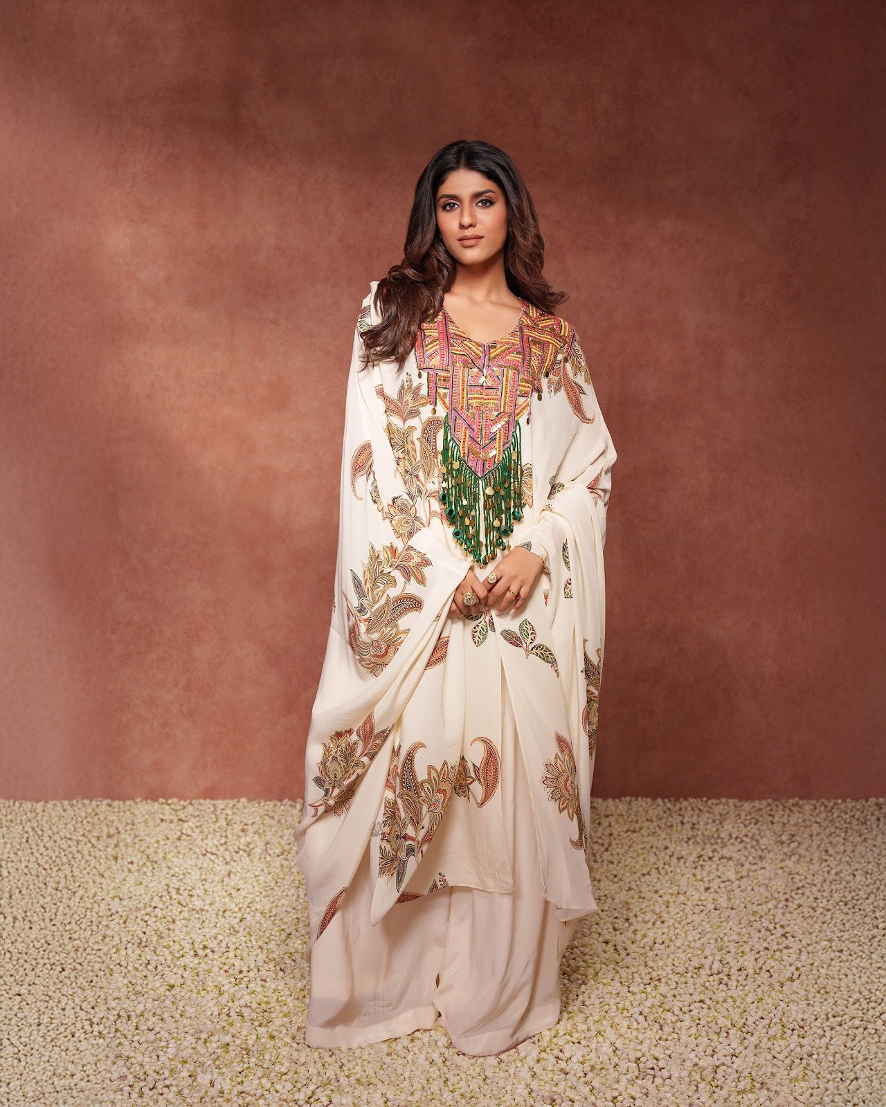 Boho-inspired Embroidered Kaftan featuring intricate embroidery and green tassels with floral prints.