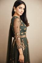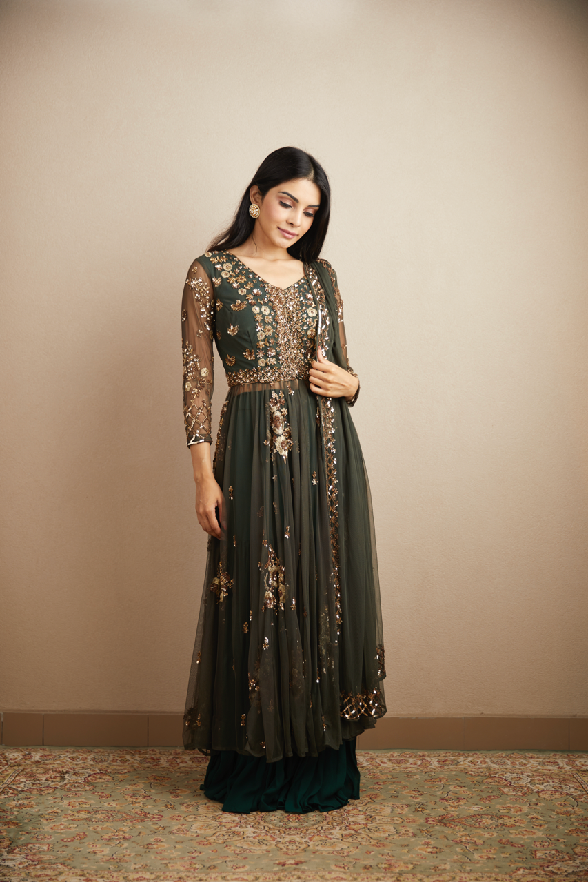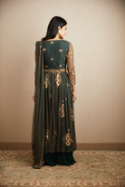 BOTTLE GREEN FRONT OPEN JACKET AND SHARARA SET