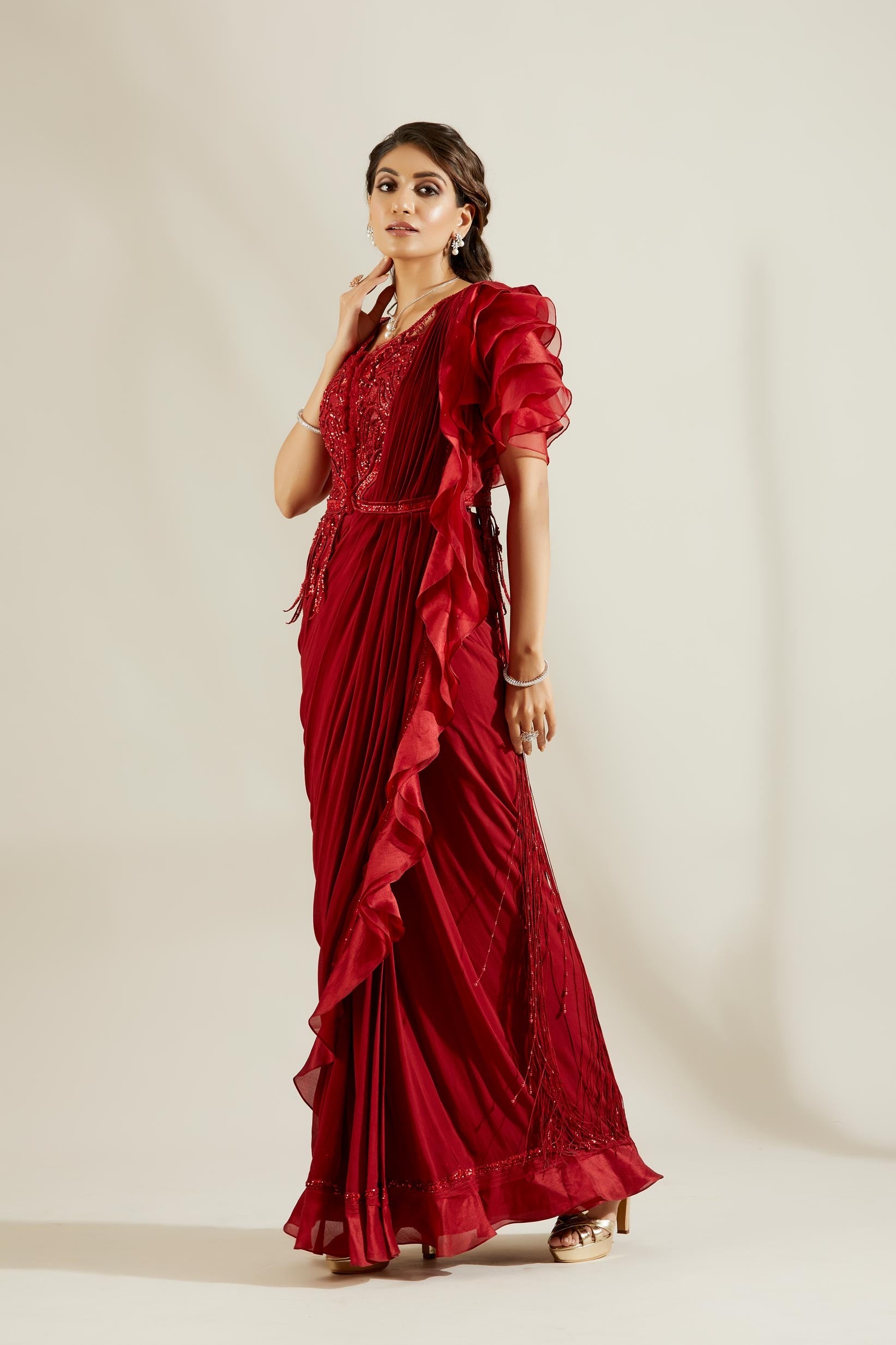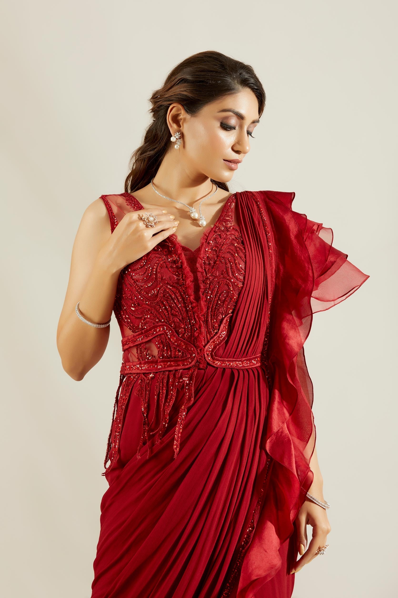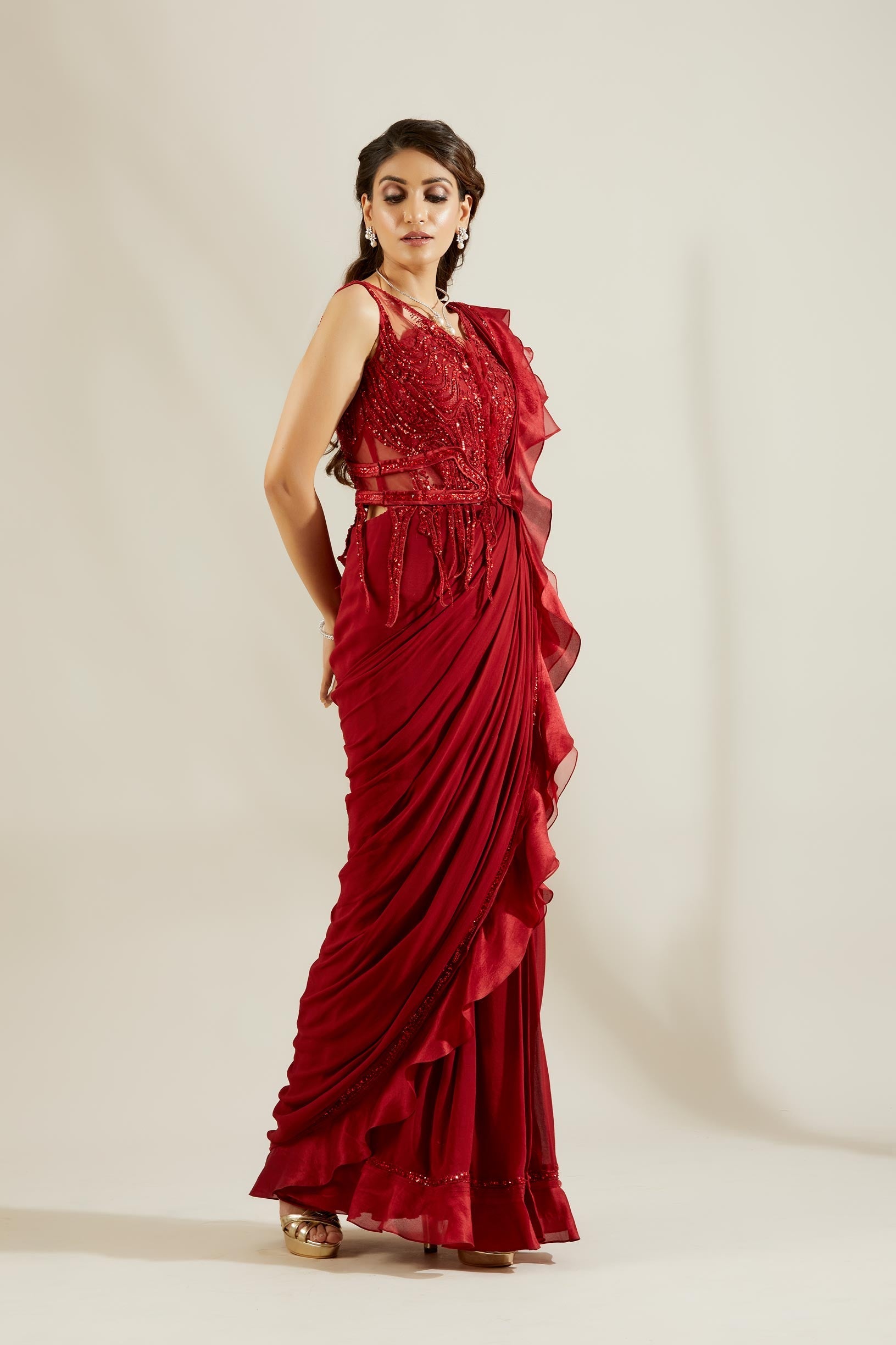 Crimson red pre-stitched drape Saree with dramatic V-neck corset blouse and soft brush stroke embroidery