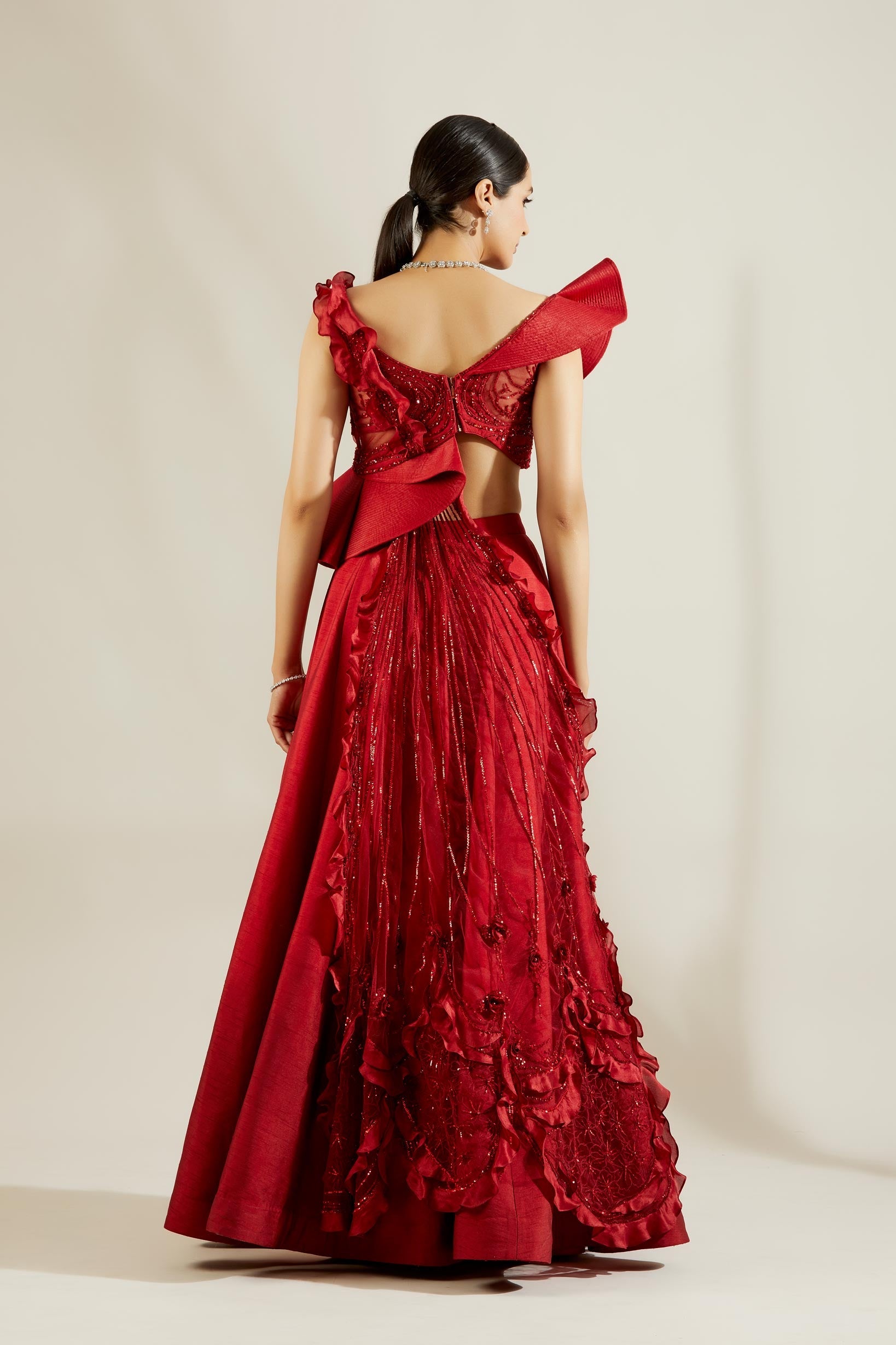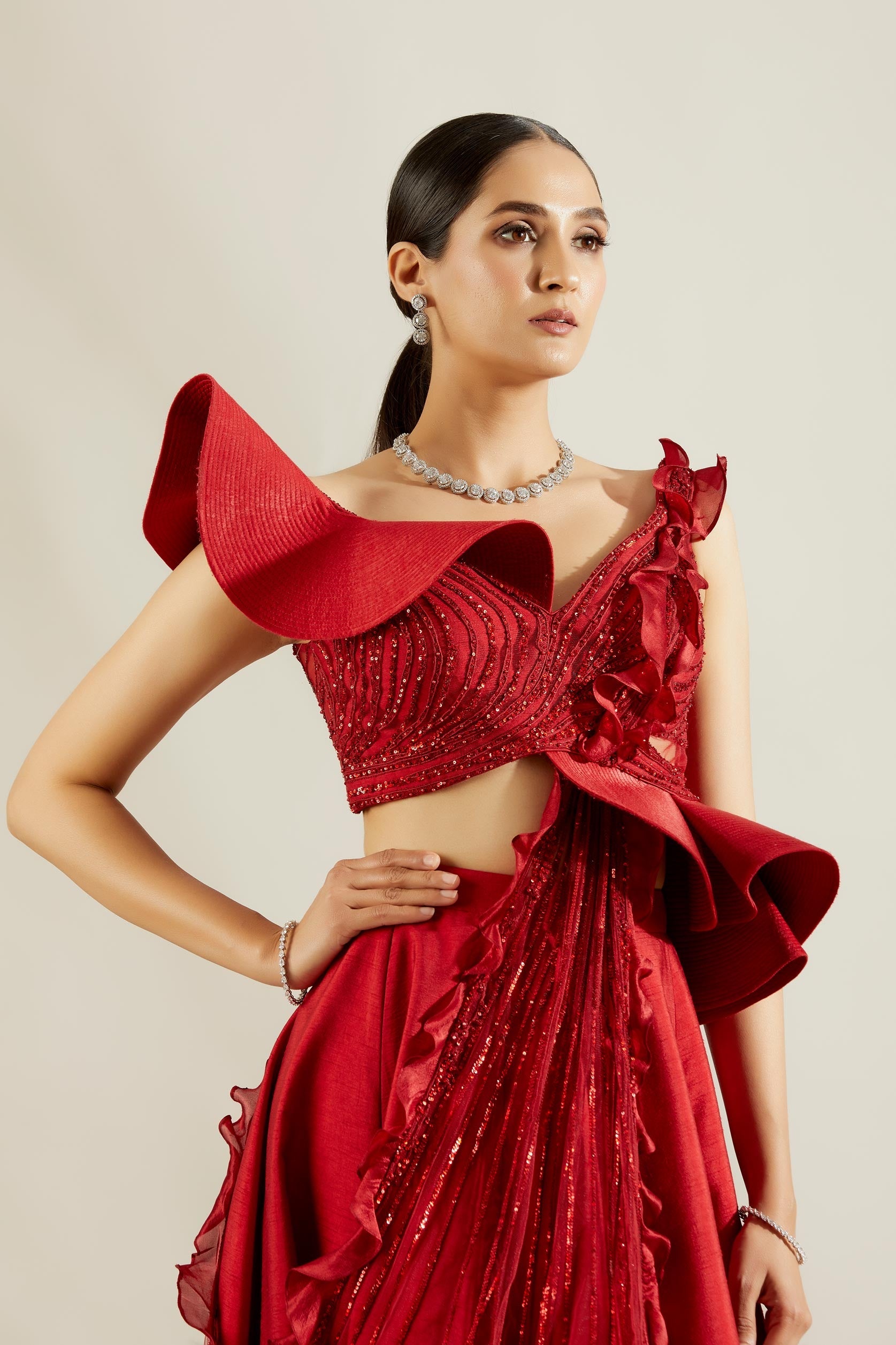 Brill Crimson peaked sculpted shoulder blouse with sequin embroidery with attach chunni & plain Skirt