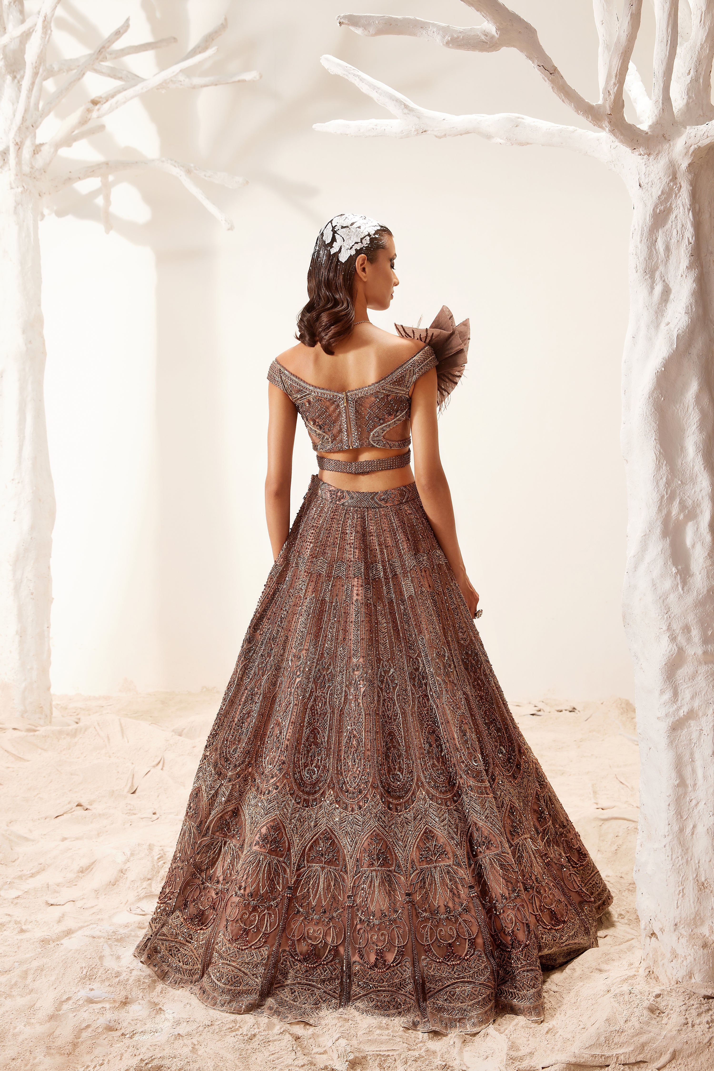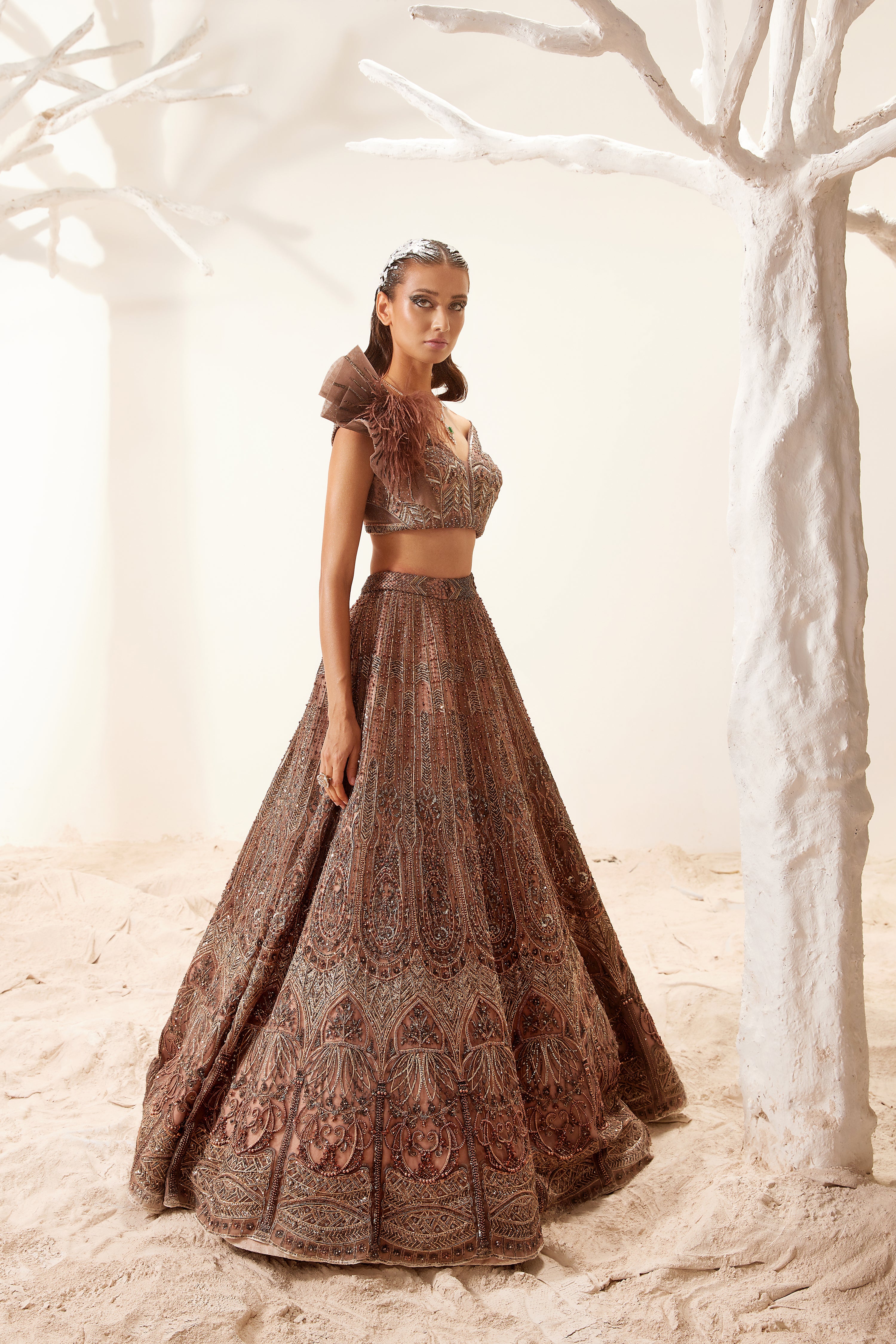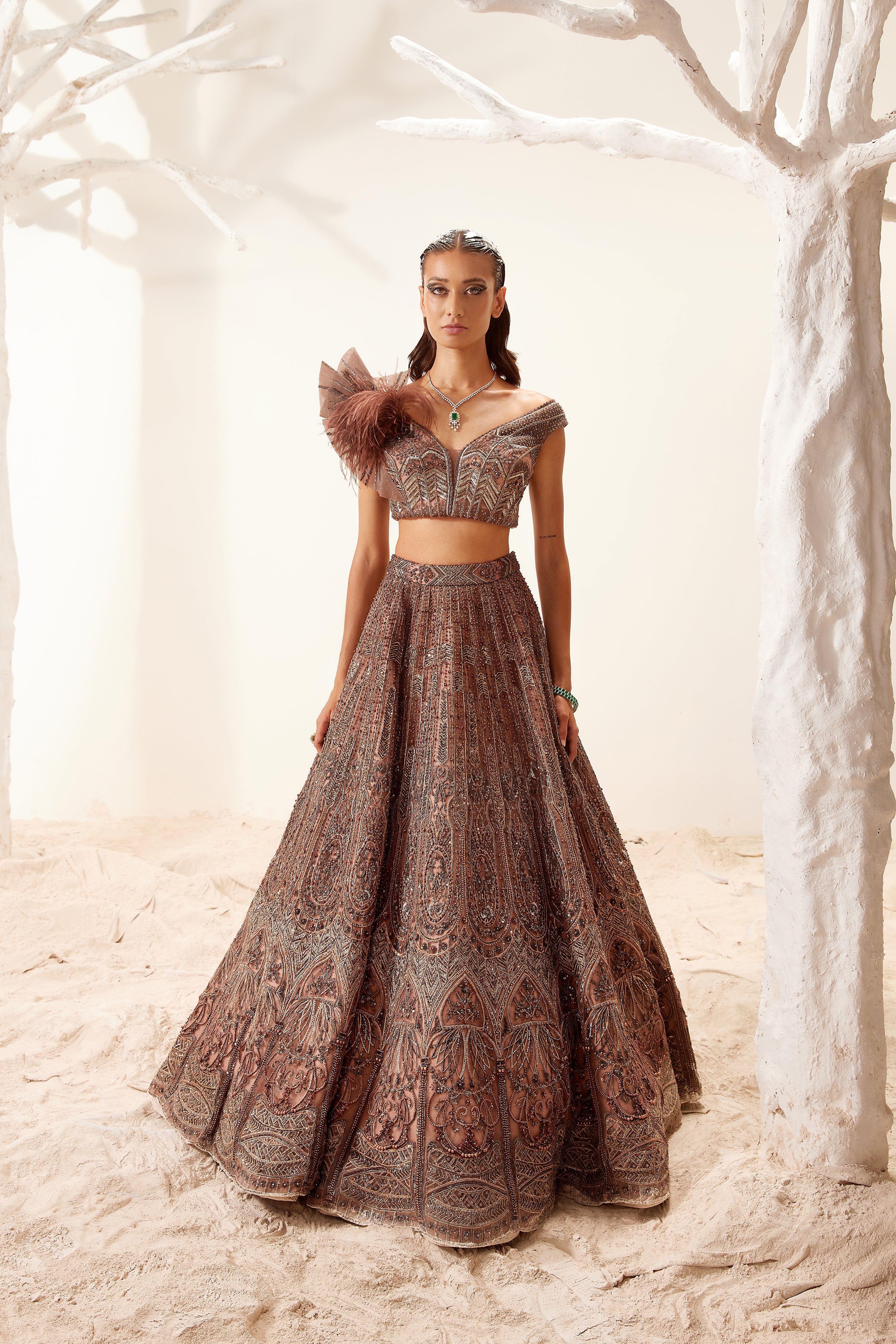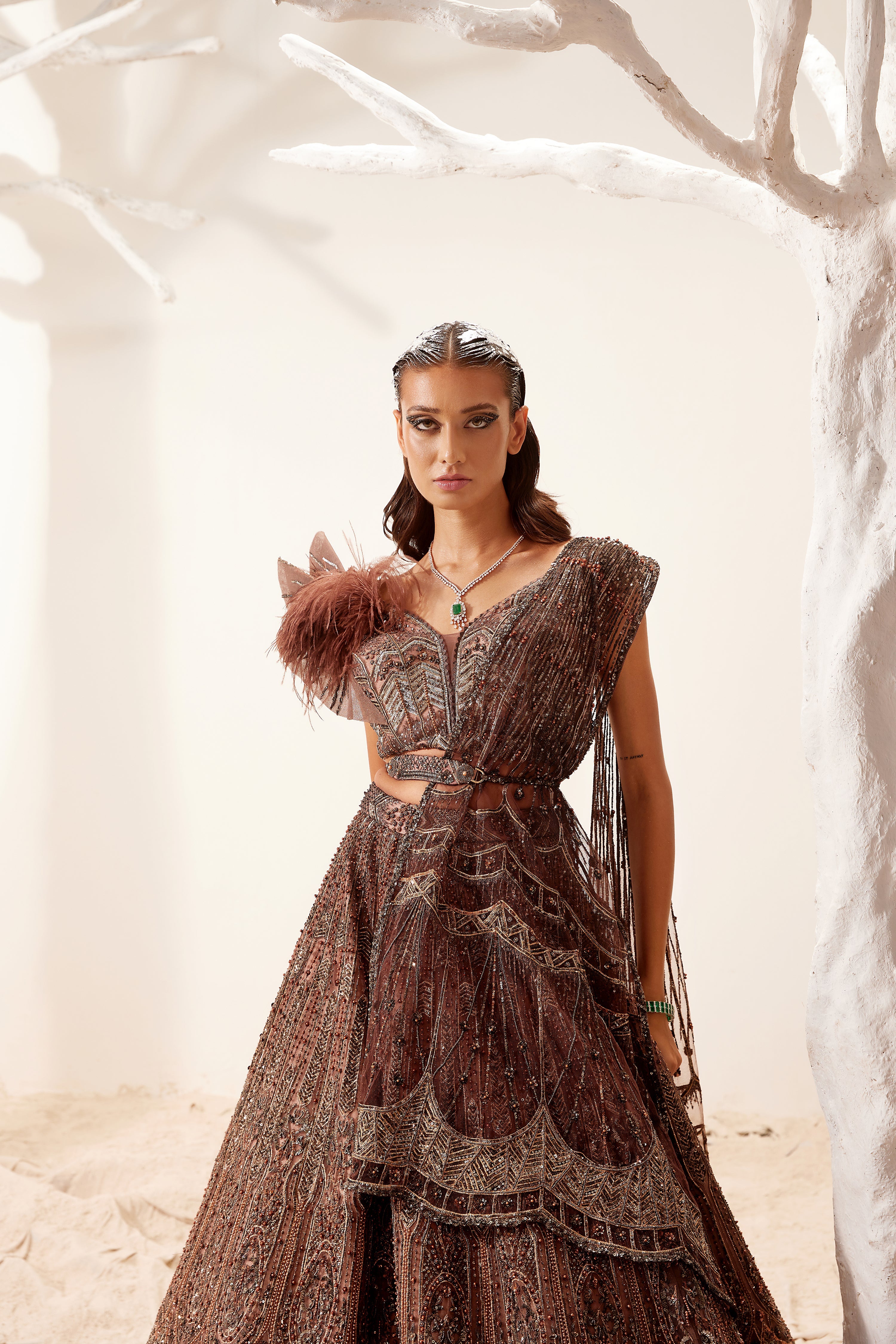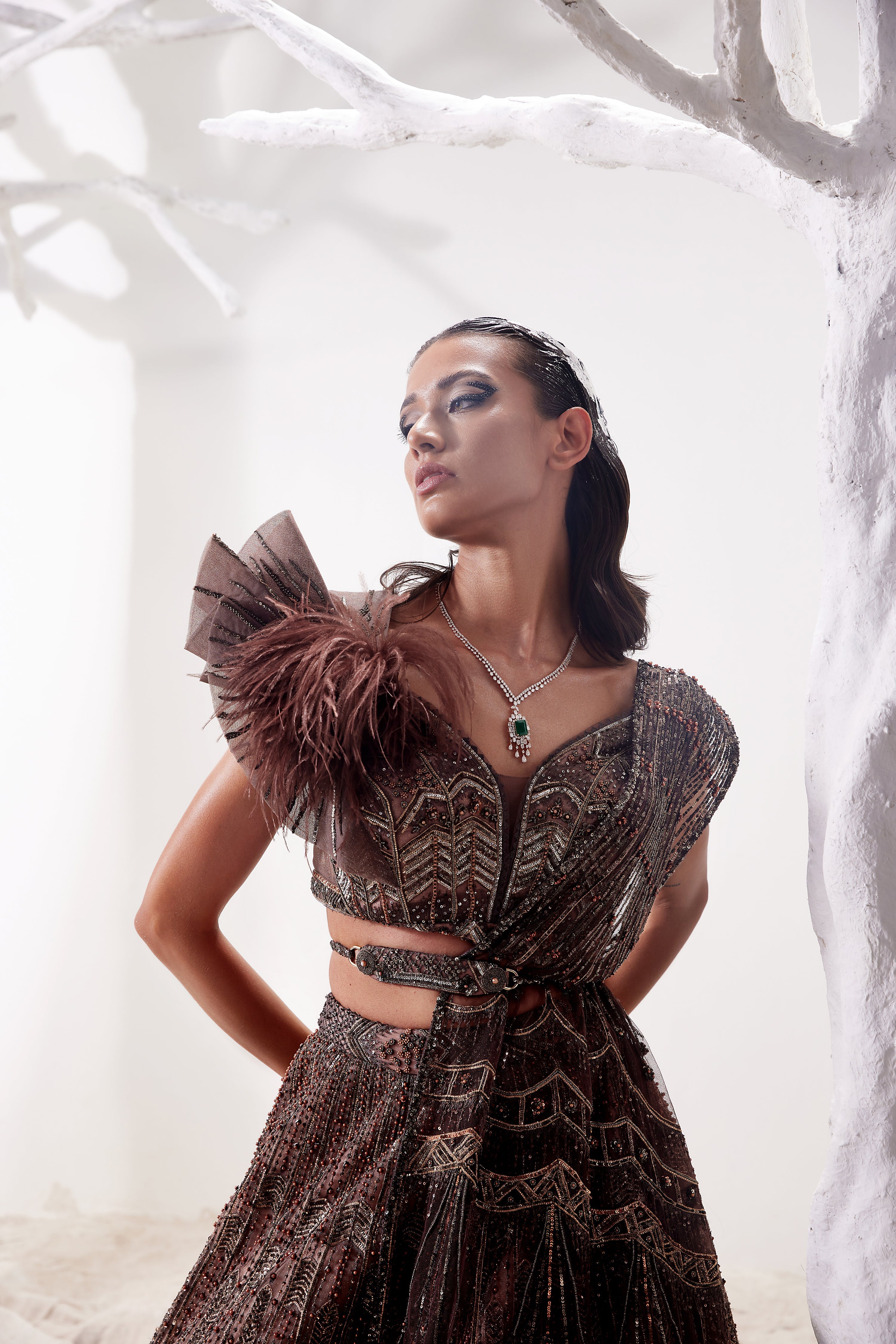 Satin Brown Bronze mood art inspired lehenga with spiked shoulder ,feather detail on the blouse.