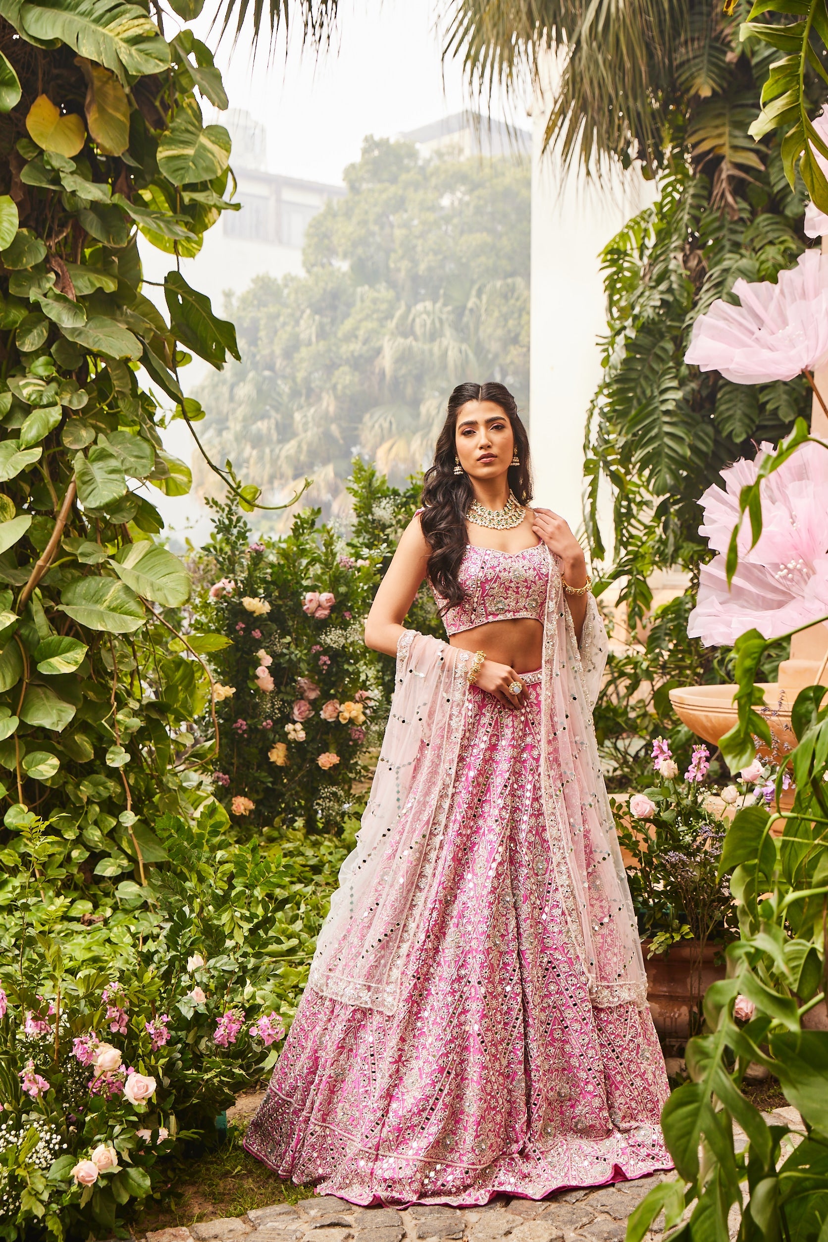 Featuring pink mirror work lehenga, meticulously hand-embroidered on raw silk with mirror, bead, zari, stone, sequin, and cutdana details. Paired with an ombre effect tulle dupatta adorned with mirrors, cutdana, and sequins.
