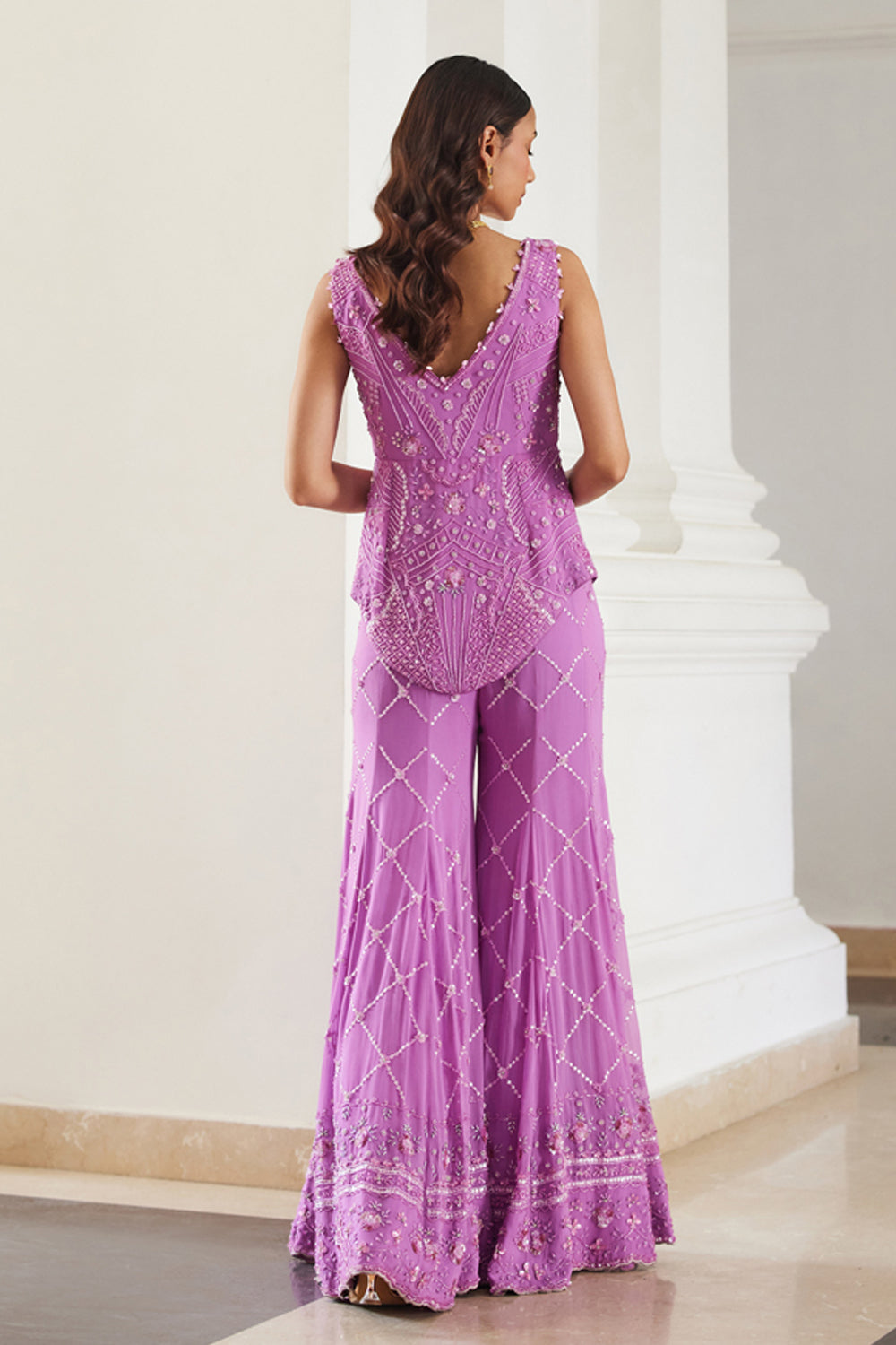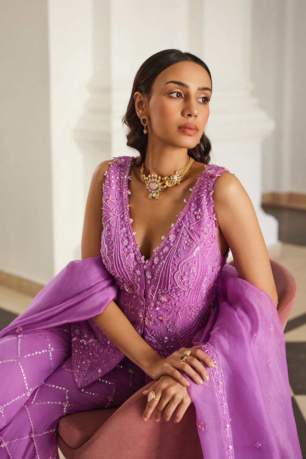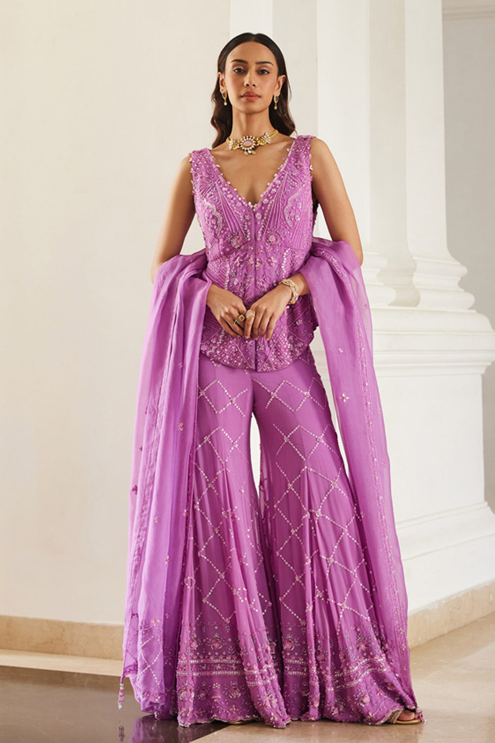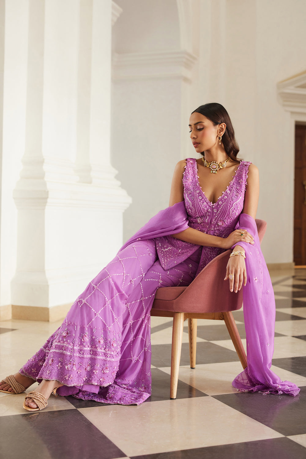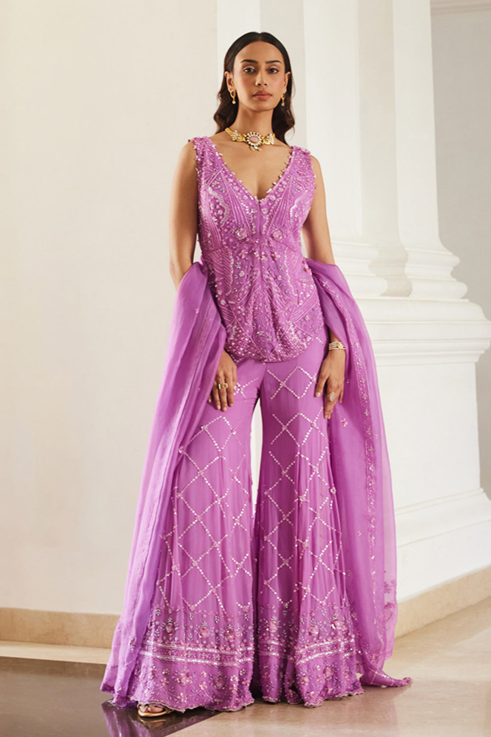 Bubblegum pink tonal hand embroidered pants with a mix of geometric checks and a complimentary floral jaal at the bottom. It is paired with a high-low peplum top and a matching organza dupatta.
