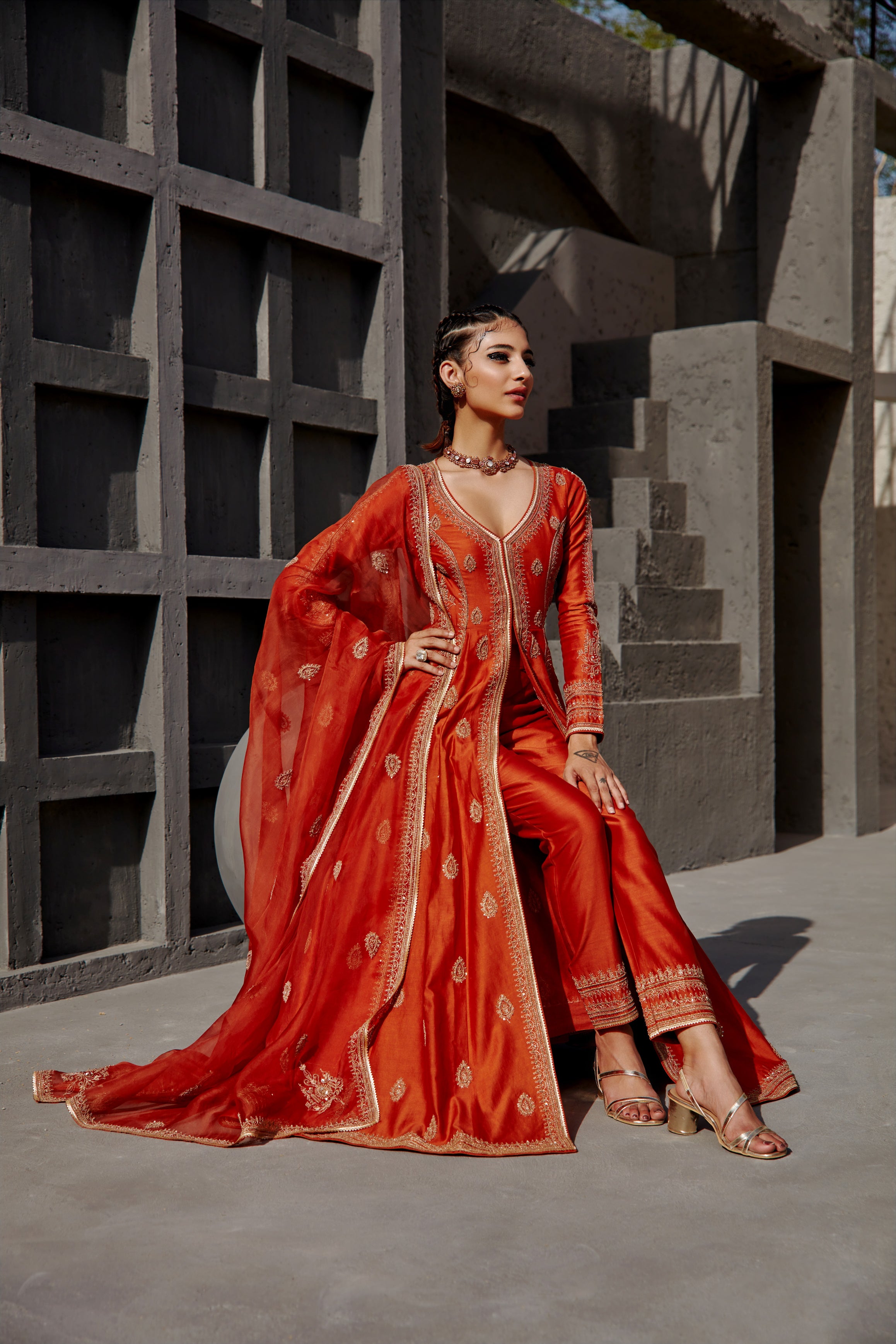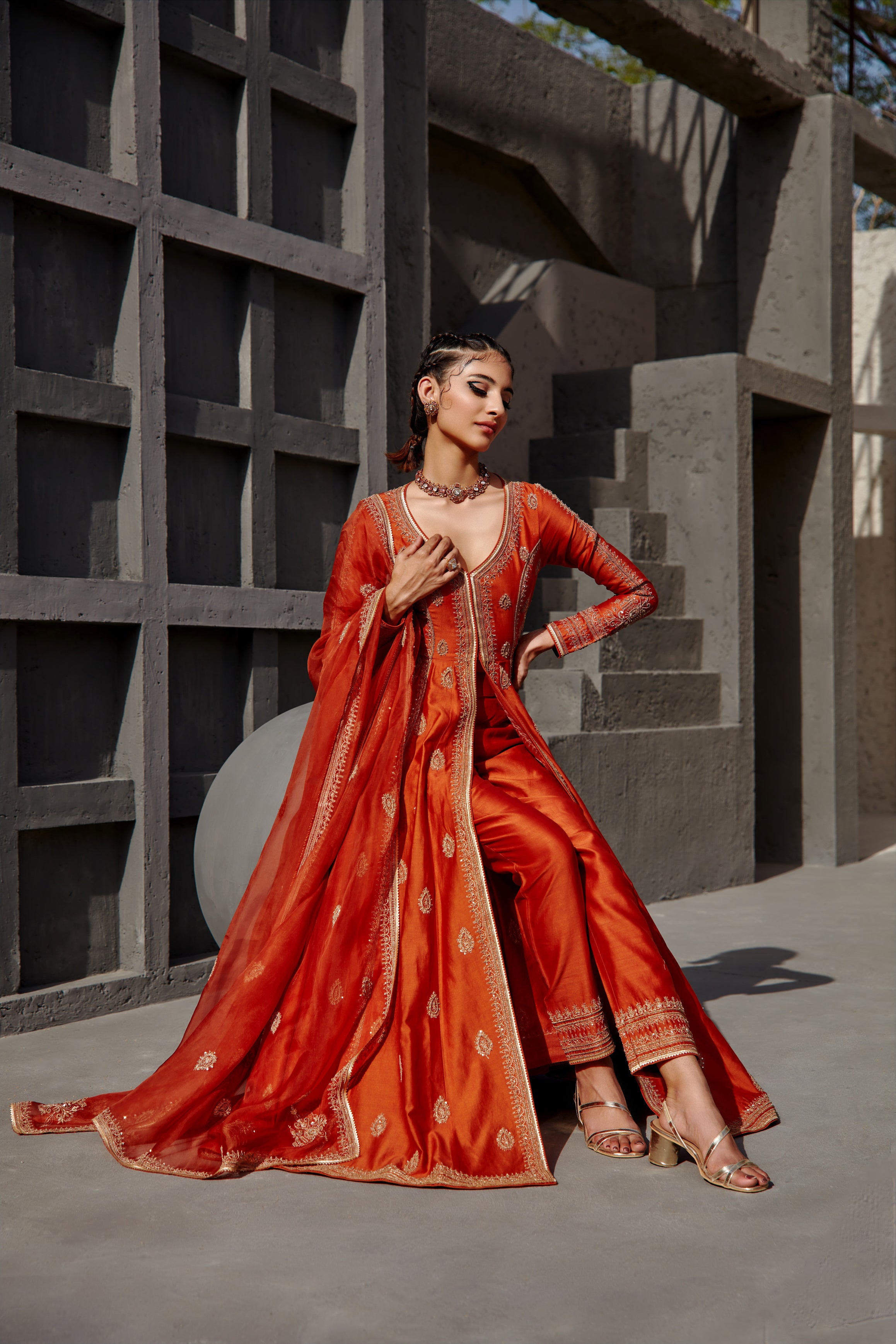 Featuring a burnt orange chanderi jacket pant set paired with an organza base dupatta with gold dori and aari embroidery on it.