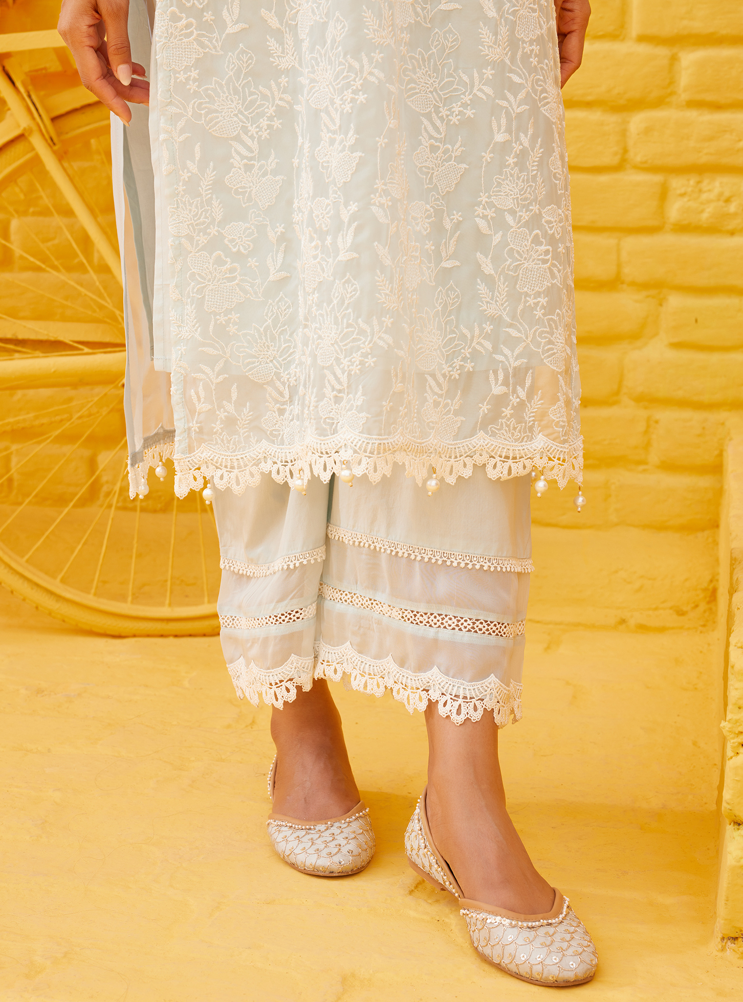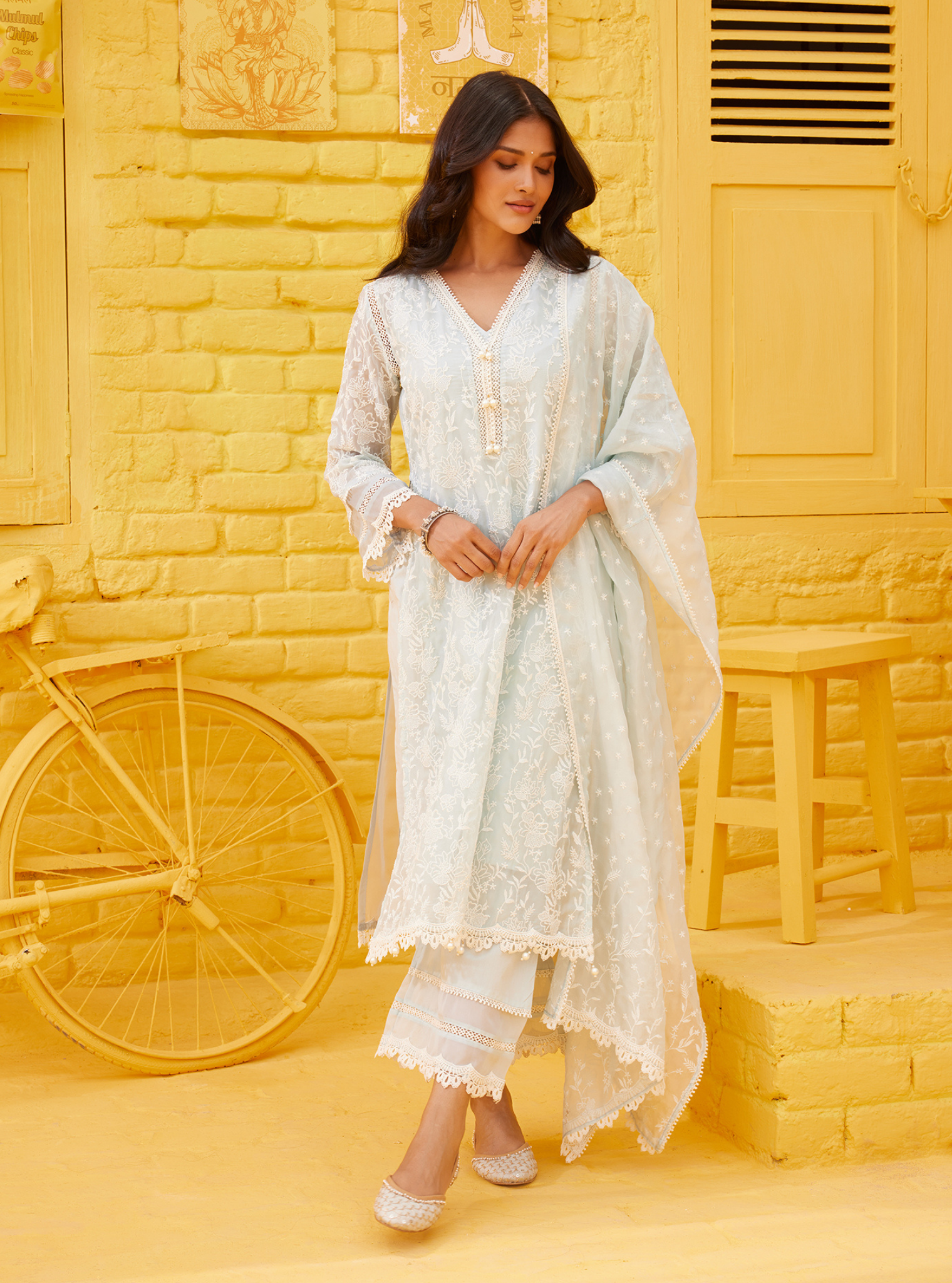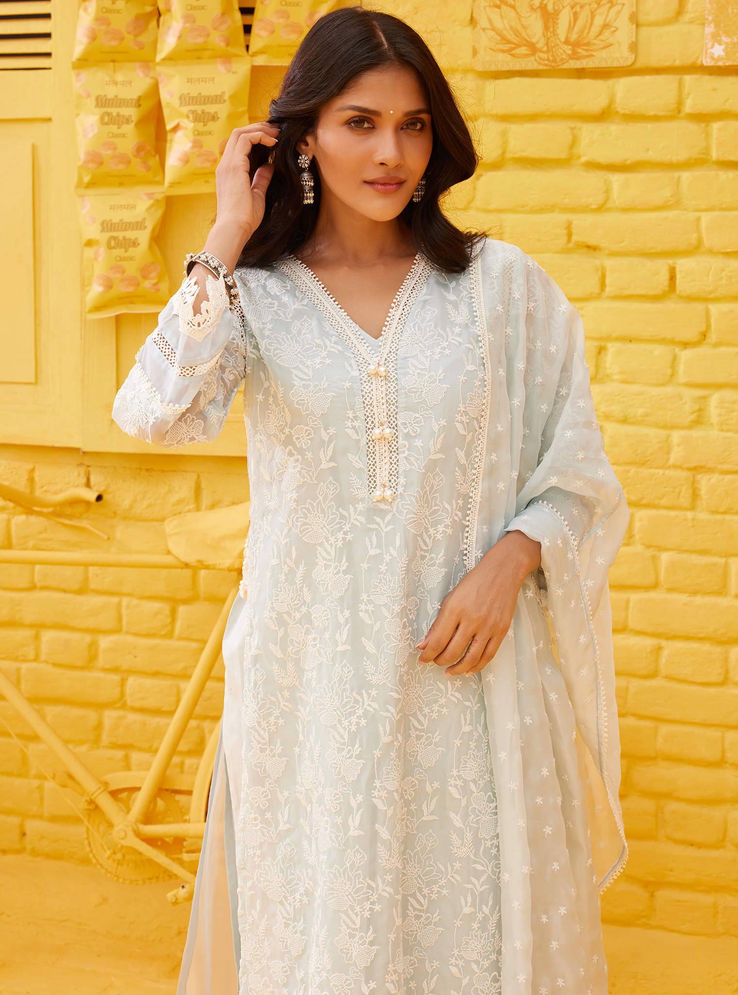 This elegant light blue kurta set is crafted from delicate organza and is adorned with intricate white thread floral embroidery throughout. The kurta features a V-neckline with delicate lace detailing and embroidery that extends along the front panel with a camisole inside it.. The full-length sleeves are embellished with matching embroidery and lace trims at the cuffs. The side slit of the kuta features delicate tassels for an added touch of feminity. The straight-cut pants echo the kurta's design, with lace and embroidered accents at the hem.