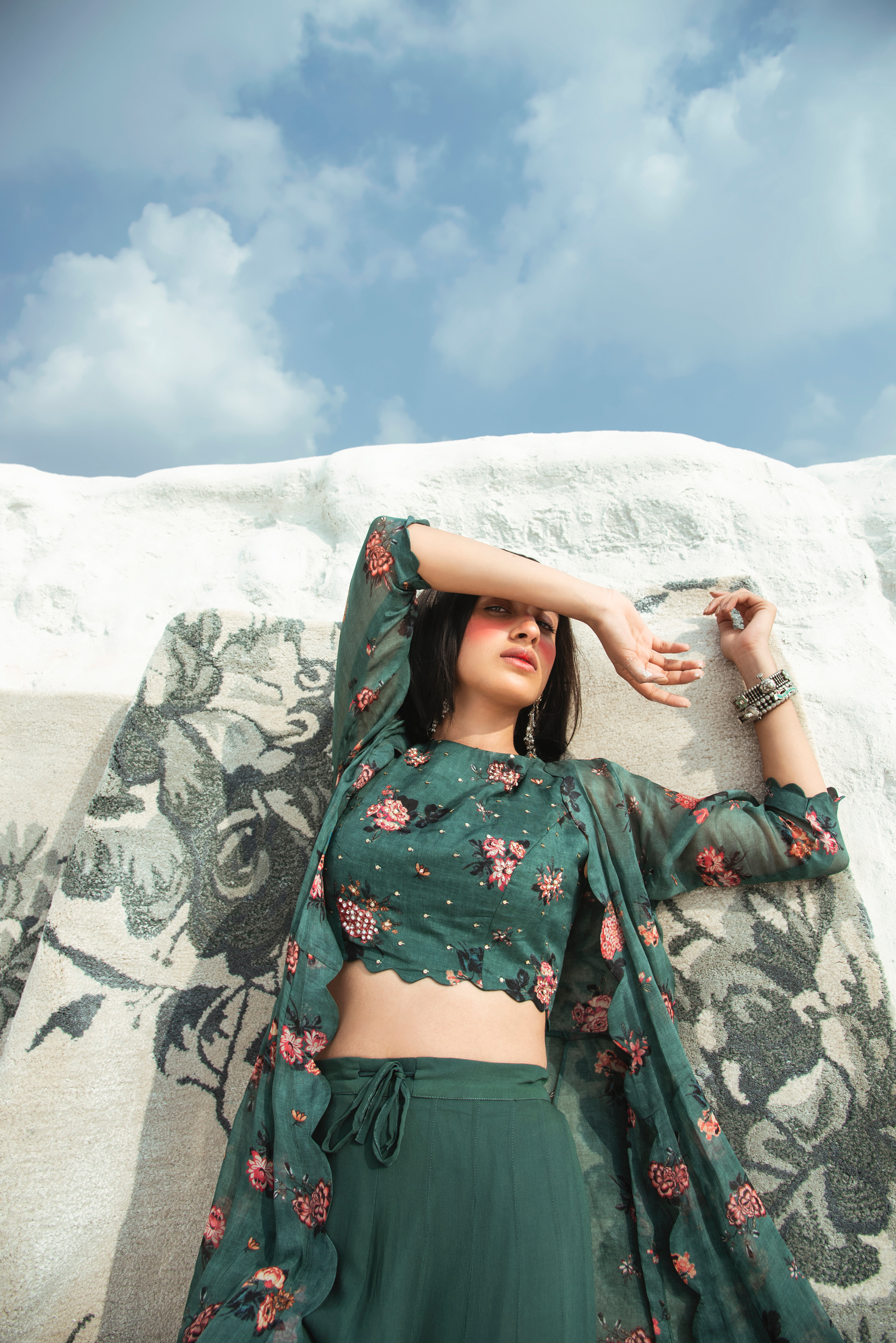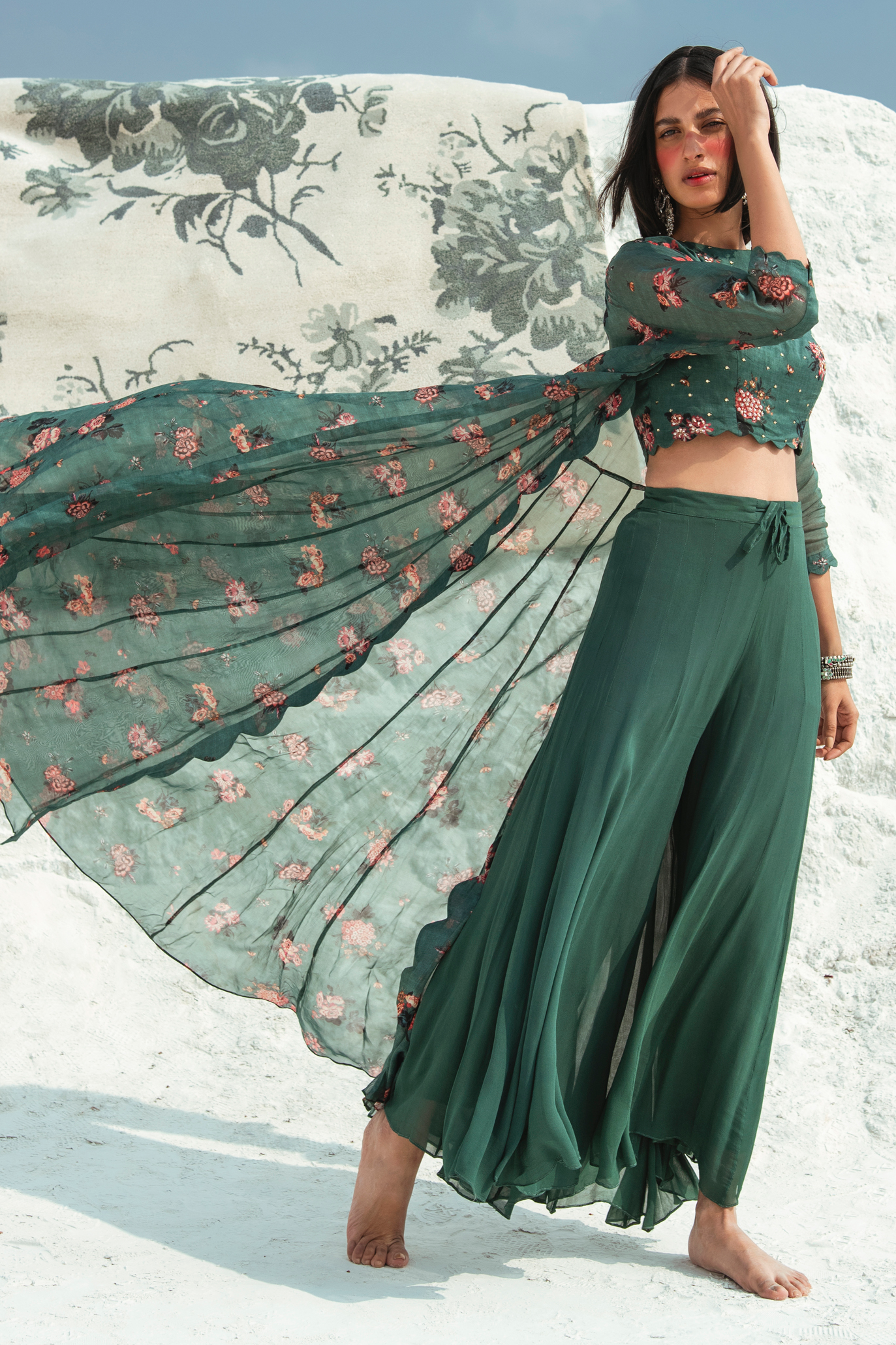 A floral printed jacket paired with floral crop top, highlighted with tikki and moti embroidery, and green georgette pallazos.