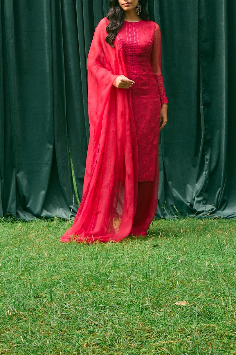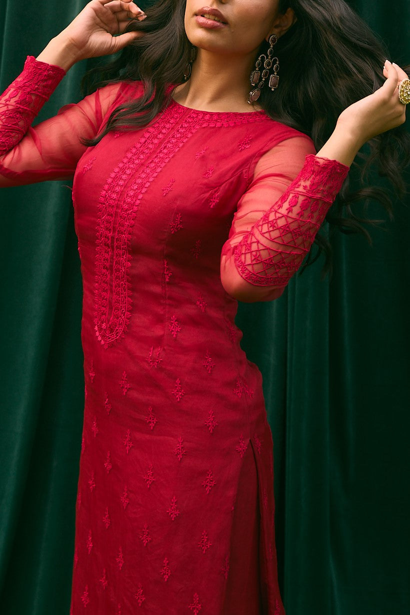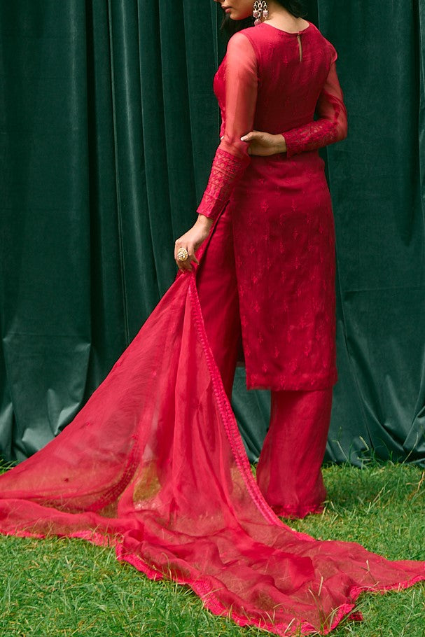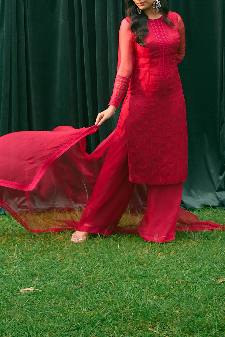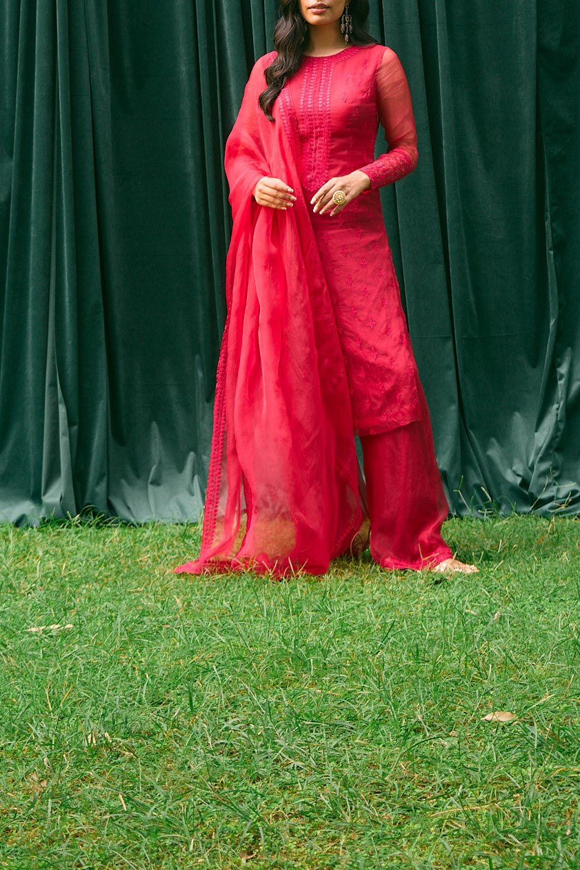 Featuring Caramine Pink Organza Thread work Kurti and Sharara set in Organza Silk set.