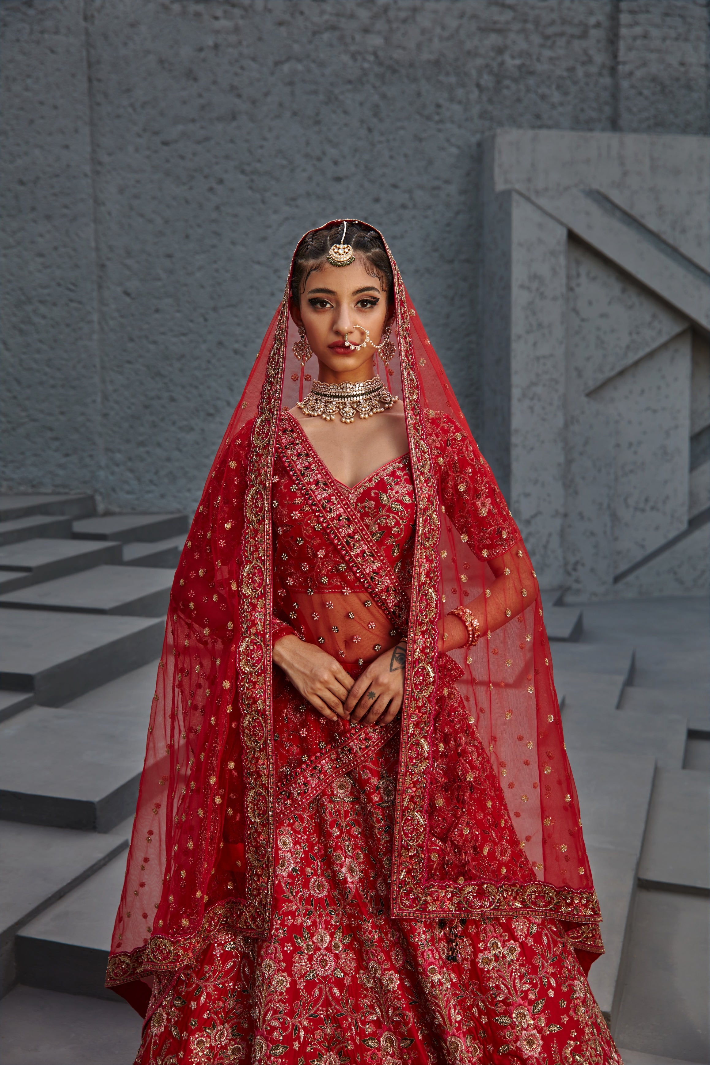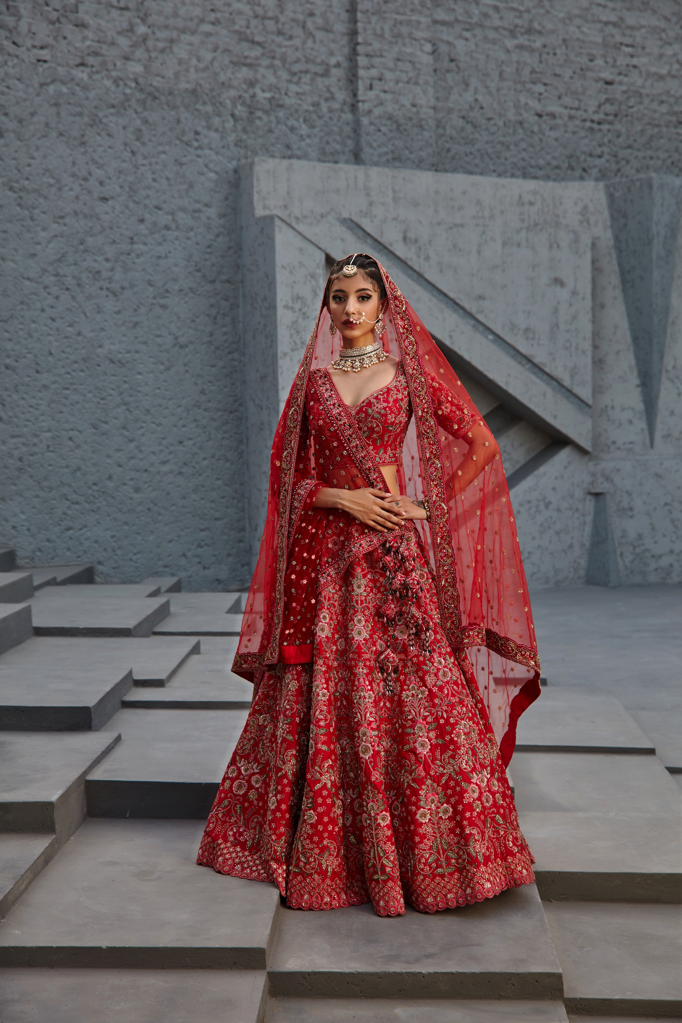 Featuring a red raw silk bridal lehenga set paired with 2 butterfly net base dupattas with multicolor thread, gold zardozi, and aari embroidery on it.
