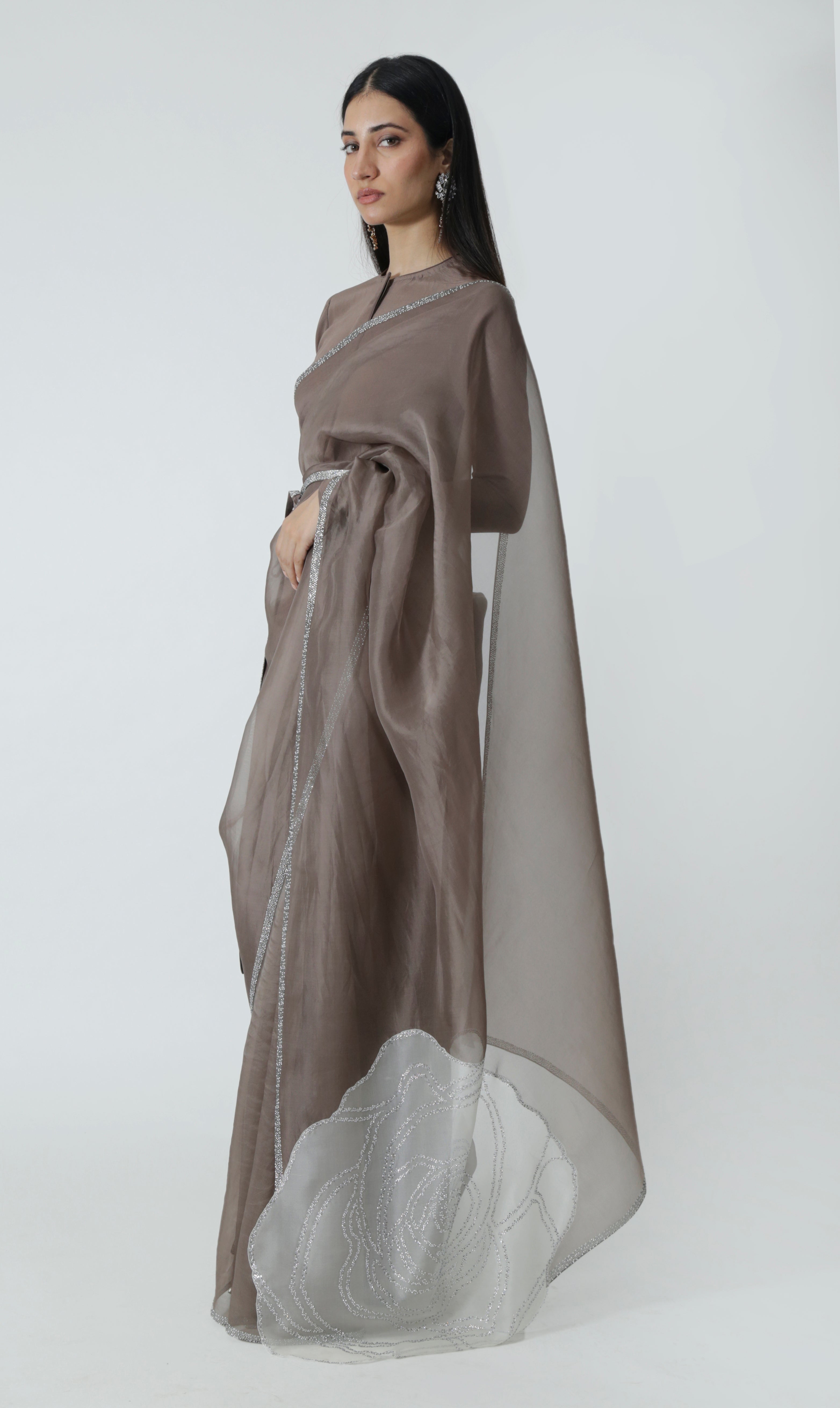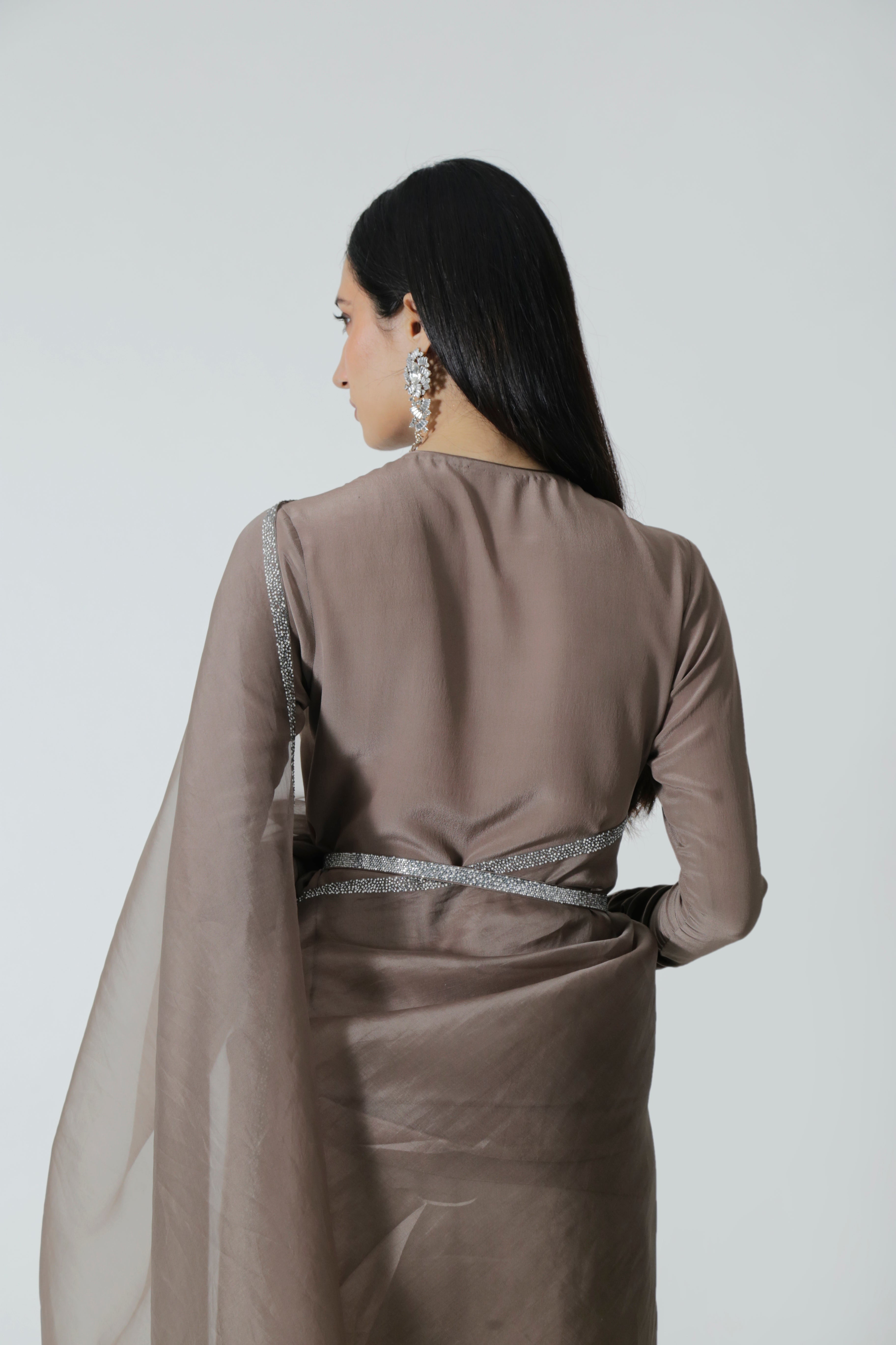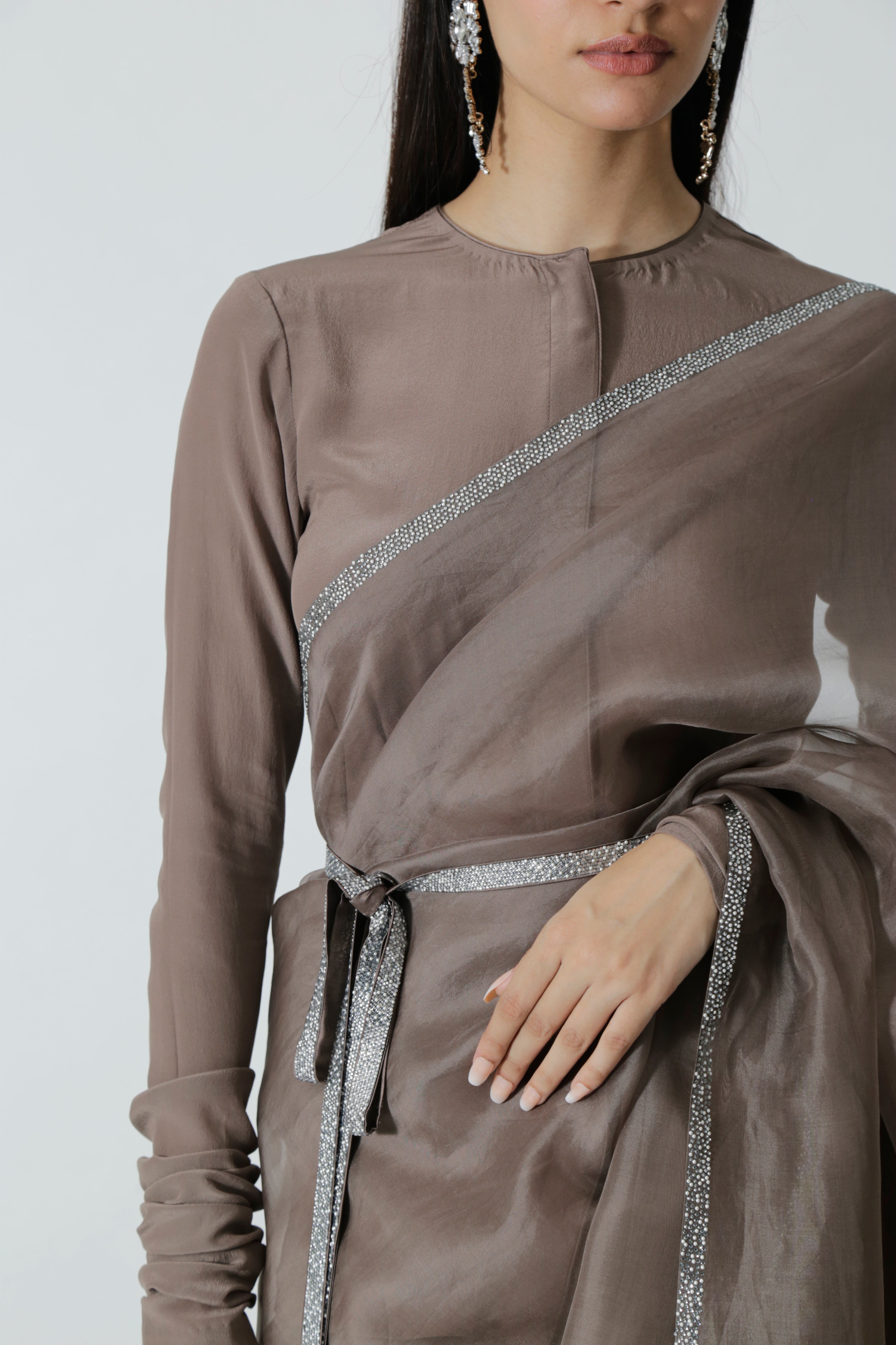 A Cement Brown silk organza saree, accented with an ivory rhinestones embellished applique, paired with long shirt blouse and accentuated with rhinestones encrusted belt.