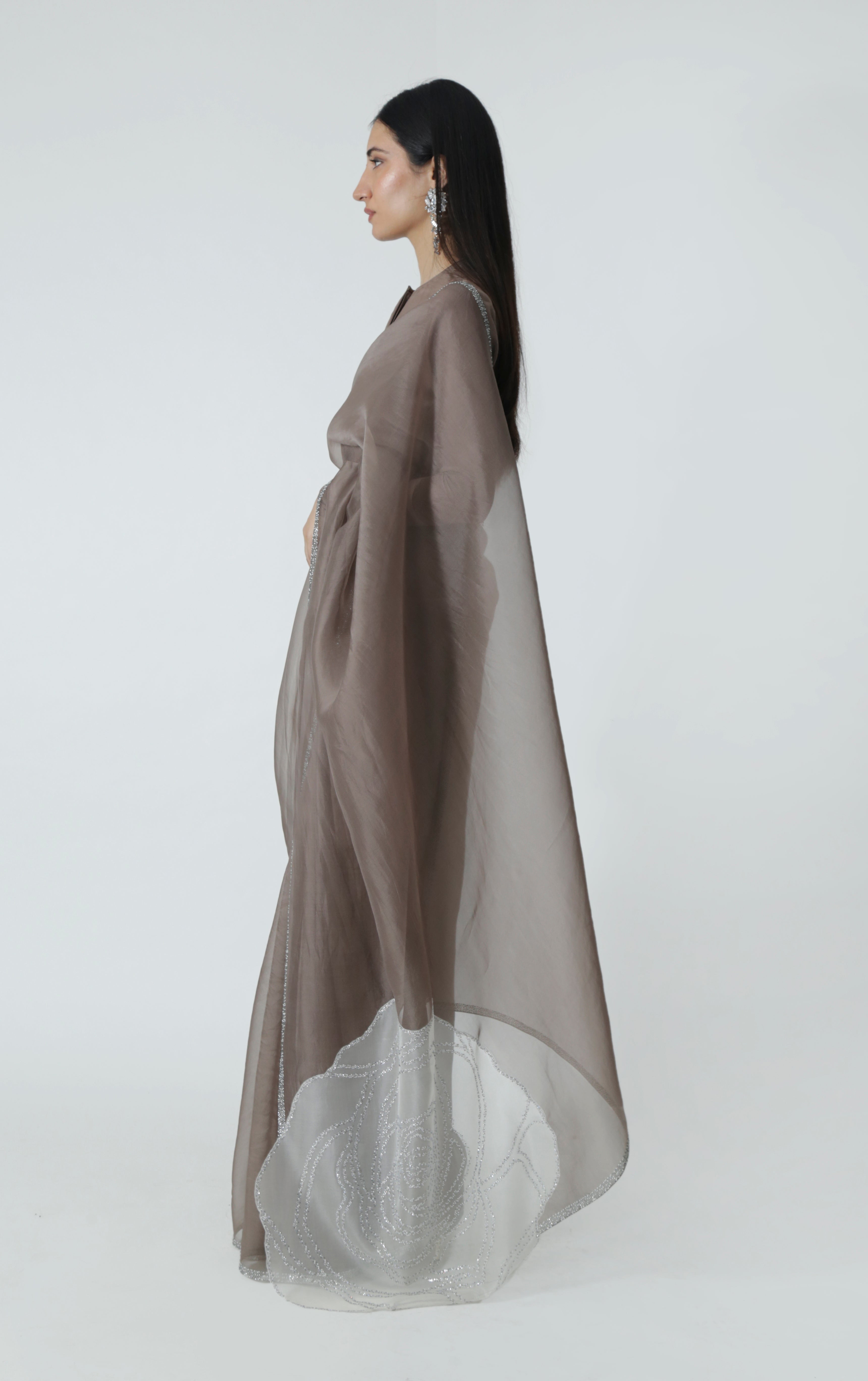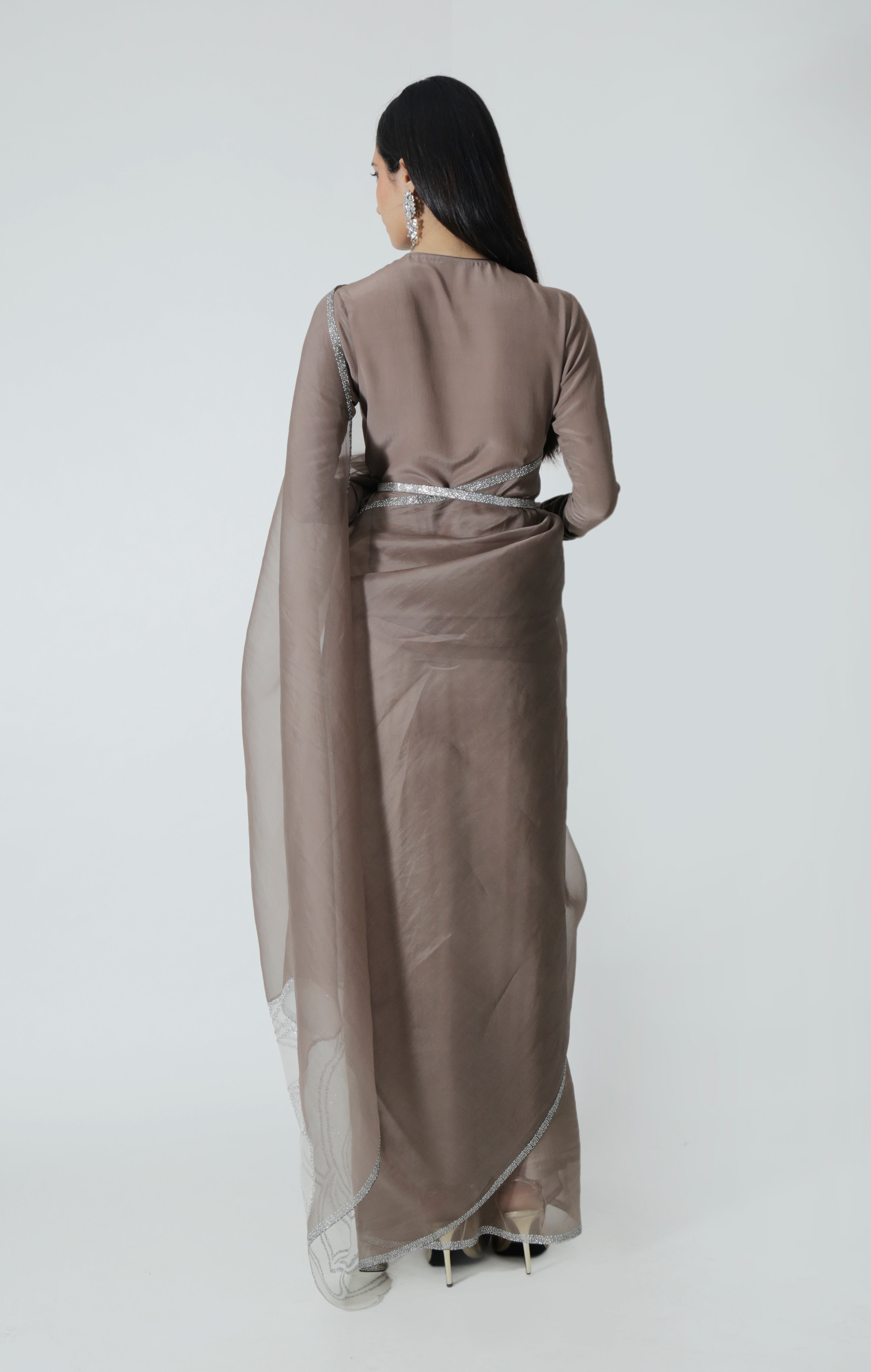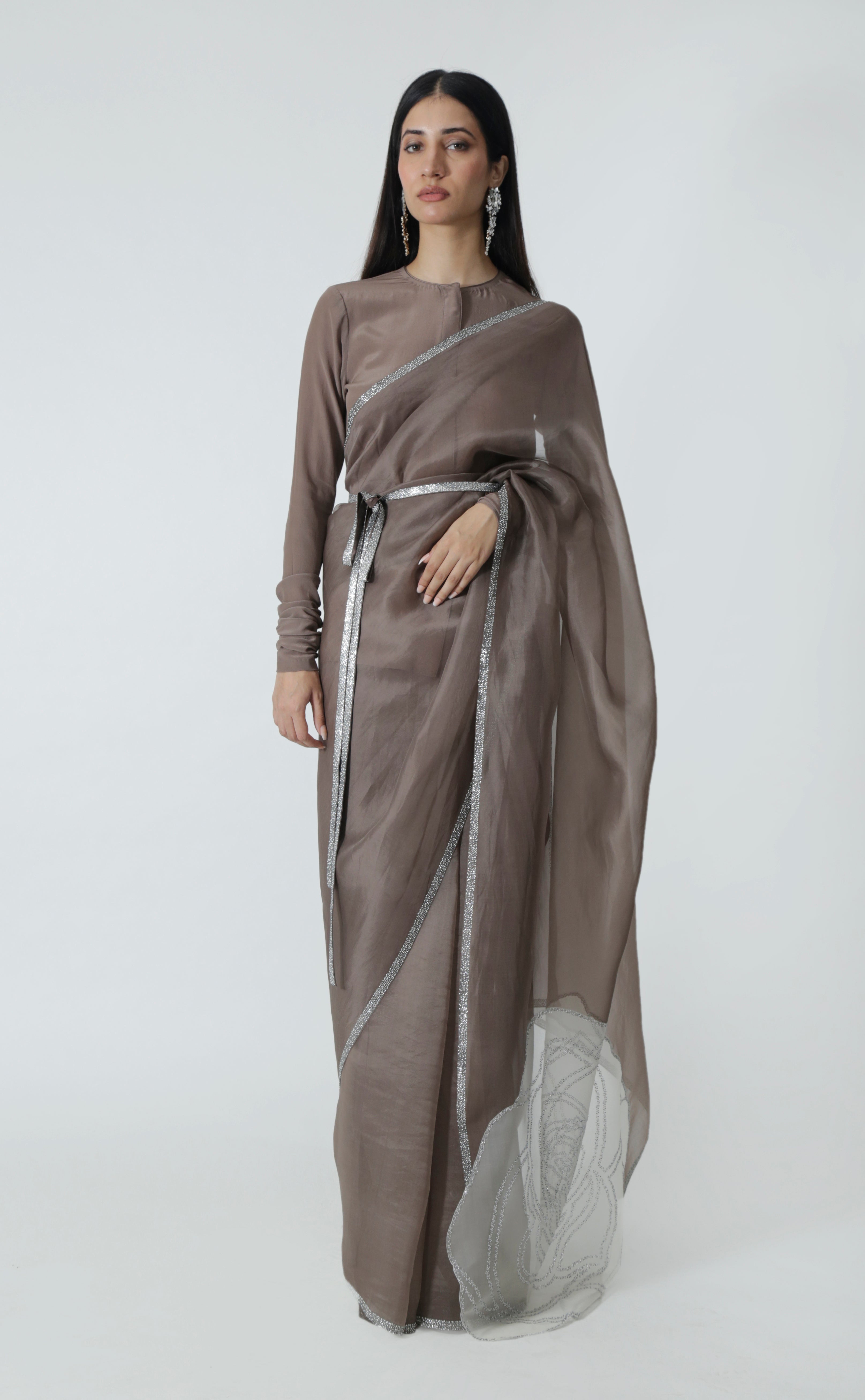 A Cement Brown silk organza saree, accented with an ivory rhinestones embellished applique, paired with long shirt blouse and accentuated with rhinestones encrusted belt.