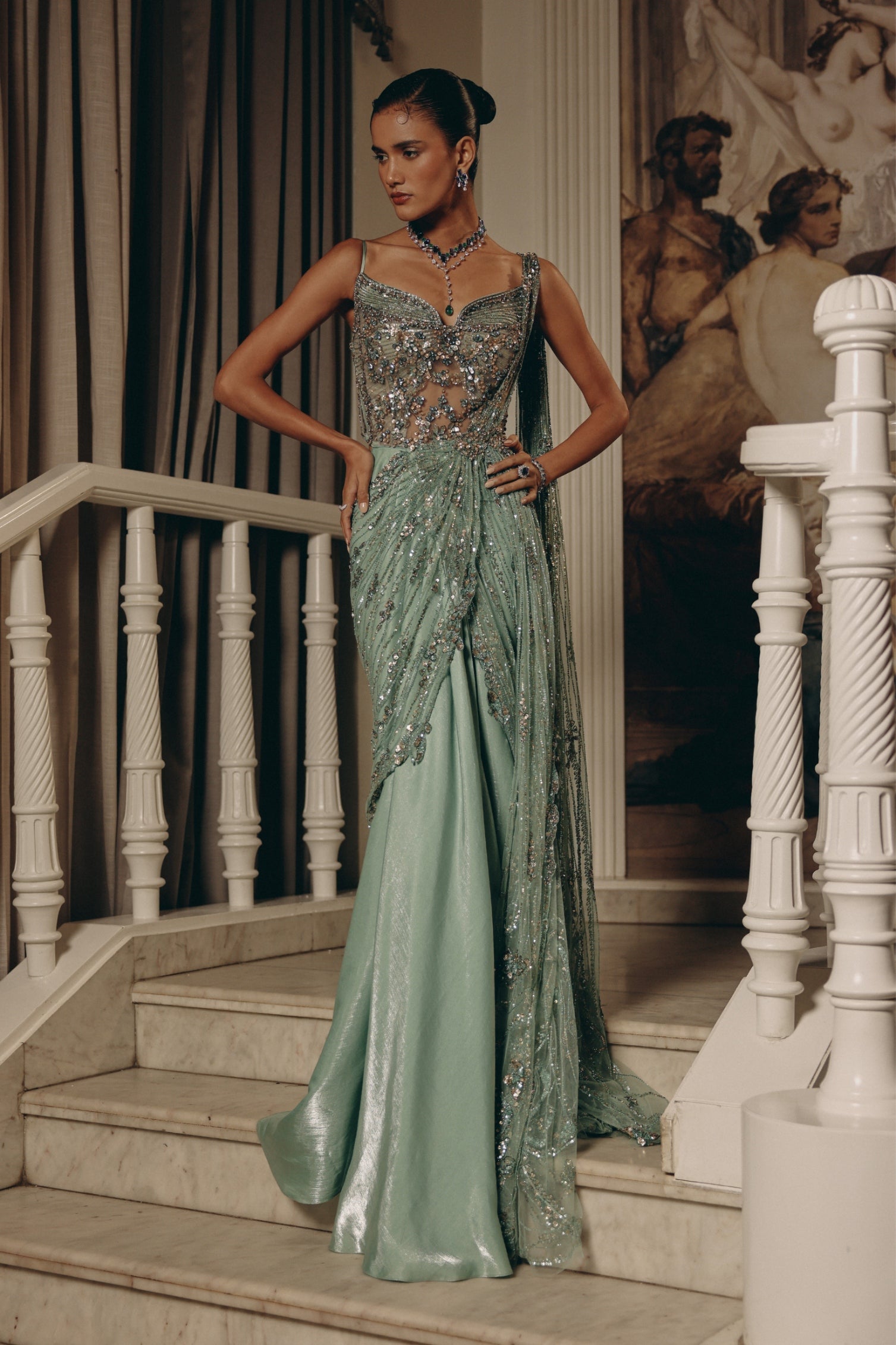 This enchanting draped ensemble blends the timeless grace of a saree with the fluidity of modern couture. The sheer corset- style bodice is adorned with delicate hand embroidery, sequins, and crystals, creating a luminous play of light and texture.
