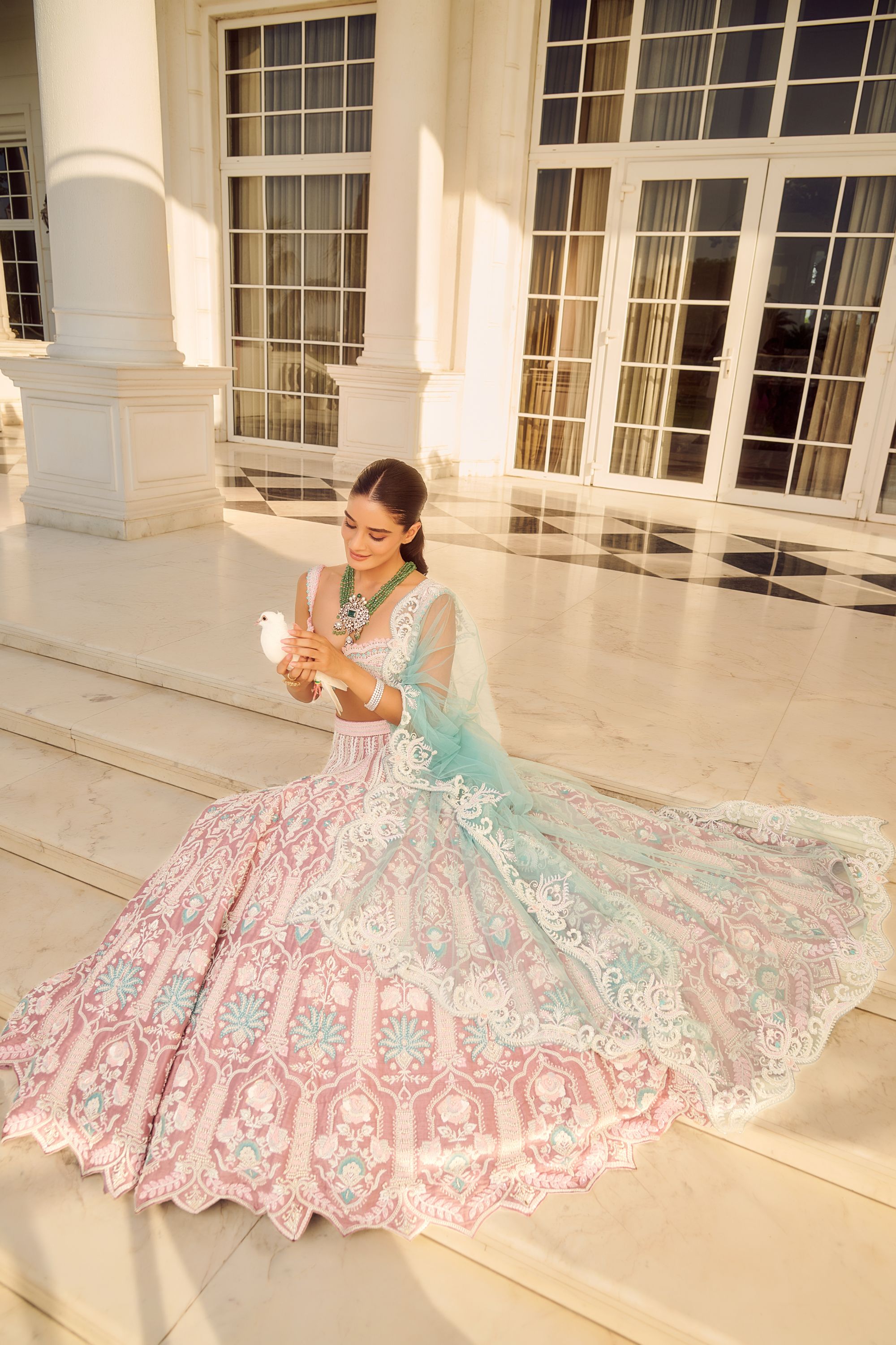 The Celine Lehenga is a mesmerizing blend of intricate detail and elegance. The dusty light purple skirt exudes a soft, romantic allure, while the multi-colored blouse adds a vibrant twist, balancing tradition with modern charm. Intricate embroidery adorns the entire lehenga, creating a look that’s both sophisticated and eye-catching. This ensemble is ideal for brides or wedding guests seeking a unique, artful piece that speaks to their individual style.
