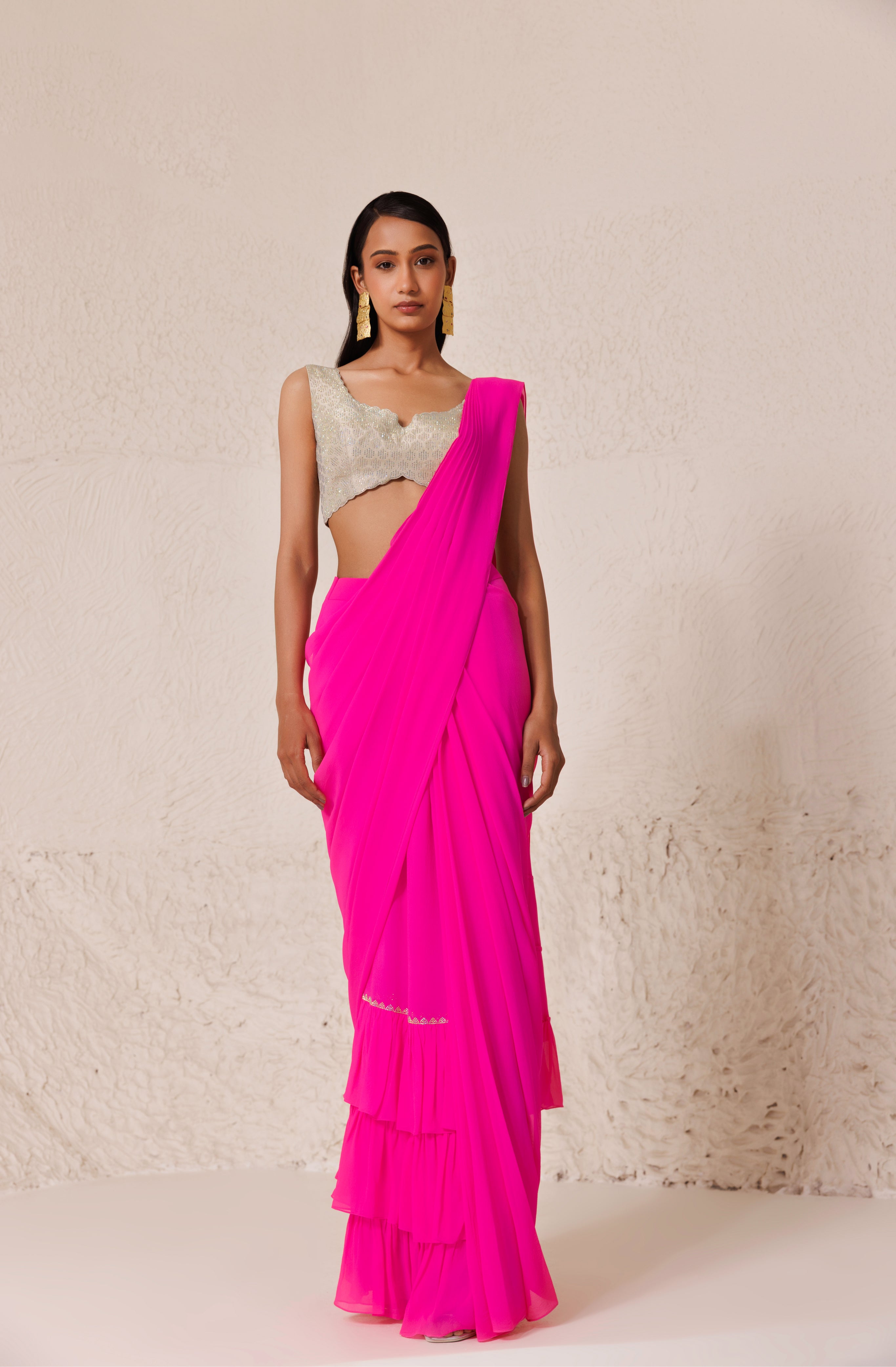 A Neon Pink draped saree, exquisitely adorned with rhinestone embellishments that radiate glamour and complementing this is a Silver Tissue blouse, embellished with rhinestones, creating a stunning look.
