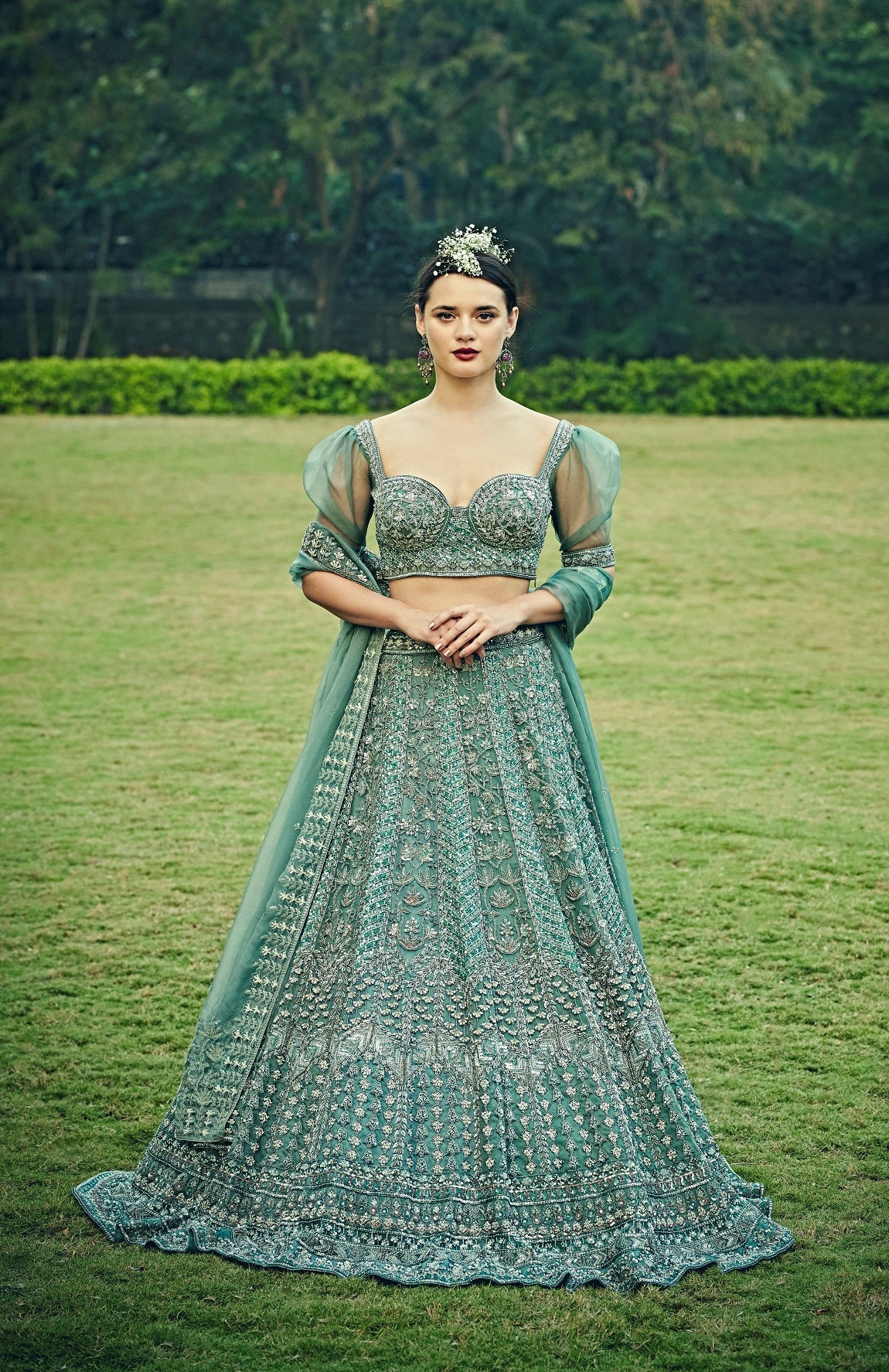 Lady eugenia belousora in the right, draped in cerulean coloured heavily sequined statement blouse with a organza puffed sleeves with a matching organza bead and crystal work on the lehenga creating a glamorous yet subtle look .