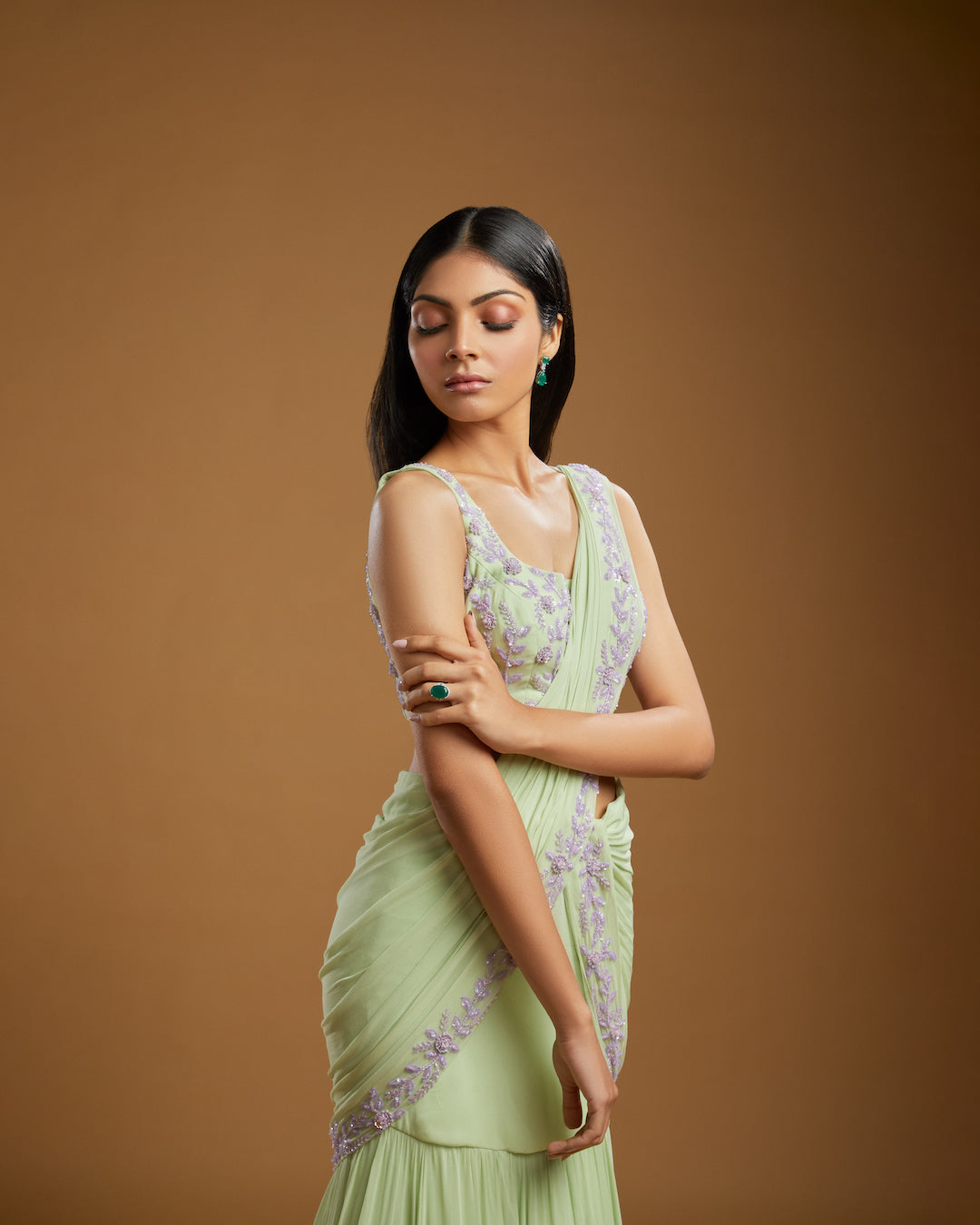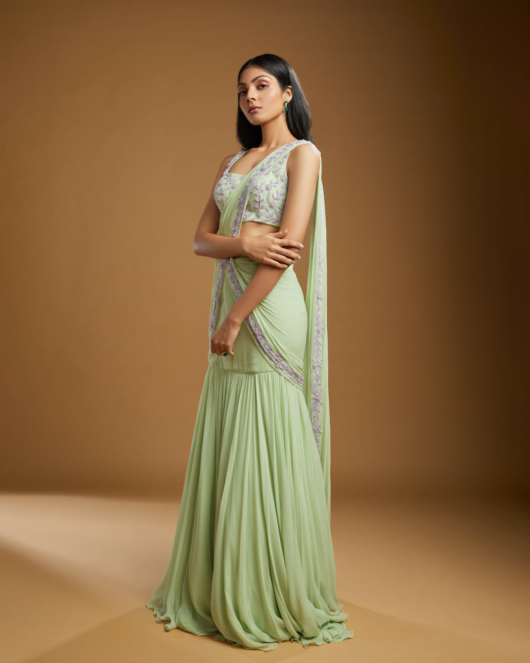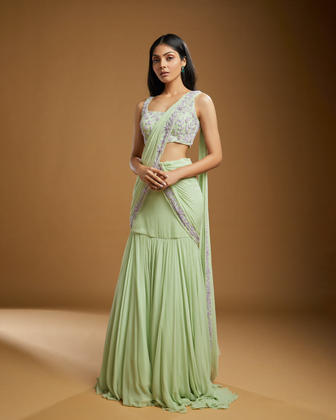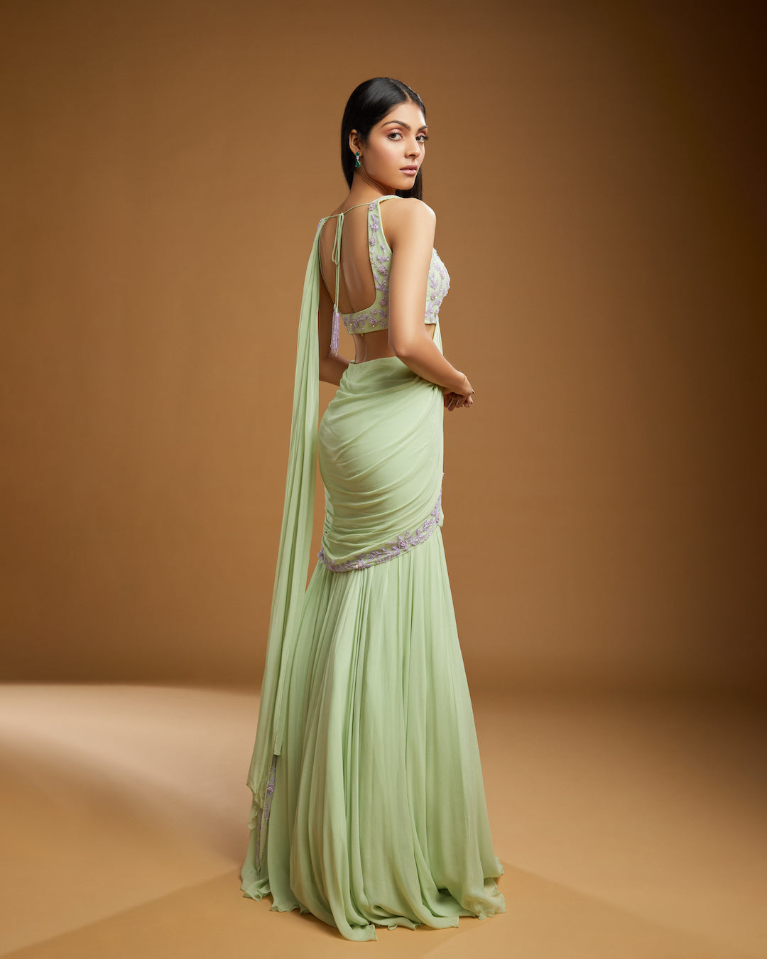 Cetra is our seafoam green gathered fishtail skirt with attached pre draped contrast embroidered pallu, paired with a matching embellished blouse with glass beads & sequins over a georgette base.