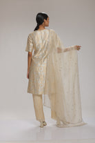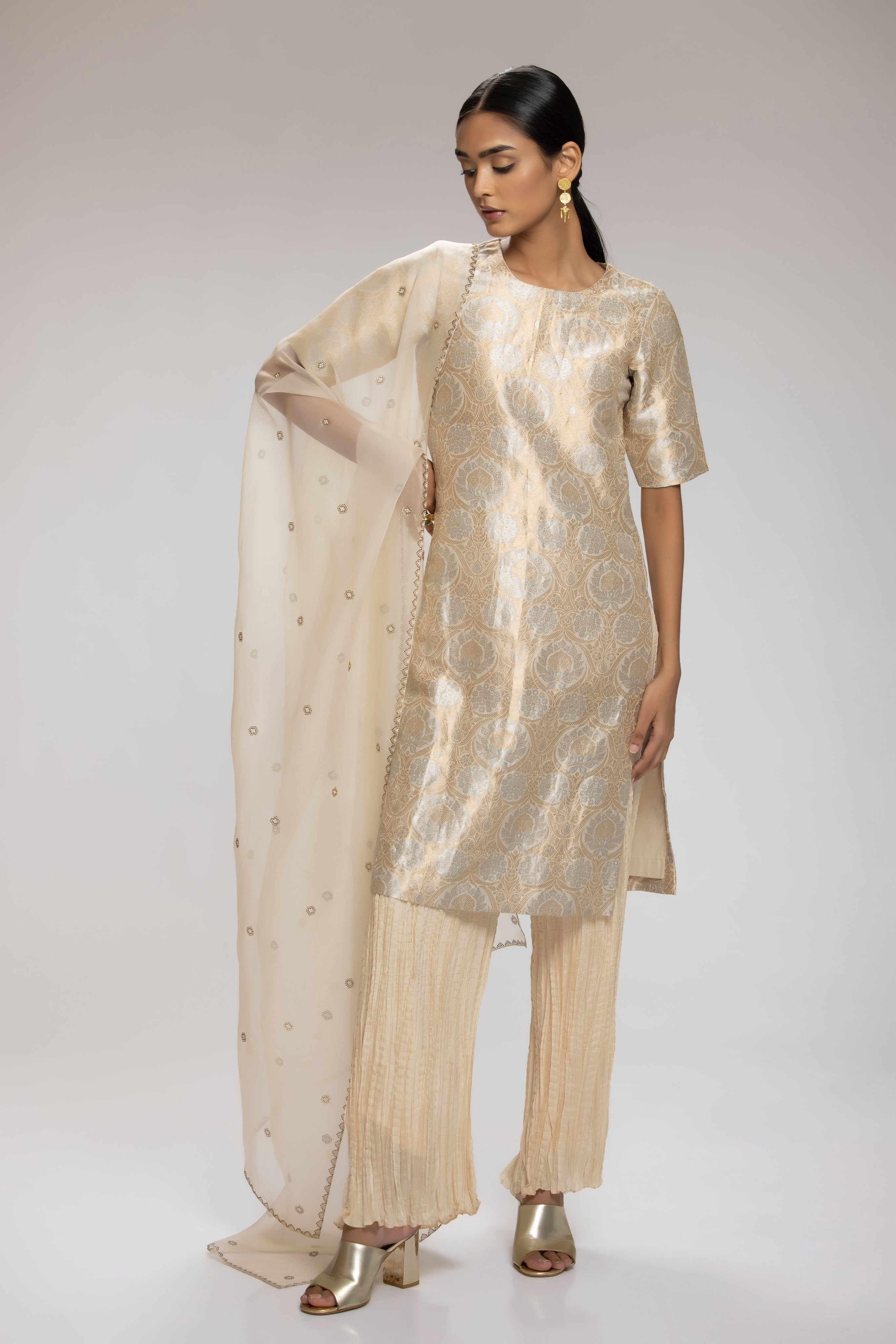 A Cream Banarsi Brocade kurta set with crinkled Habutai Silk pants. Completing the look is an ethereal organza dupatta, adorned with shimmering rhinestones for a touch of elegance.