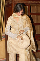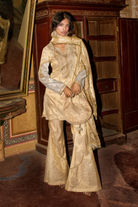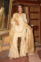 In a Champagne gold glow, this pure tissue straight pant set exudes understated elegance, featuring intricate detailing and rich gota patti textures. Paired with a finely embroidered short kurta and a vibrant monicromatic dupatta adorned with delicate threadwork, shimmering dori, and subtle sequins, the ensemble reflects a refined blend of tradition and modern grace.