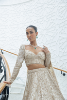 Champagne Organza Lehenga And Corset With A Net Dupatta Embroidered In Light Gold Beads, Sequins And Crystals.
