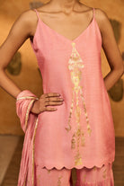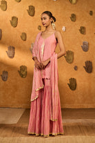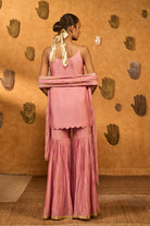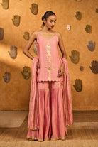 Details: This champagne pink sharara set is crafted in rich raw silk, featuring delicate Sona chandi foil work across the flared sharara and scalloped hem kurta. The kurta’s strappy neckline adds a soft, modern femininity, while intricate foil-printed motifs bring traditional charm to the contemporary silhouette. It is paired with a sheer organza dupatta, beautifully finished in a soft gold-to-silver ombré foil effect, adding a subtle shimmer and elevating the ensemble’s festive elegance.