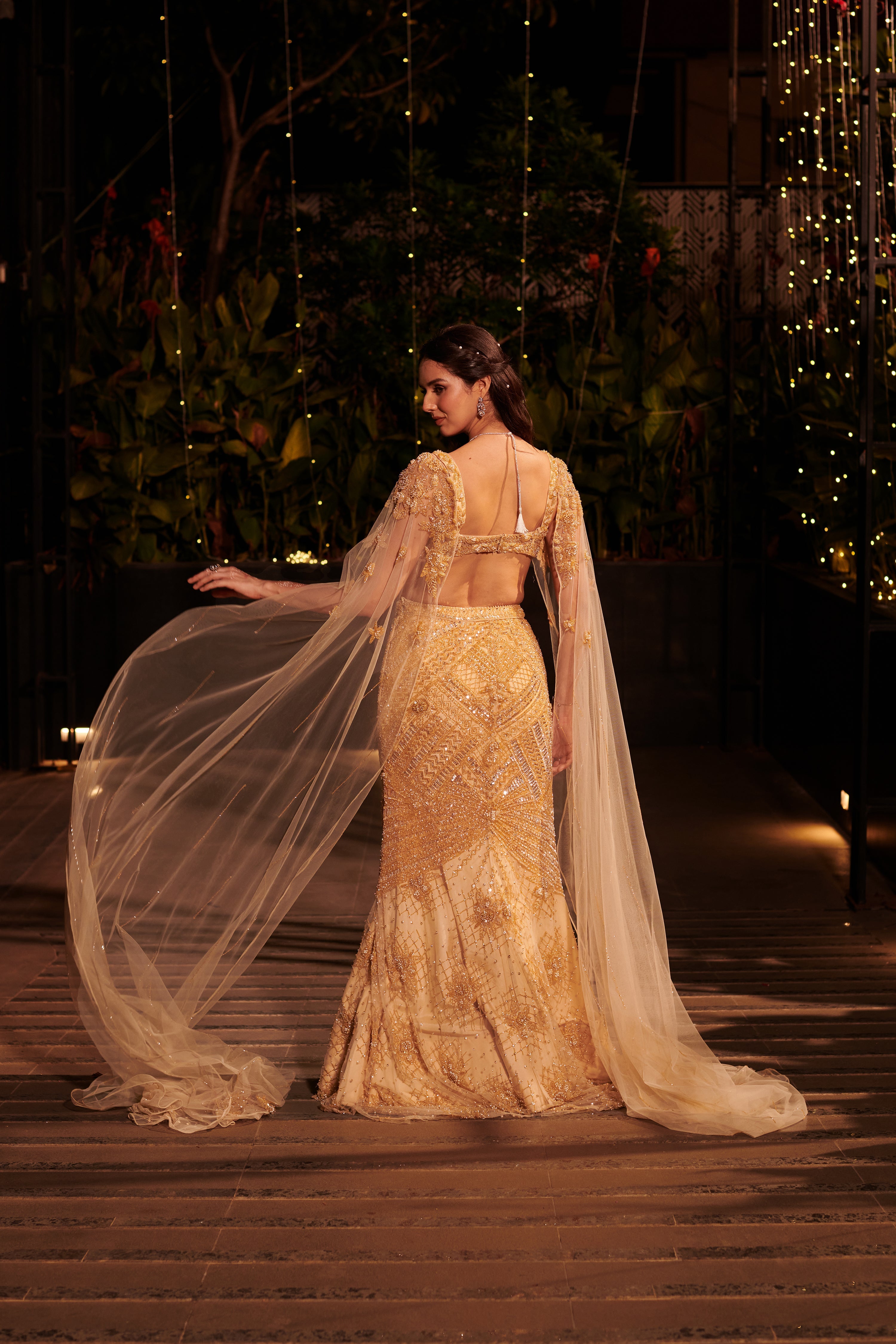 Champagne Gold lehenga set is a breathtaking blend of modern elegance and timeless sophistication. The mermaid-style lehenga is meticulously crafted to hug the curves and flare out at the bottom, creating a stunning silhouette. The entire outfit is adorned with intricate embroidery in the same champagne gold hue, lending a subtle yet luxurious touch. The modern corset blouse, a combination of net and Habutai silk, features a chic, structured design that enhances the overall look. A detachable cape trail elegantly drapes over the shoulders, adding an element of drama and grace. Perfect for brides or special occasions, this outfit offers a unique fusion of contemporary design and classic charm