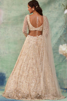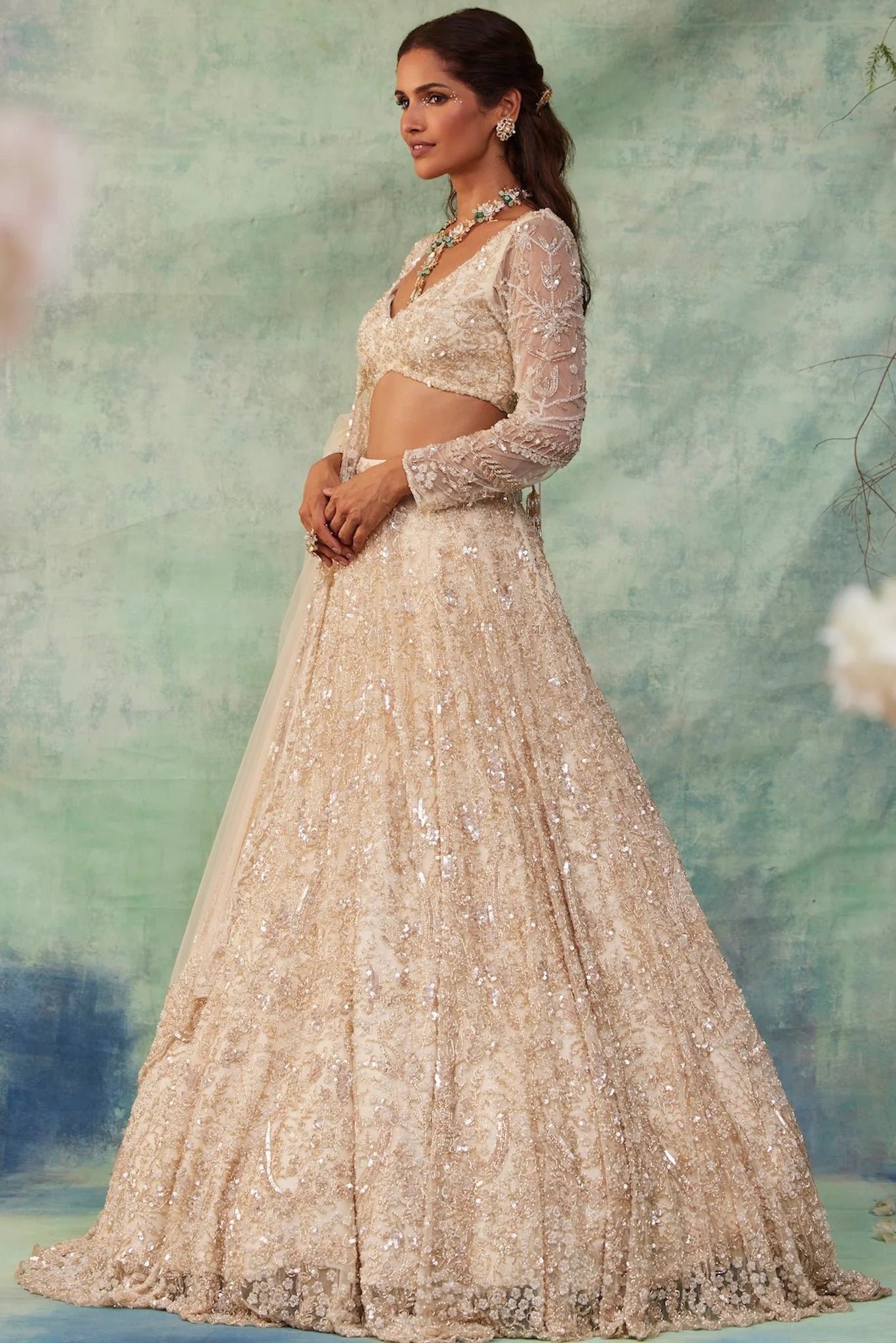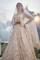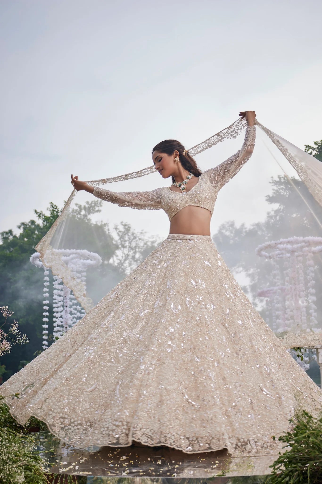 Featuring Surabhi Chopra's ivory bridal lehenga, meticulously hand-embroidered on tulle fabric with glass beads, sequin and cutdana work. Paired with a cutdana and sequin detailed matching tulle dupatta with embroidery on all four sides.