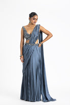 Charcoal Grey Satin Draped Saree With A Pleated Skirt And Silver Mirrorwork Embroidery On The Blouse And Pallu.
