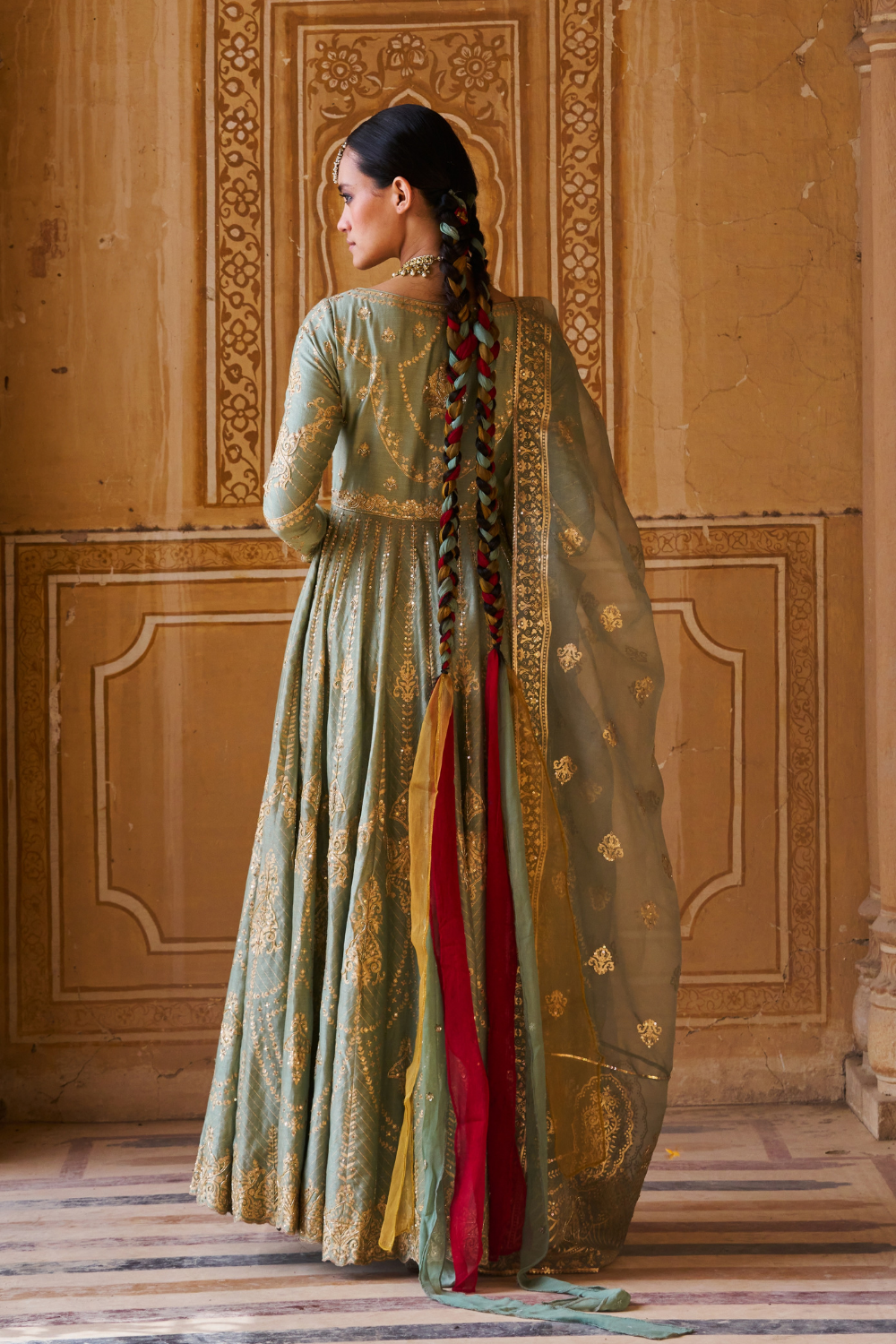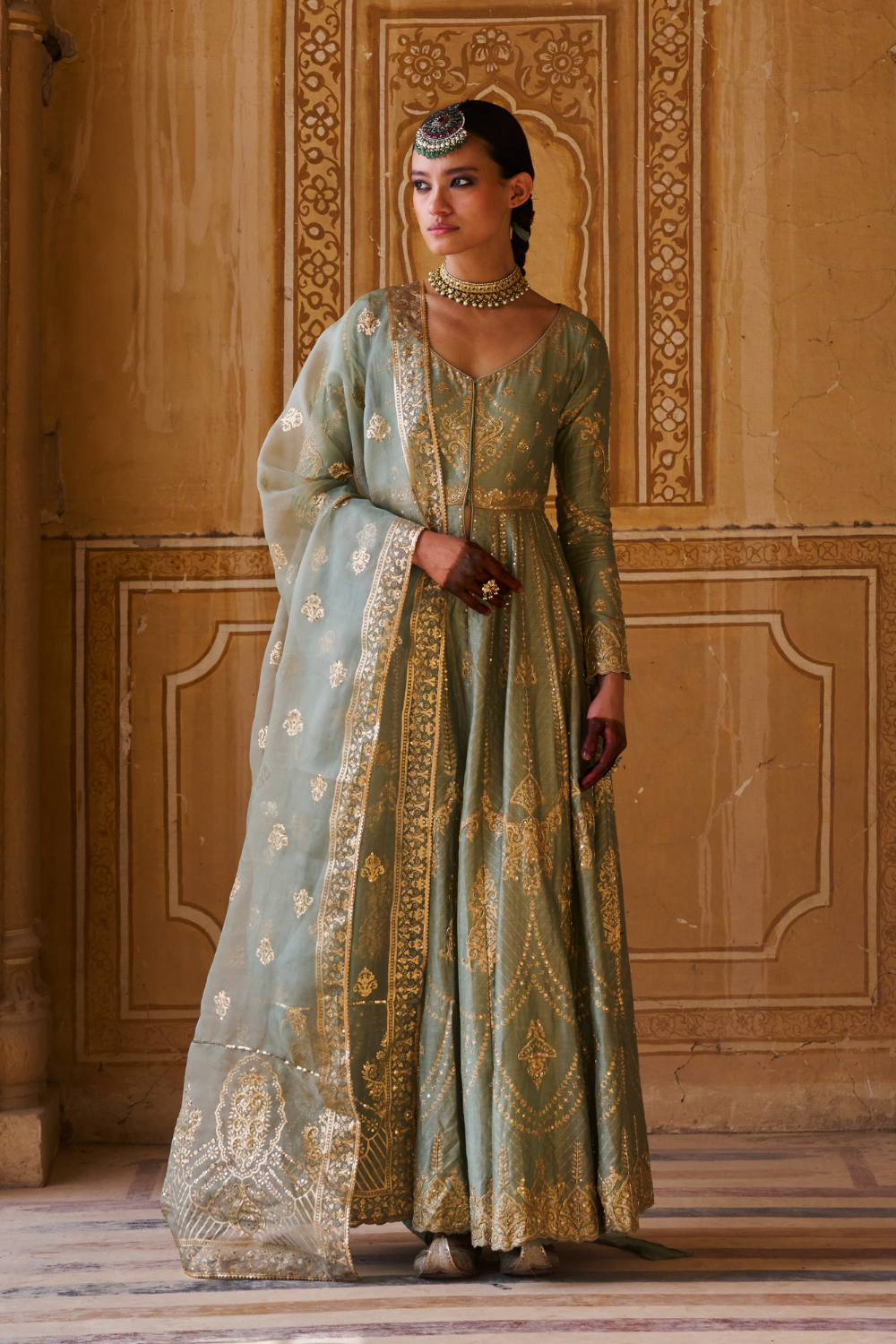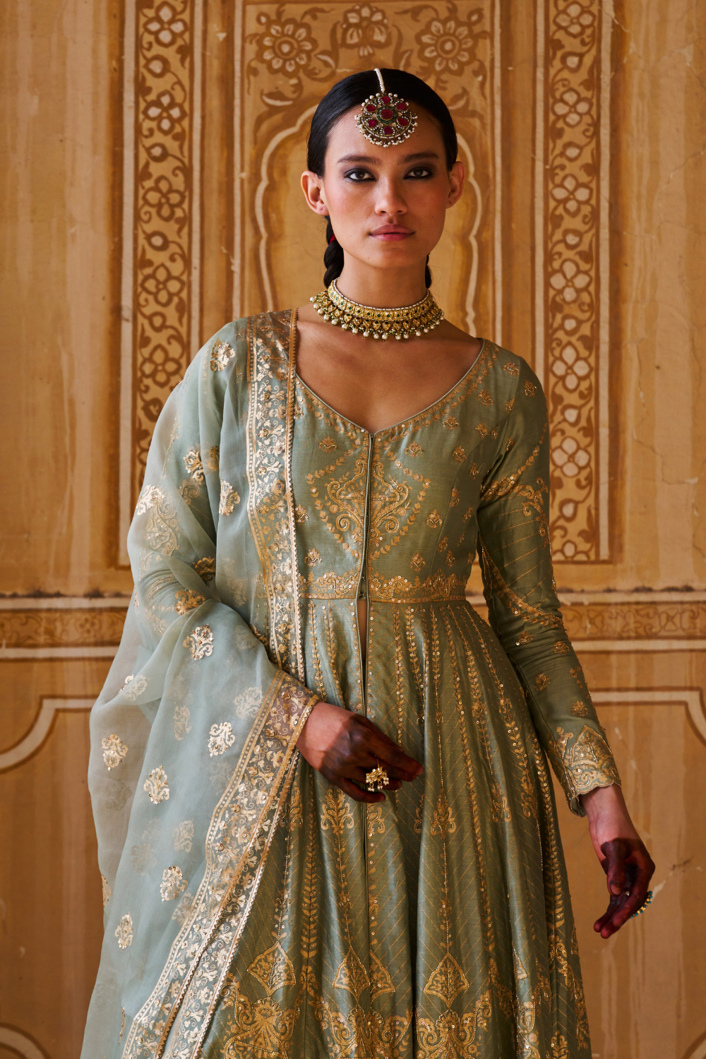 Featuring a sage green chanderi silk jacket set paired with an organza base dupatta with antique gold dori and embellished hand embroidery.