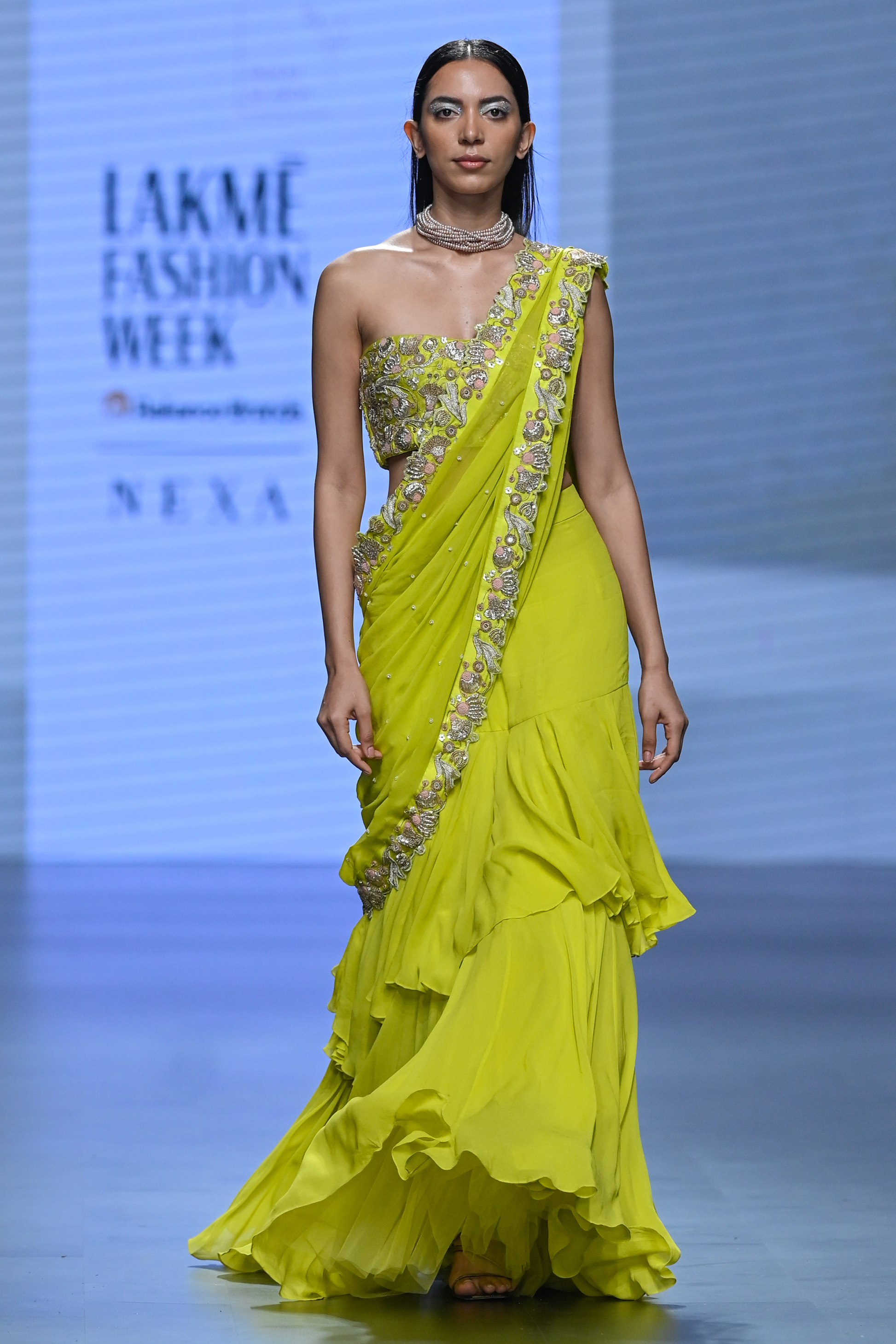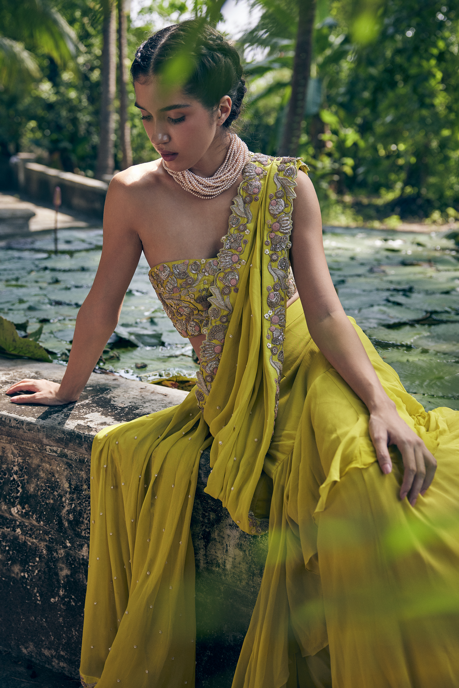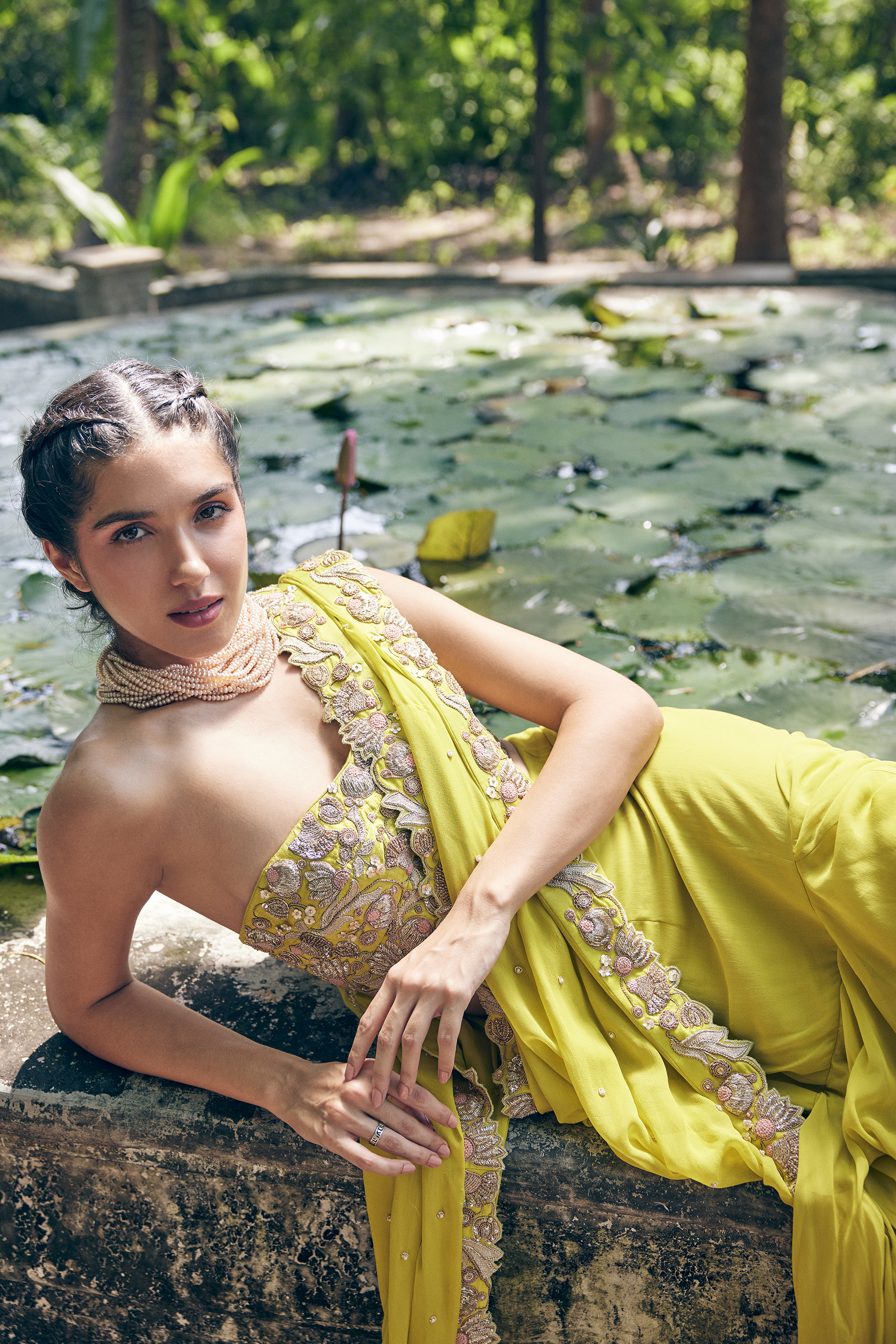A lime yellow pre–draped saree with hand embroidered borders on the pallu. It is paired with our signature hand embroidered floral jaal corset blouse.