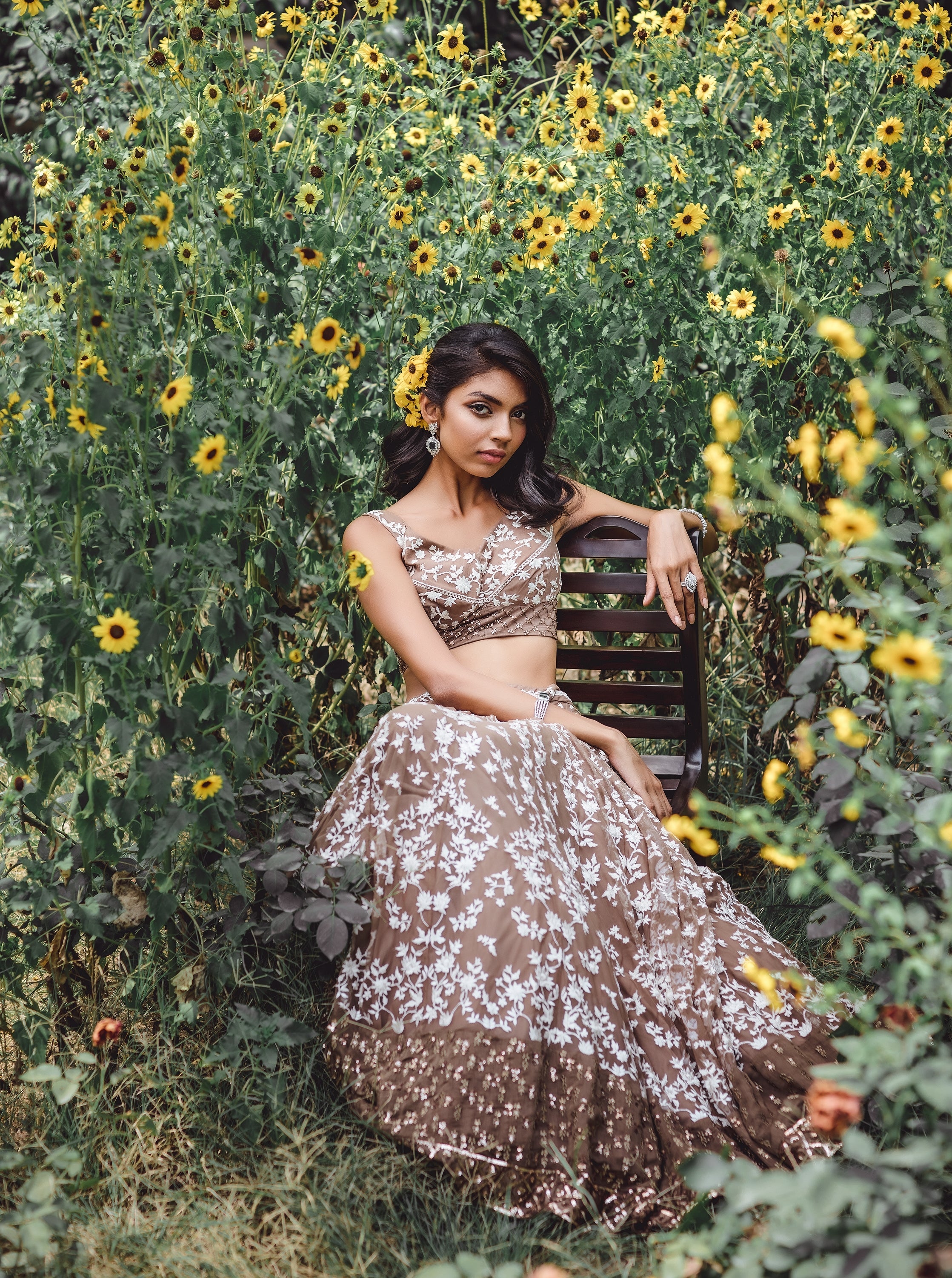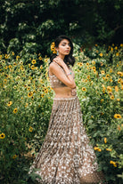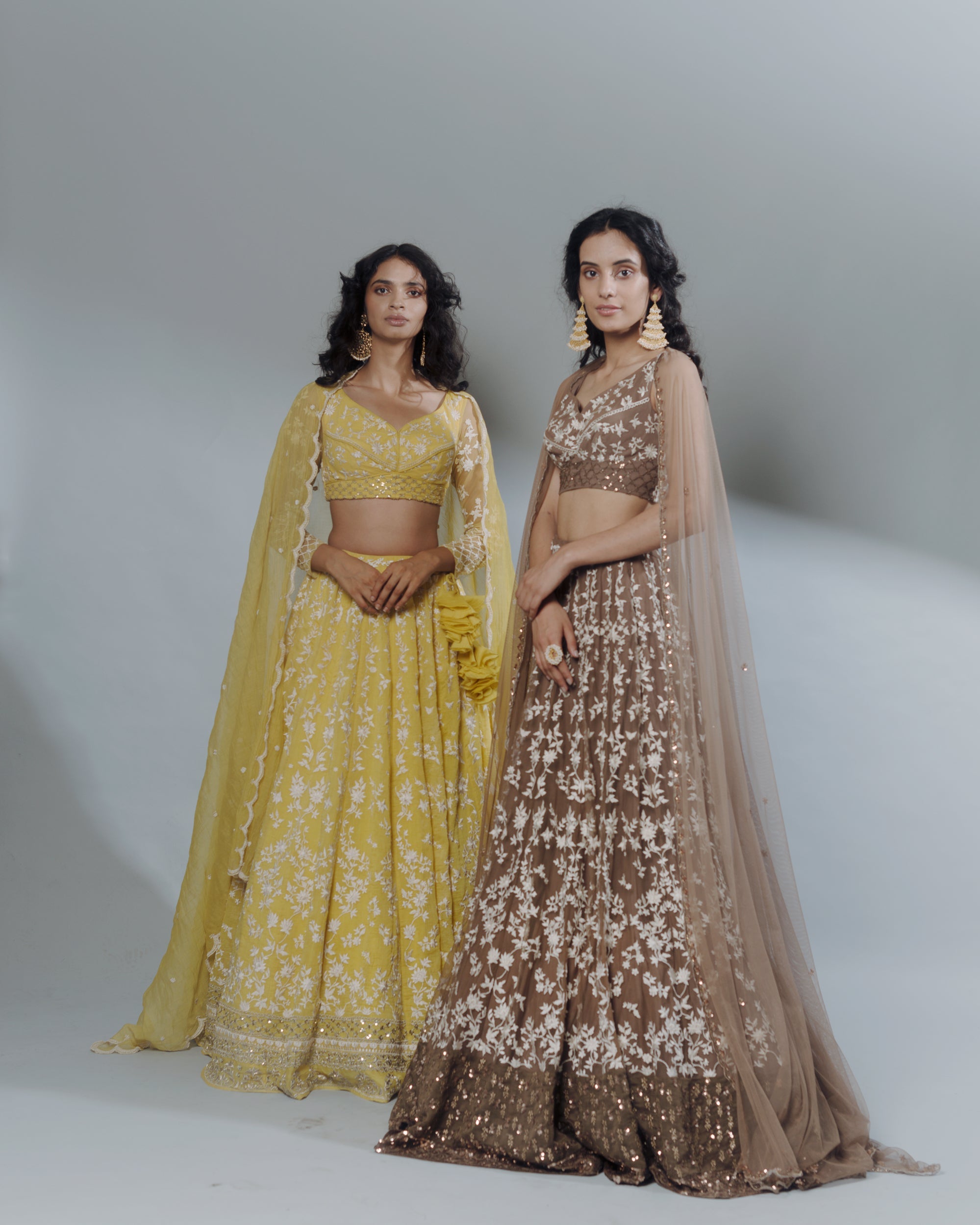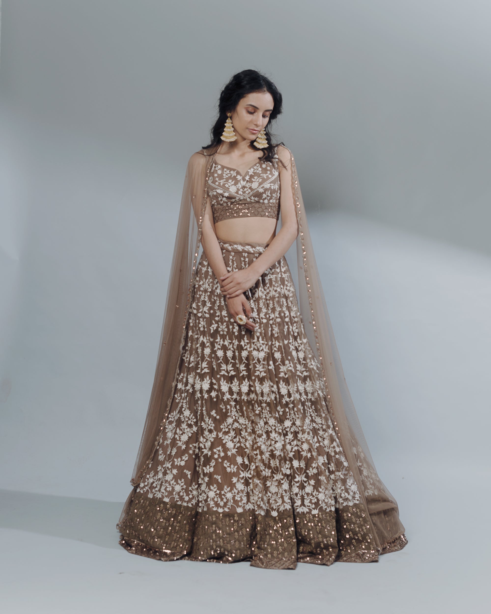 Featuring a COFFEE THREADWORK LEHENGA SET IN NET.