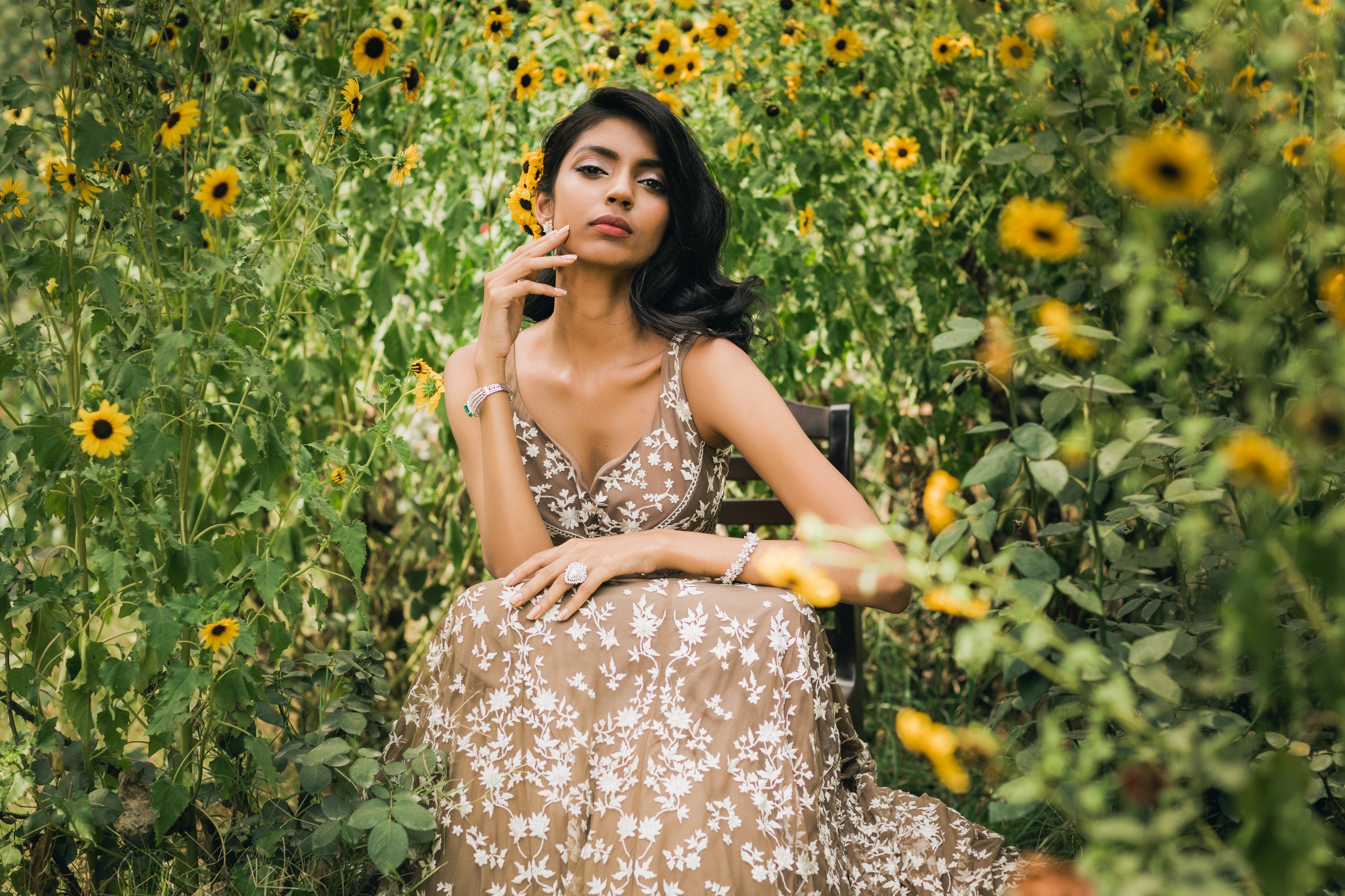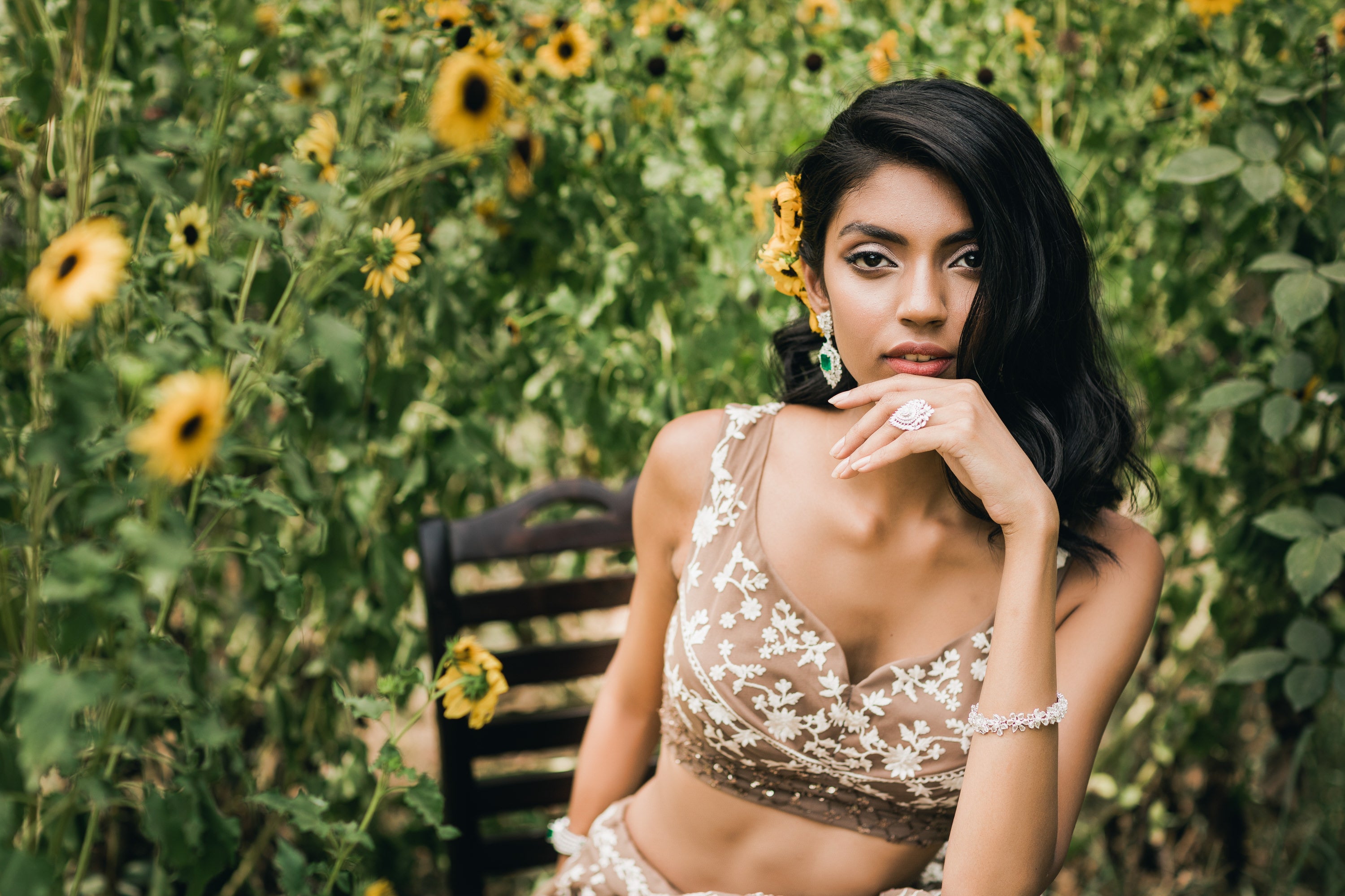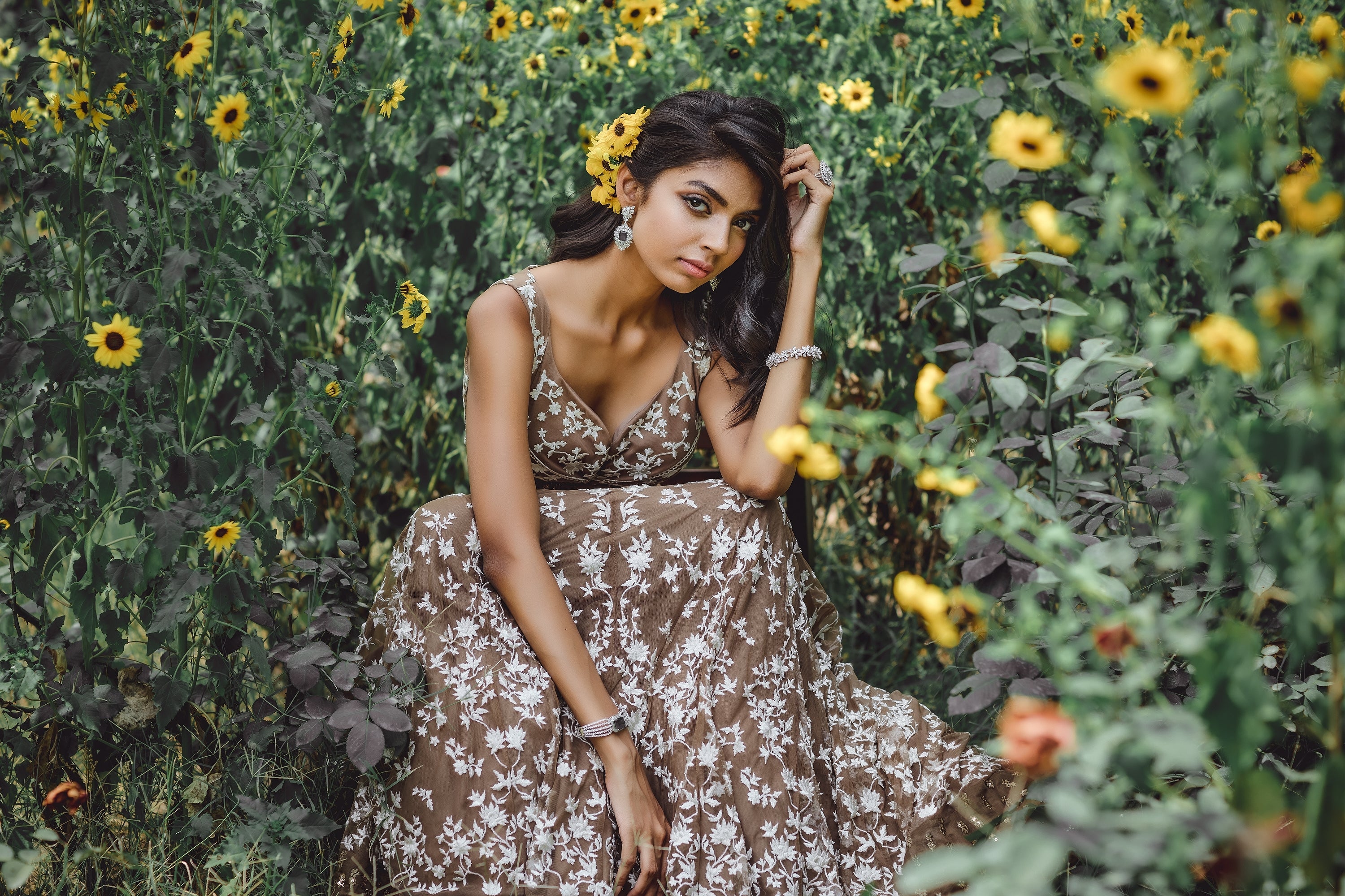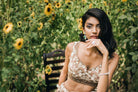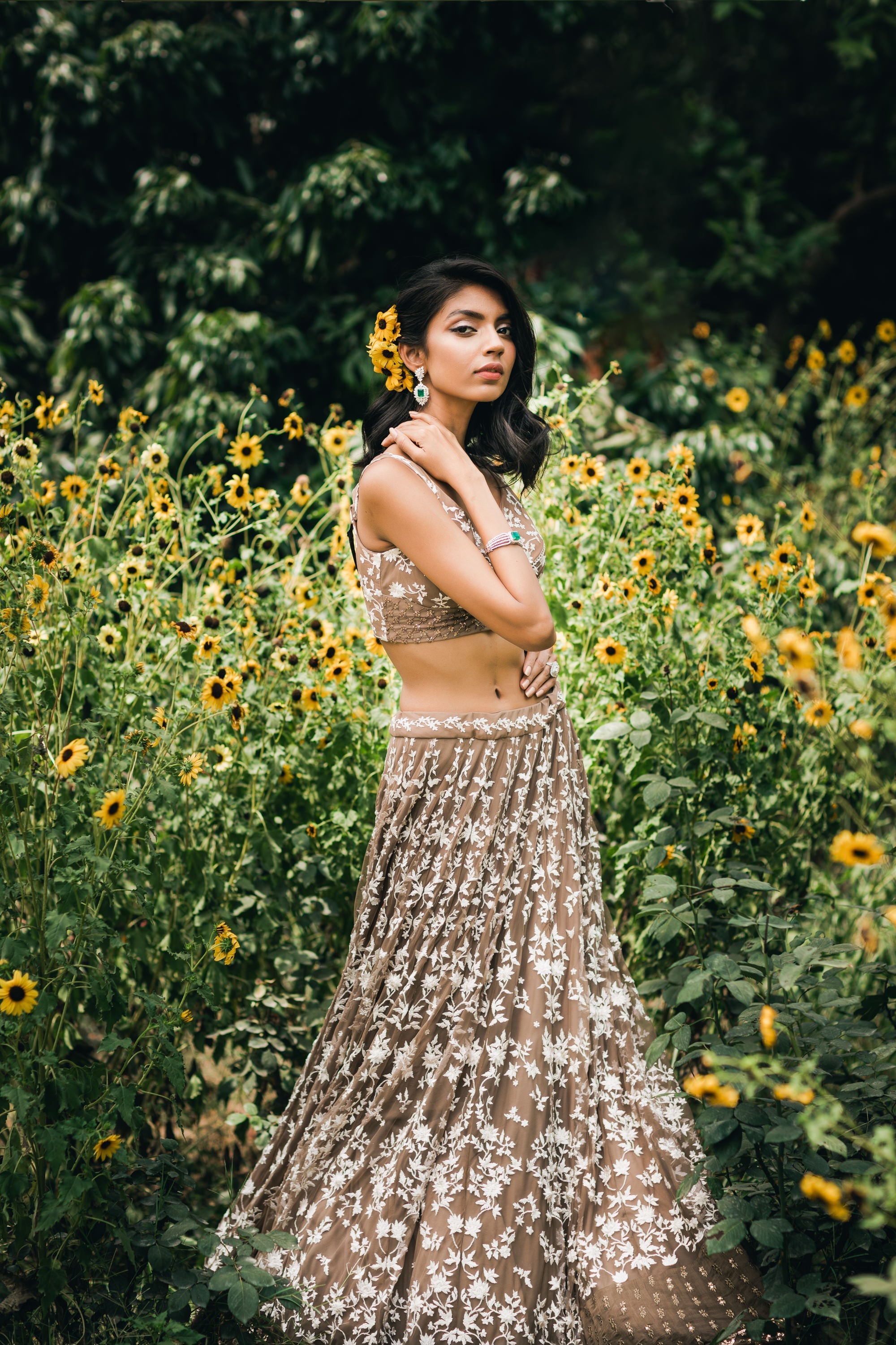 Featuring a COFFEE THREADWORK LEHENGA SET IN NET.