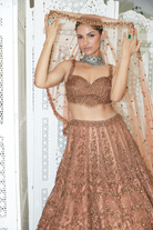 Copper Net Lehenga Choli With A Head Veil Embroidered In Tonal Beadwork, Sequins And Crystals.