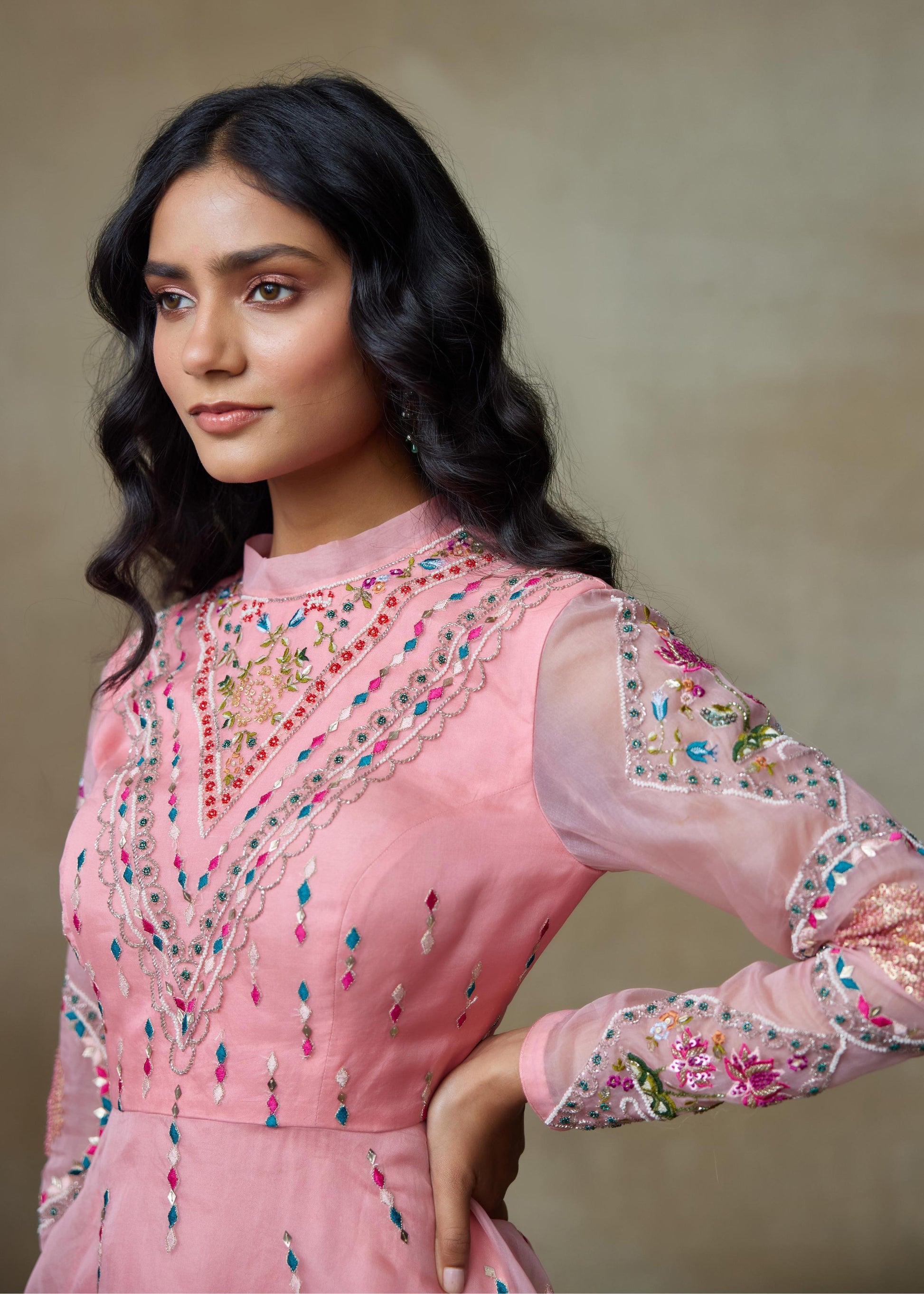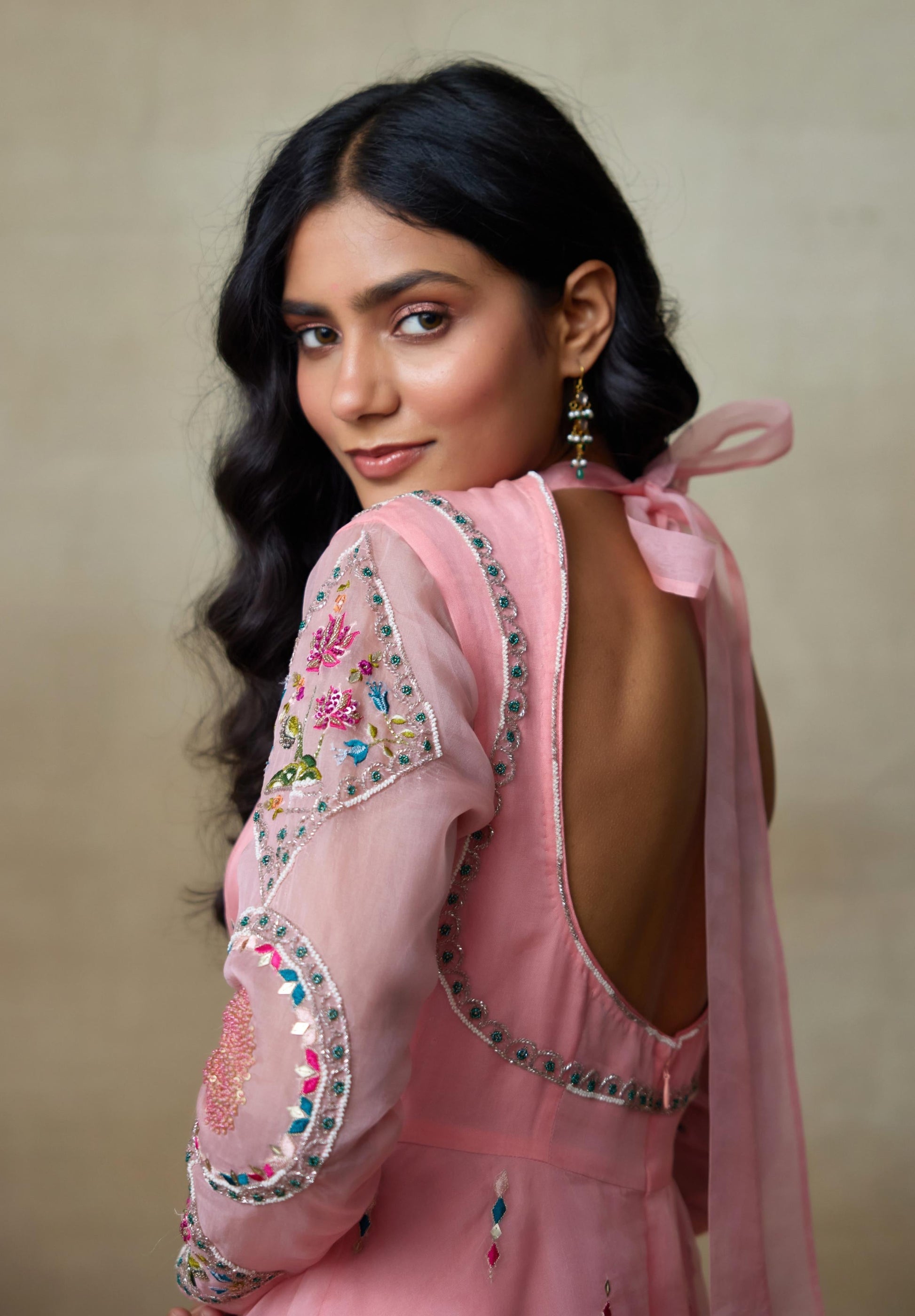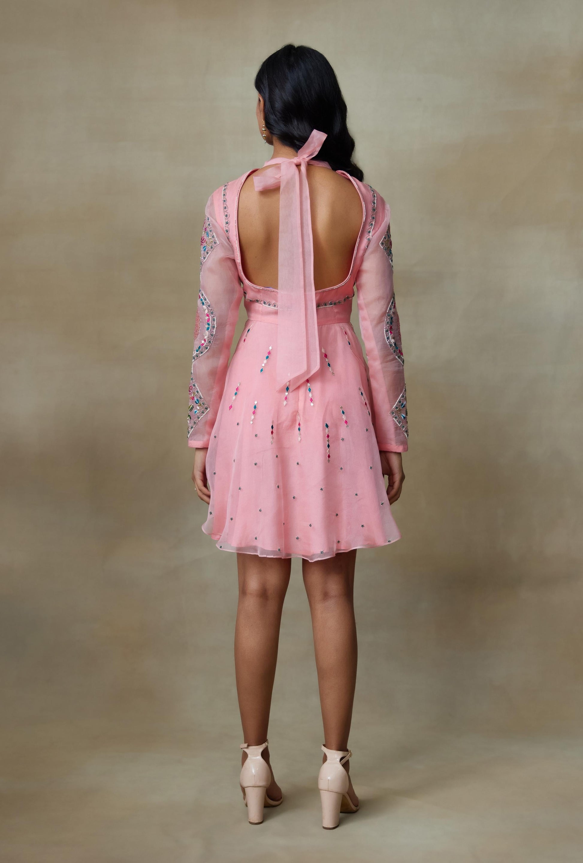 Our Flamingo Pink Silk Organza Short Dress With A Bow, Has Handcrafted Floral Design, It Sparkles With Diamond Shaped Sequence Work. The Handwork Showcases Motifs Of Diamond Shaped Sequence Work Which Makes It An Enchanting Ensemble.
