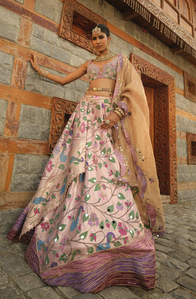 Pink Paithani Silk fabric featuring beautiful deep V- neck blouse, sleeveless blouse and shimmer dupatta. The blouse includes of heavy hand embroidery all over to give a soft touch with a mix of modern and tradition look, while the blouse has embroider applique all over with little colorful beads all over the border giving it a luxury look at the end. The texturing on the skirt includes pearl embellished, zari sequin with mirror work over skirt and on its border. This set comes with a well crafted handmade belt which is worn over the to define the waistline.