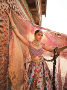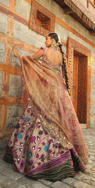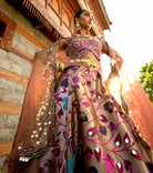 Purple Paithani Silk fabric featuring beautiful deeep V- neck blouse, cap sleeve blouse and shimmer dupatta. The blouse includes of heavy hand embroidery all over to give a soft touch with a mix of modern and tradition look, while the blouse has embroider applique all over with little colorful beads all over the border giving it a luxury look at the end. The texturing on the skirt includes pearl embellished, zari sequin with mirror work over skirt and on its border. This set comes with a well crafted handmade belt which is worn over the to define the waistline.