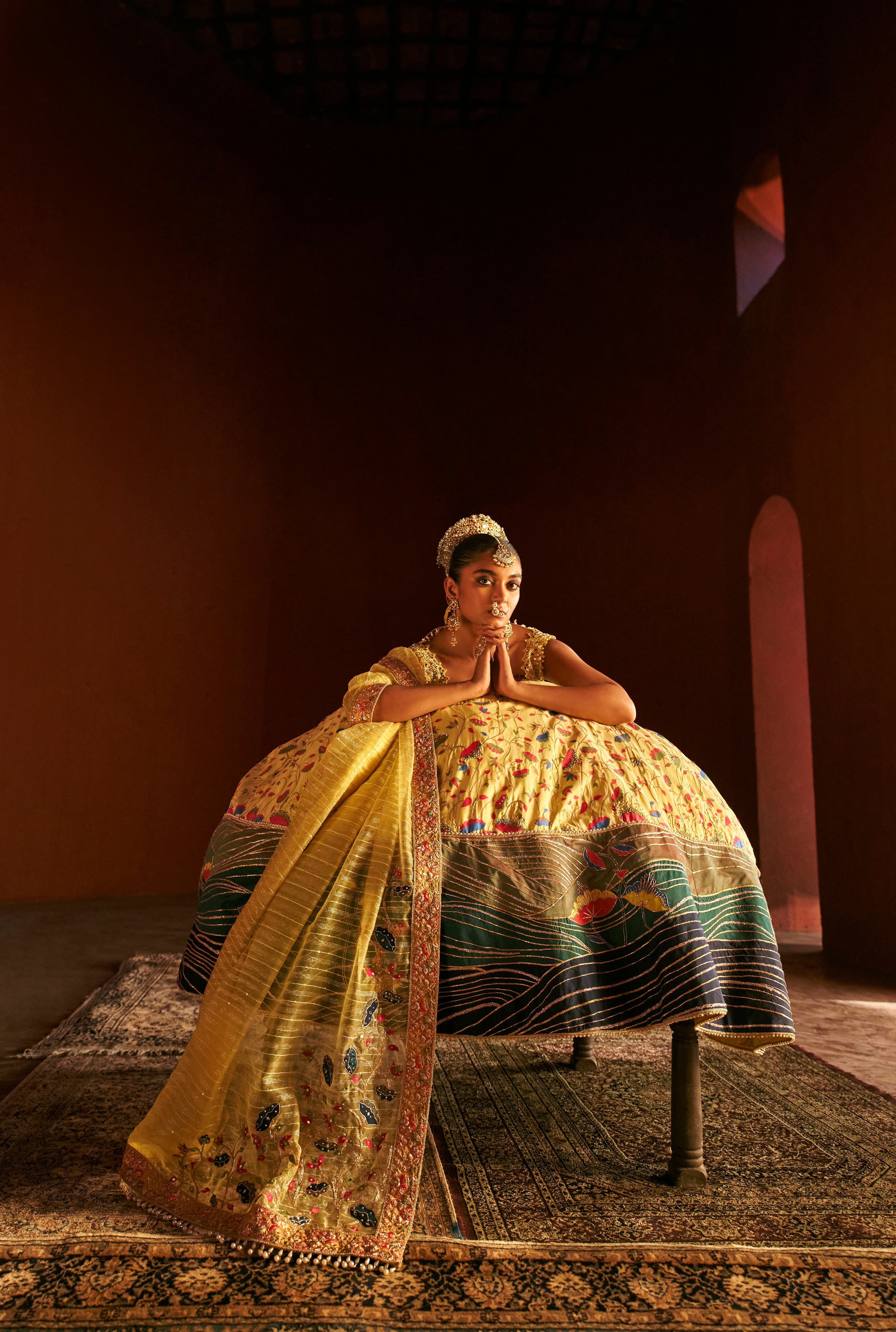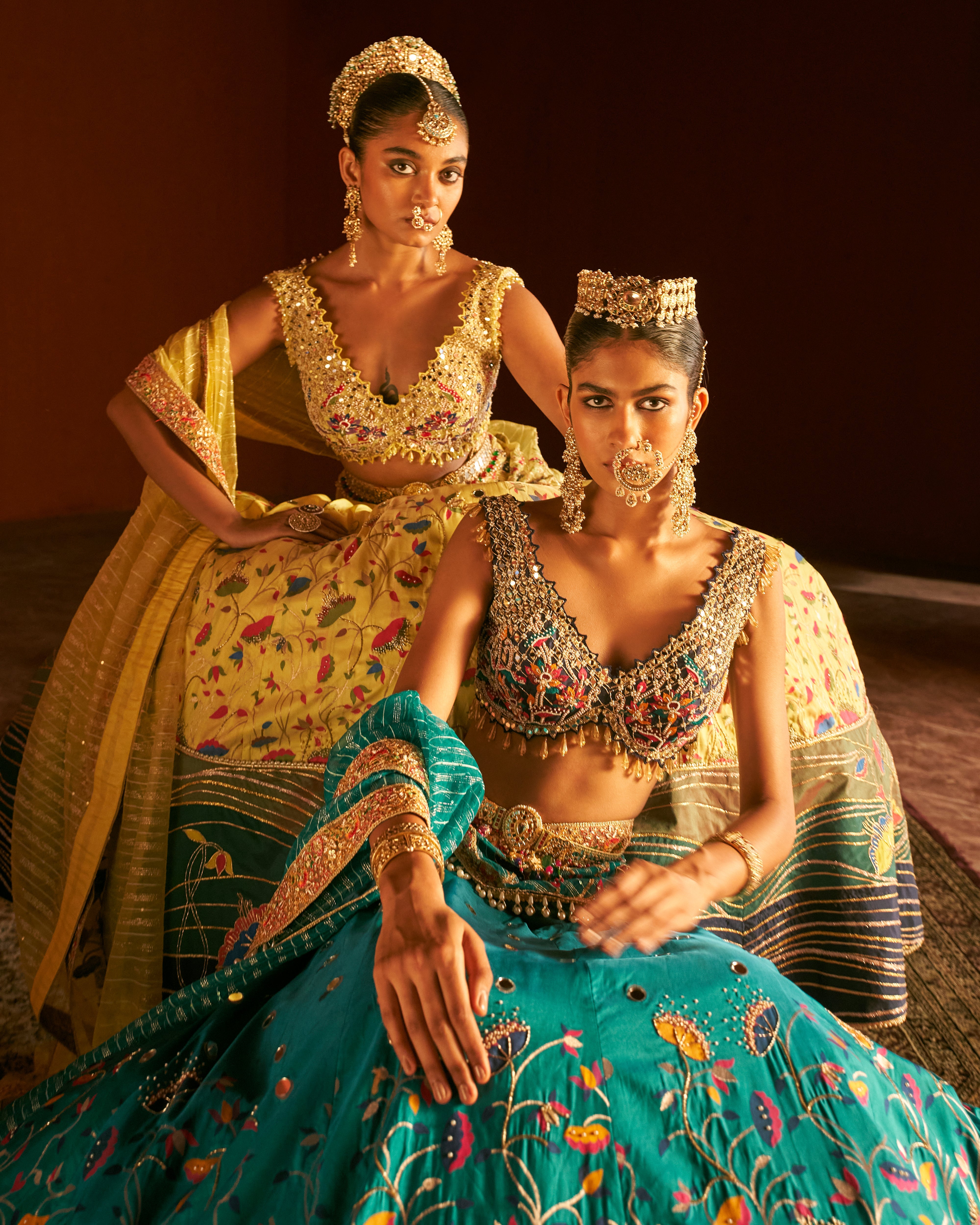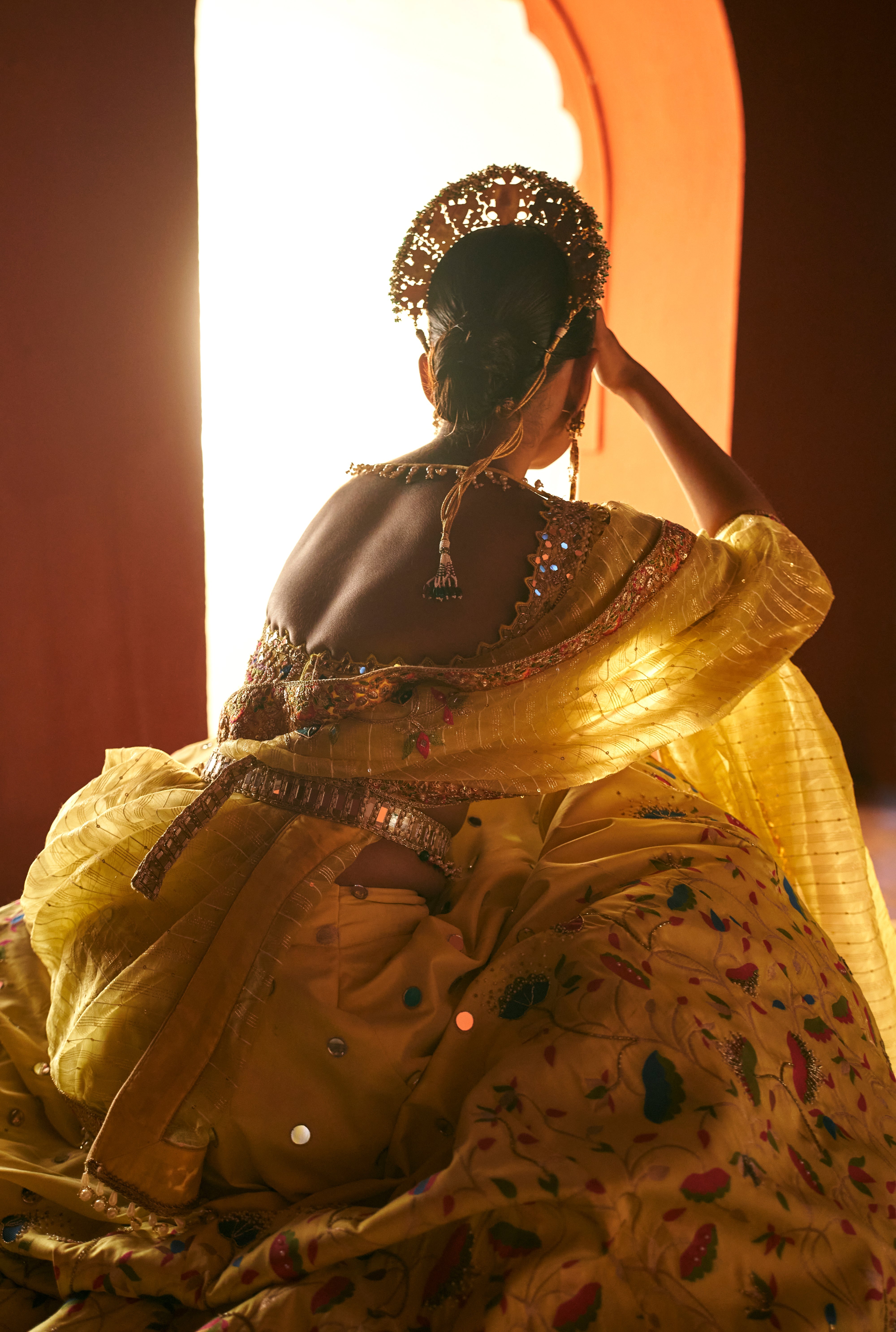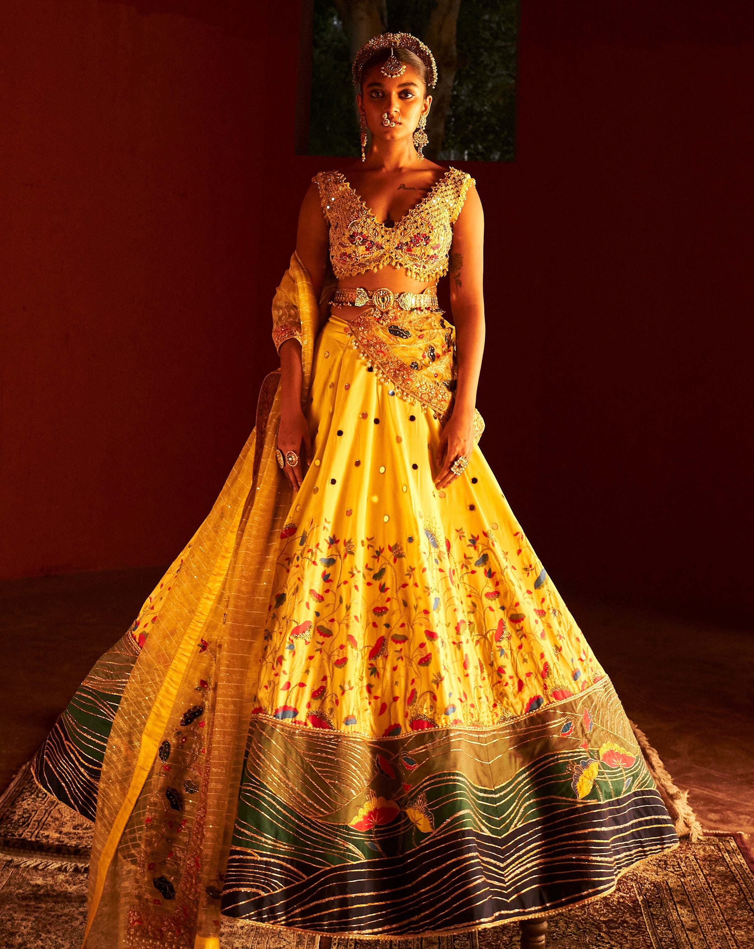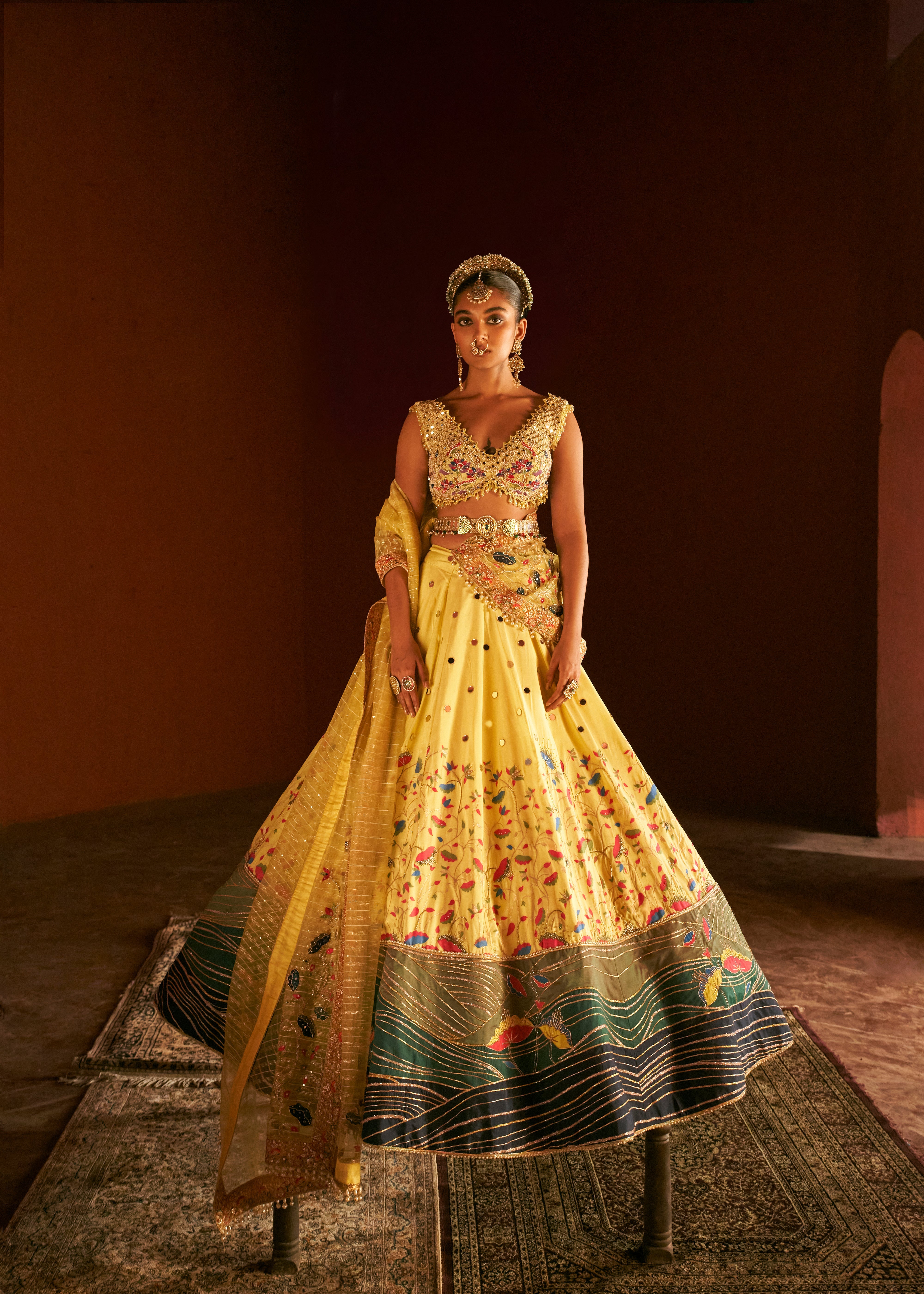 Yellow Paithani Silk fabric featuring beautiful deep V- neck blouse, sleeveless blouse and shimmer dupatta. The blouse includes of heavy hand embroidery all over to give a soft touch with a mix of modern and tradition look, while the blouse has embroider applique all over with little colorful beads all over the border giving it a luxury look at the end. The texturing on the skirt includes pearl embellished, zari sequin with mirror work over skirt and on its border. This set comes with a well crafted handmade belt which is worn over the to define the waistline.