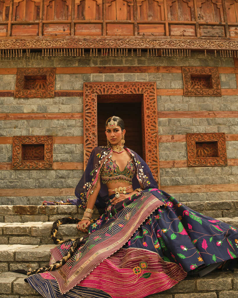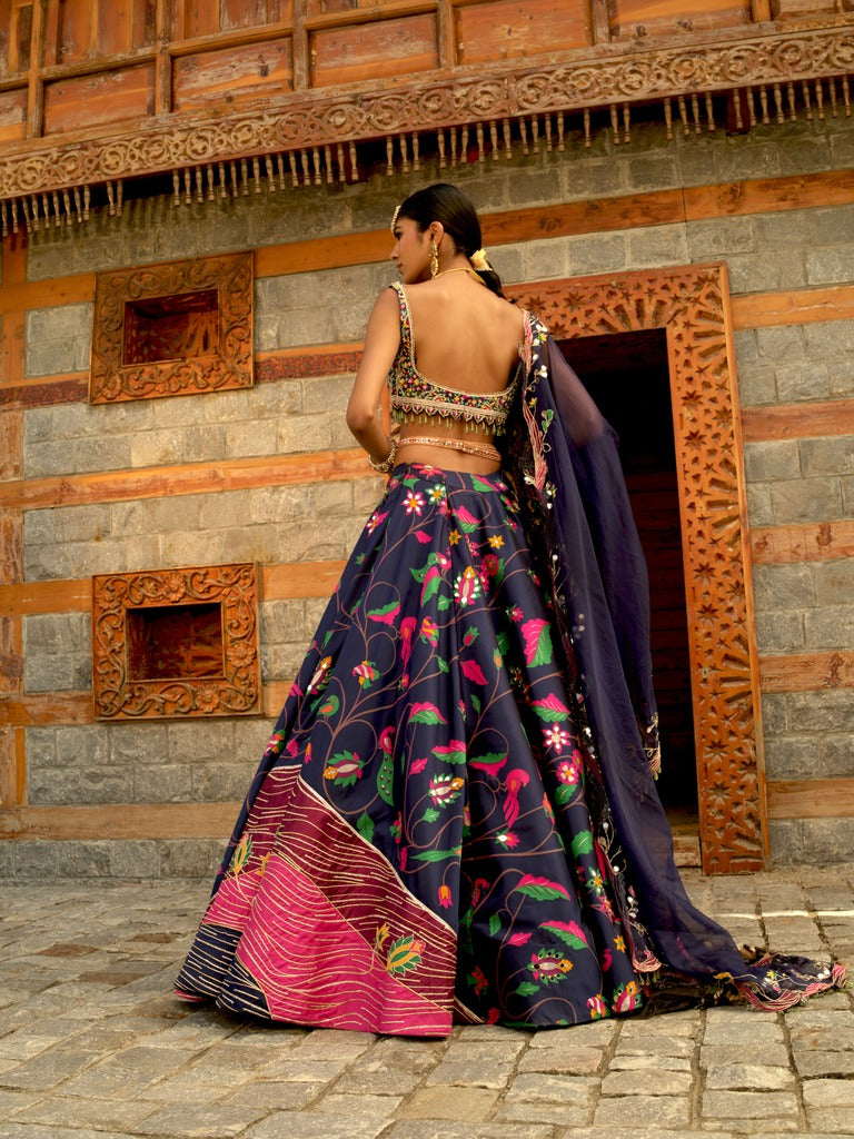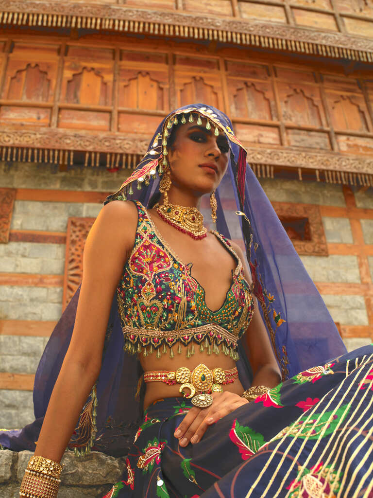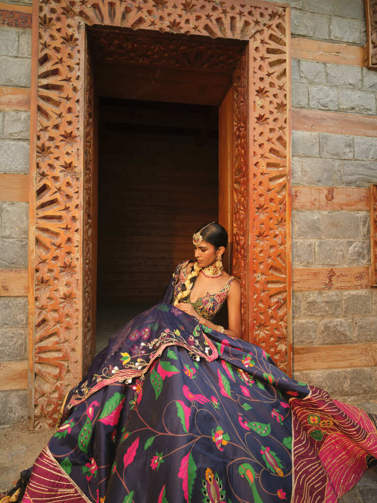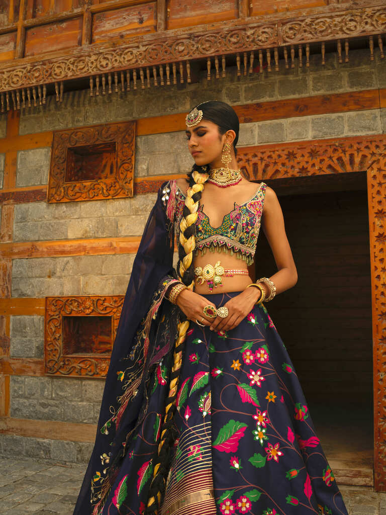 Dark Teal blue Paithani Silk fabric featuring beautiful deep V- neck blouse, sleeveless blouse and shimmer dupatta. The blouse includes of heavy hand embroidery all over to give a soft touch with a mix of modern and tradition look, while the blouse has embroider applique all over with little colorful beads all over the border giving it a luxury look at the end. The texturing on the skirt includes pearl embellished, zari sequin with mirror work over skirt and on its border. This set comes with a well crafted handmade belt which is worn over the to define the waistline.