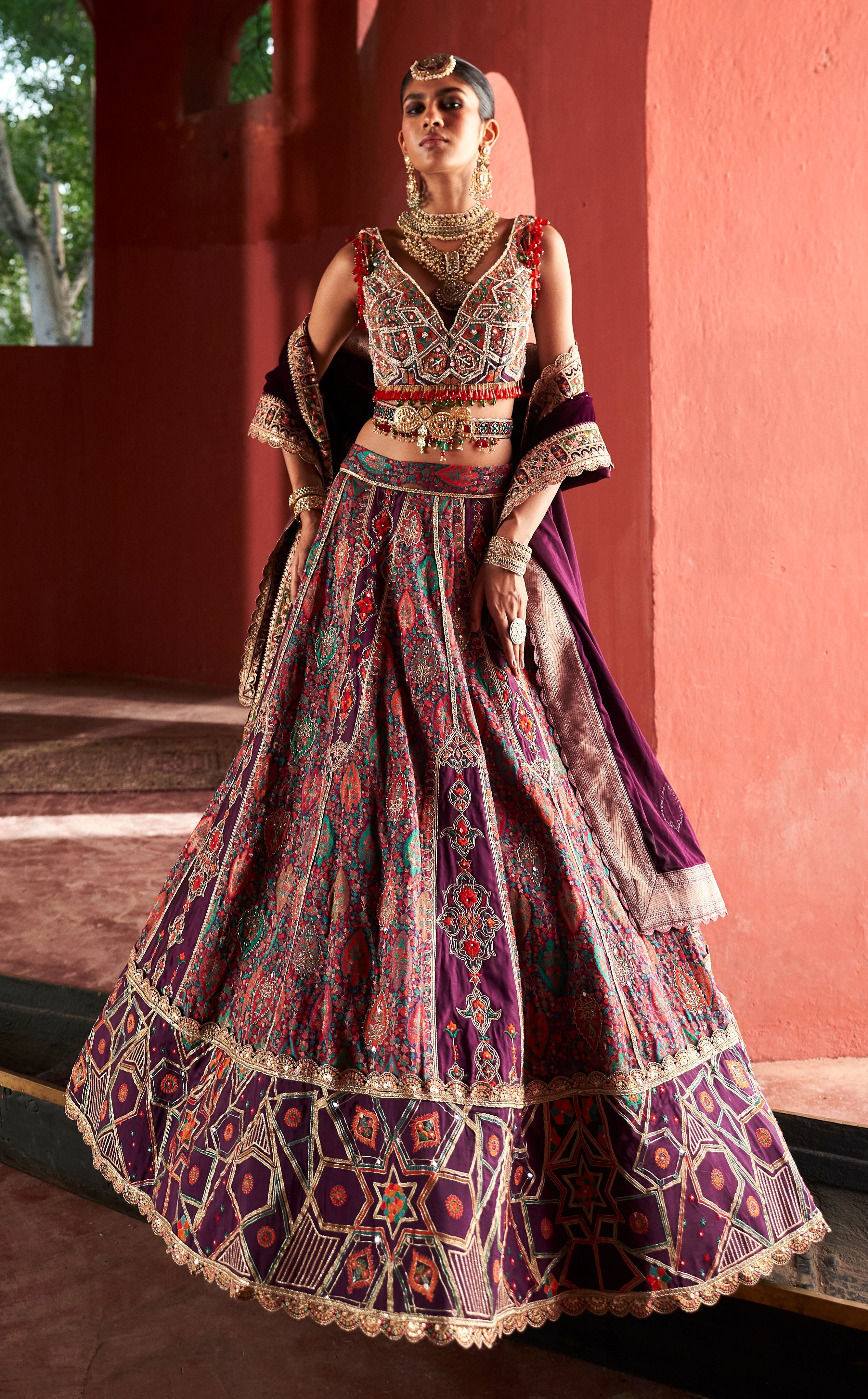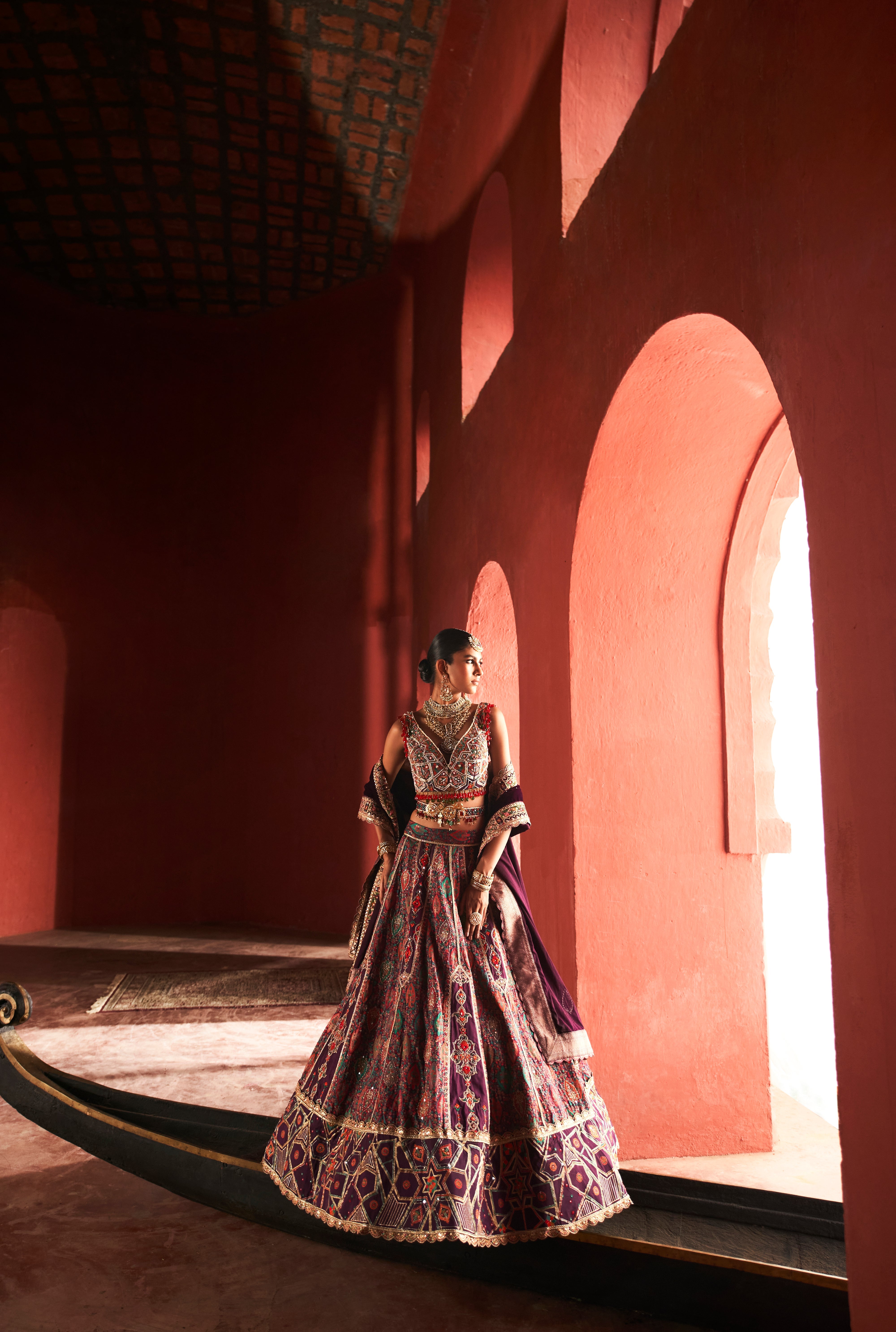 Dark Purple Jamawar lehenga set featuring leaf neckling blouse with hand embriodered zari work over the blouse including pearls and latkans on the geometrical shaped figures and on the armhole. The blouse includes of hand embroidery all over to give a soft touch with a mix of modern and tradition look, while the Jamawar skirt has embroider applique all over with little colorful beads and the zari work over the border giving it a luxury look. This set comes with a well crafted handmade belt which is worn over to define the waistline.