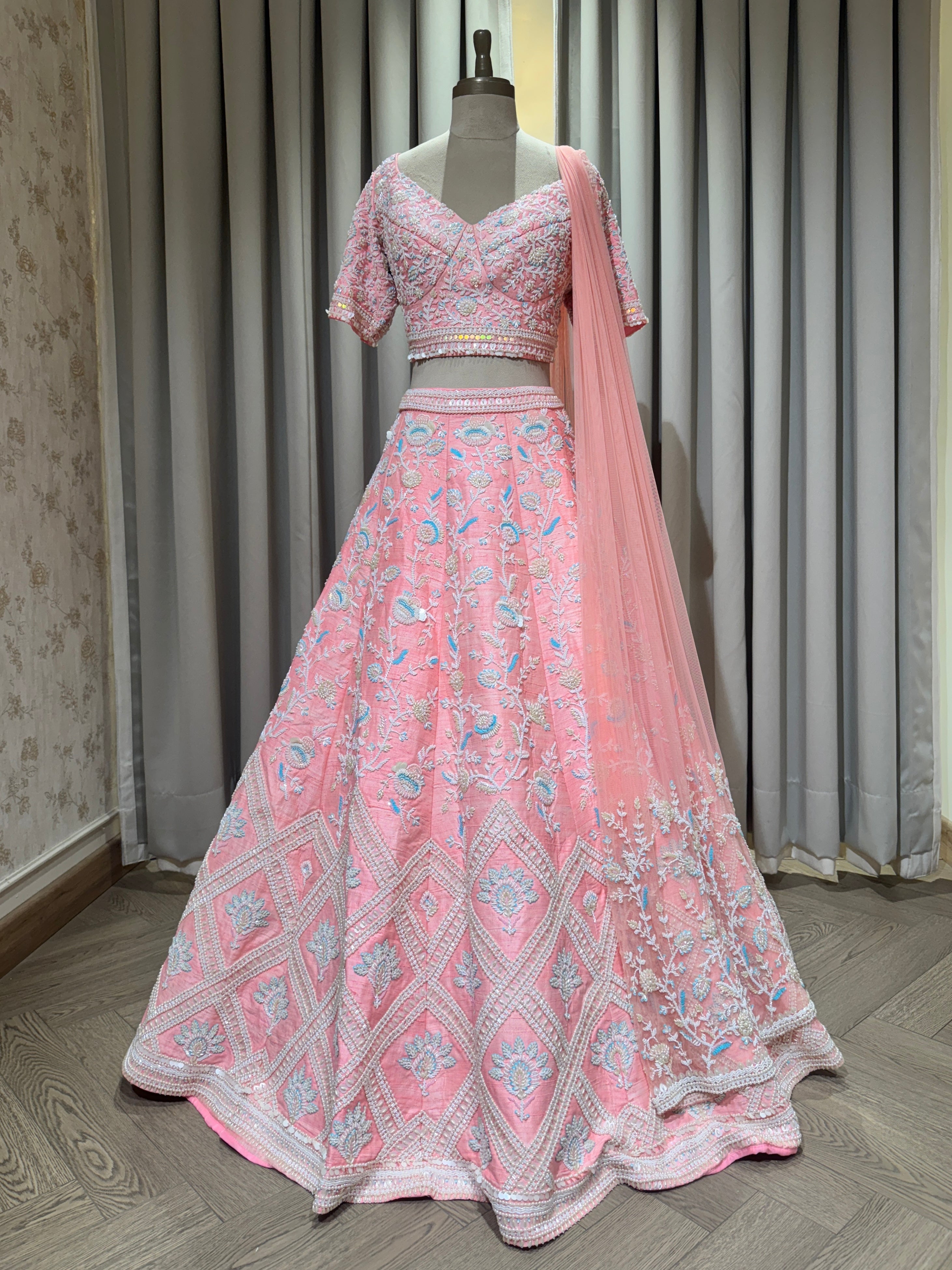 The Dahlia lehenga set is a lime color base pure raw silk, heavily floral embroidered lehenga set with 12 kalis. The dupatta is a net cutwork Piece with detailed pearl heavy border. Paired with a deep floral cutwork blush top