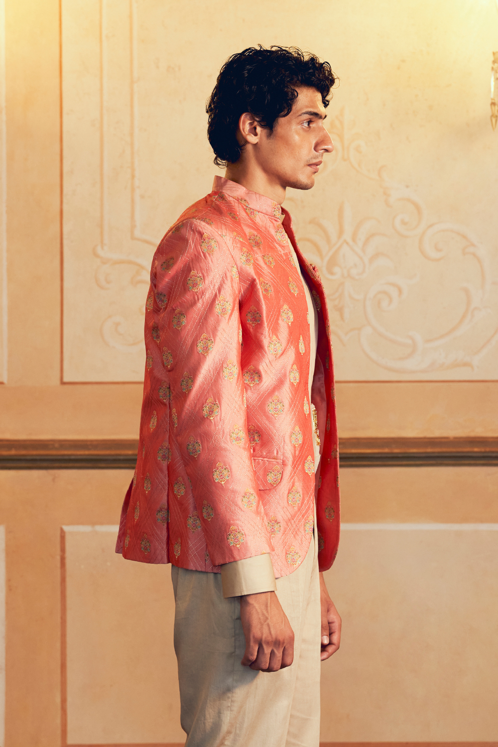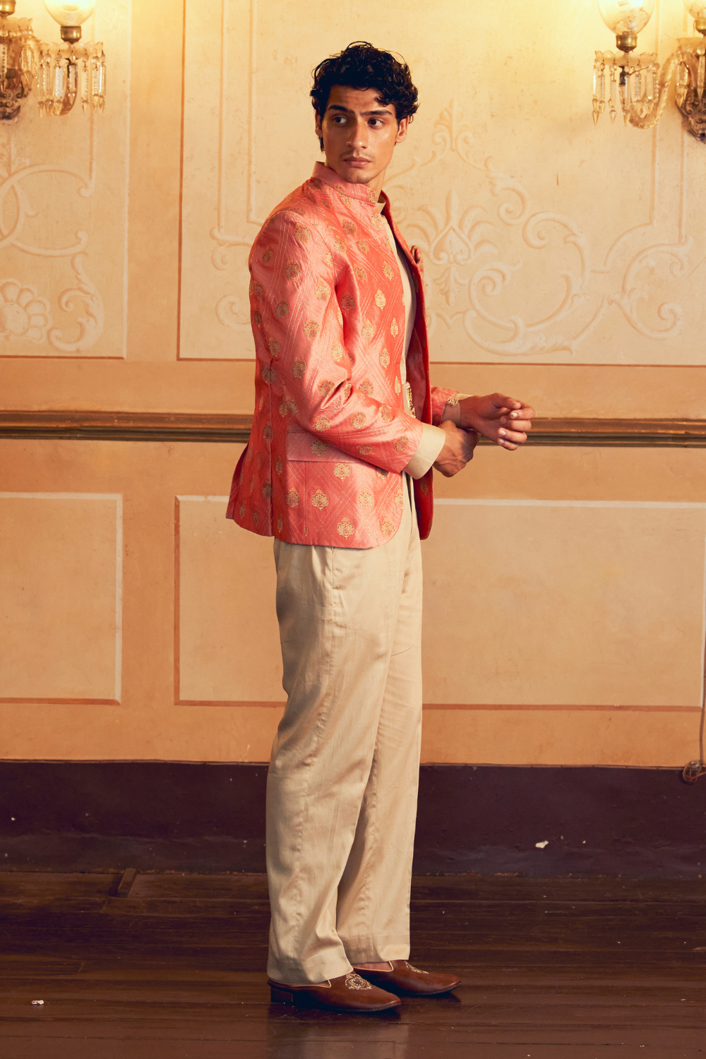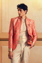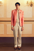 This classic Coral Jacquard Banarasi men's jacket set, quilted with silk zari and adorned with semi precious meenakari buttons, is paired with a beige silk cotton kurta and pants, completed by a signature embellished belt, blending opulence with simplicity.
