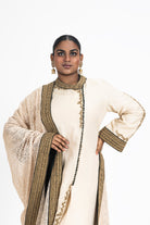 Cream Monga Silk Kurta And Palazzo With A Chanderi Jaal Odhni Featuring Antique Dori And Zardozi Embroidery.