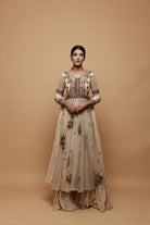 Featuring a CREAM FRONT OPEN JACKET WITH FLARED PANTS IN NET.