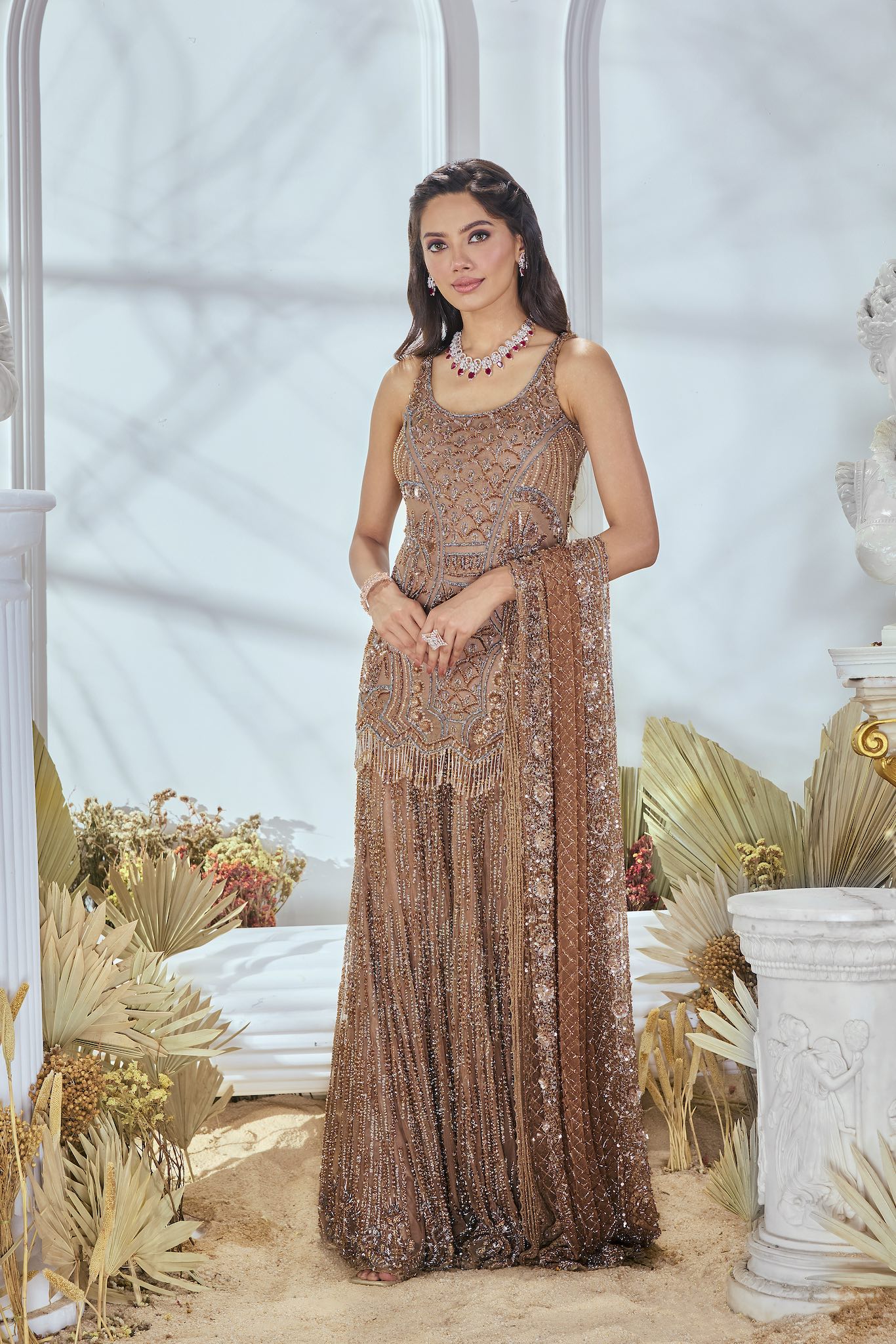 Featuring a gold suit, meticulously hand-embroidered on tulle fabric with crystals, cutdana, sequin work. The shirt shows crystal tassels at the bottom. Paired with a cutdana and crystal detailed matching dupatta with embroidery on all four sides.