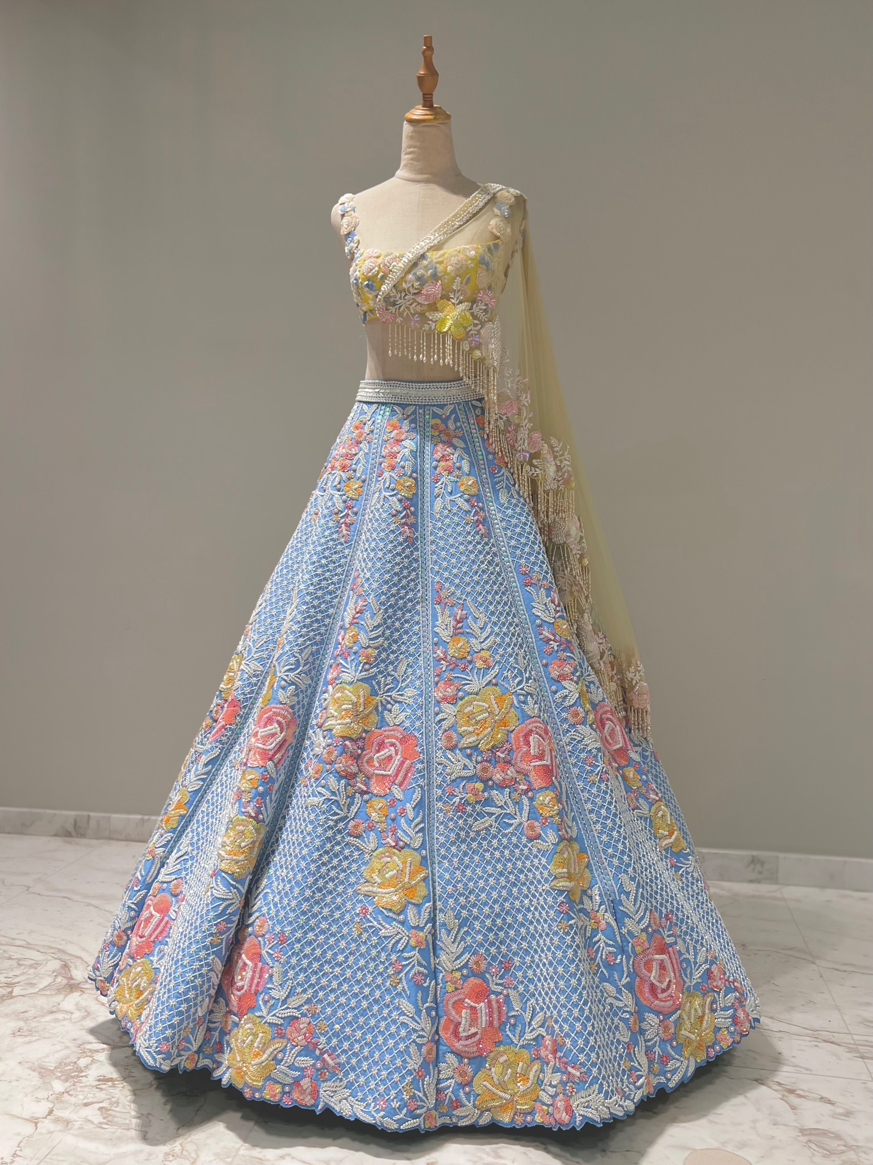 The custom Magnolia set is a embroidered raw silk blue Lehenga with Jali work and hand embroidered flowers throughout the skirt.It is paired with a floral embroidered top and one shoulder drape style yellow dupatta with floral embroidery and tassels.