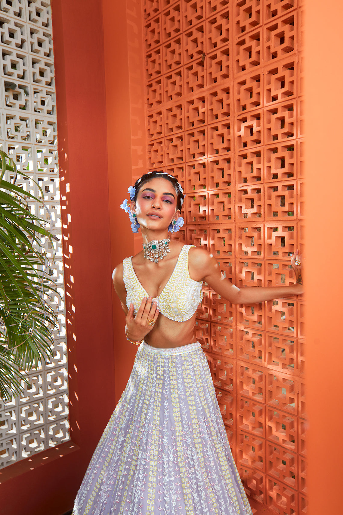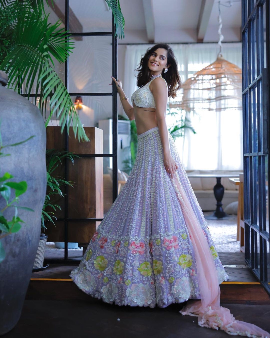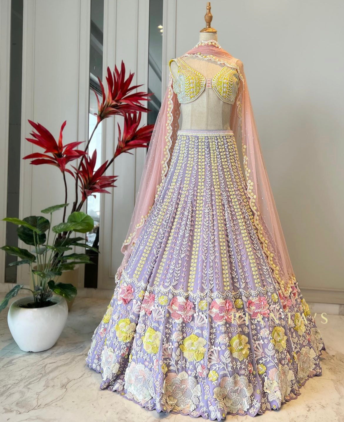 The Dreamy Daisy set is hand embroidered metallic georgette Lehenga with 20 kalis. This graceful lilac Lehenga is paired with yellow embroidered top. The Dupatta is delicately embroidered over pink net.