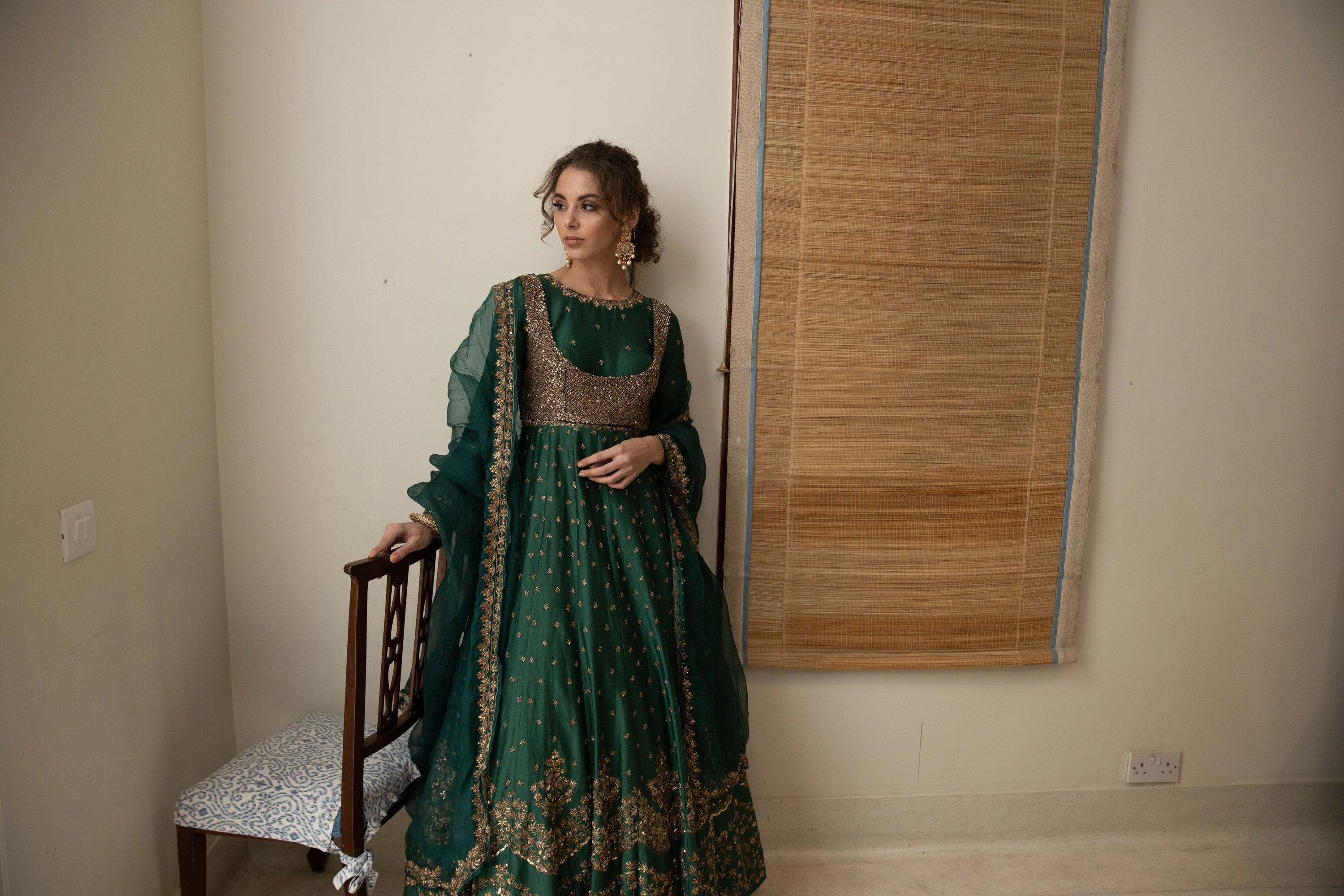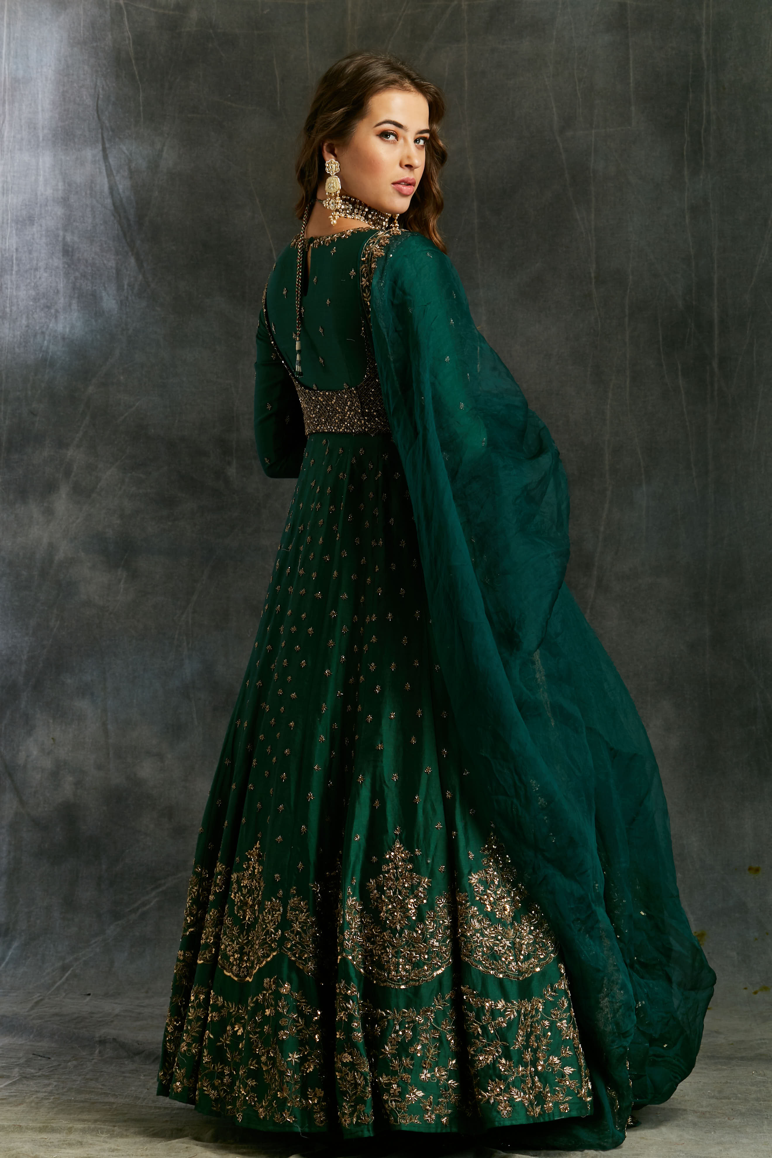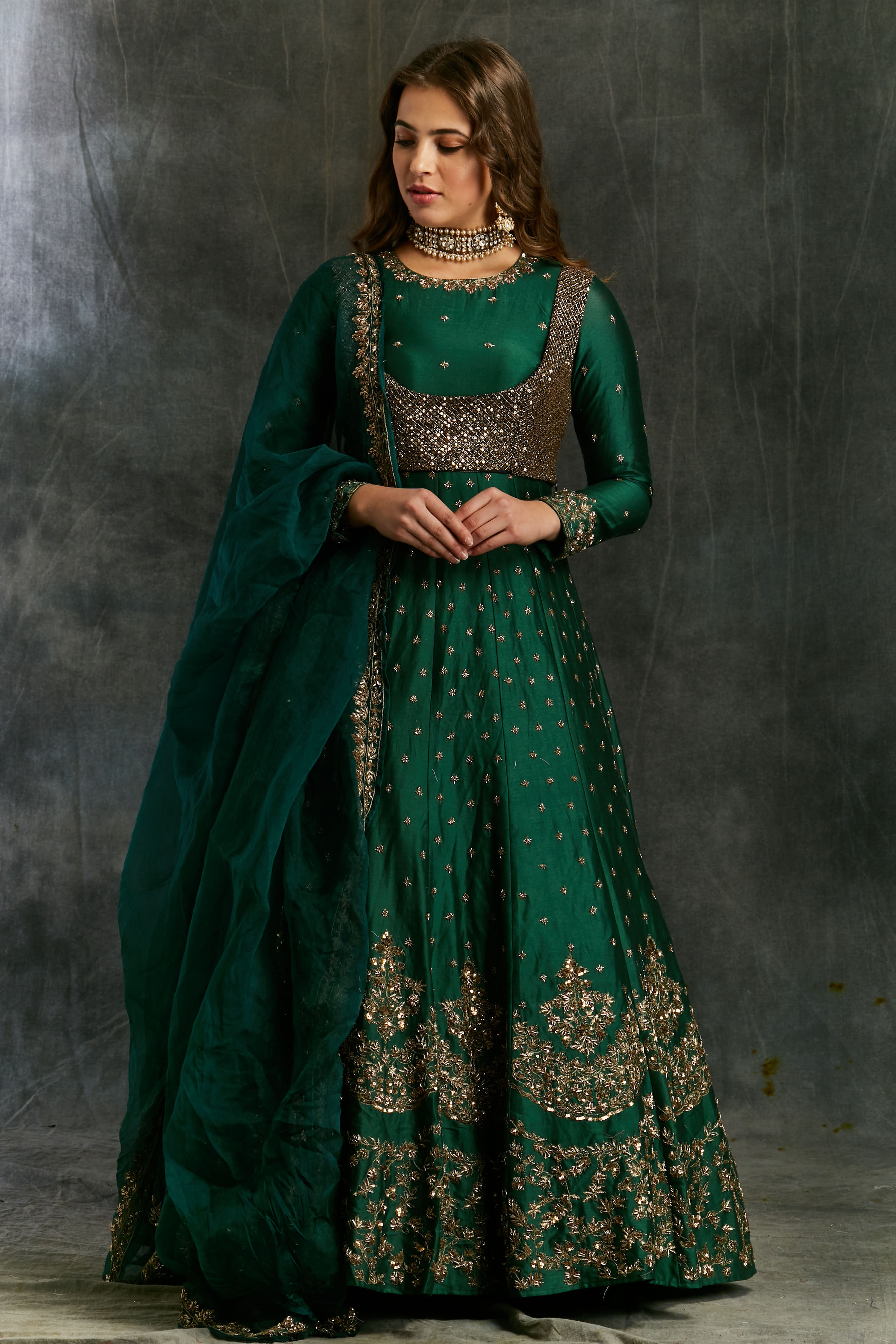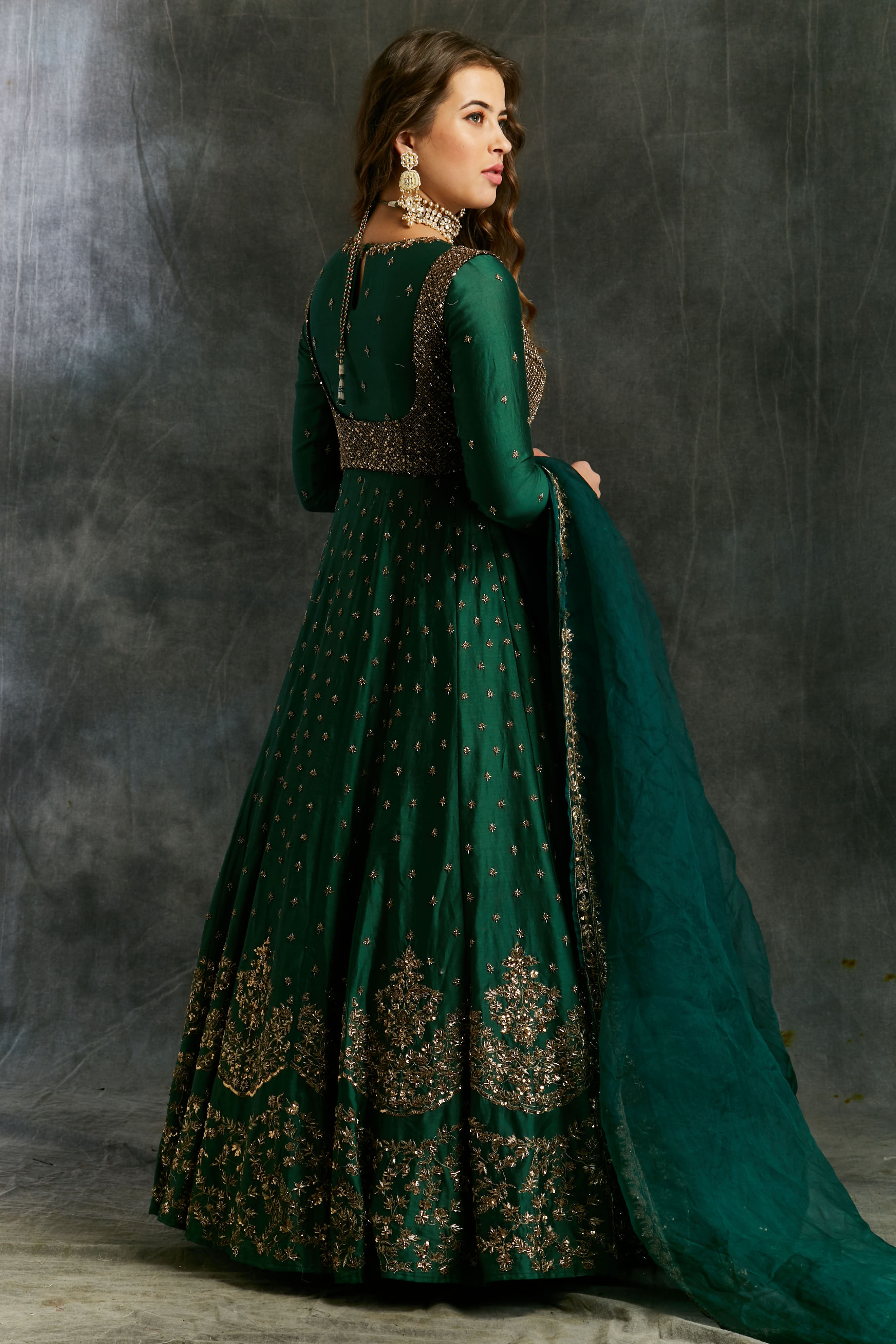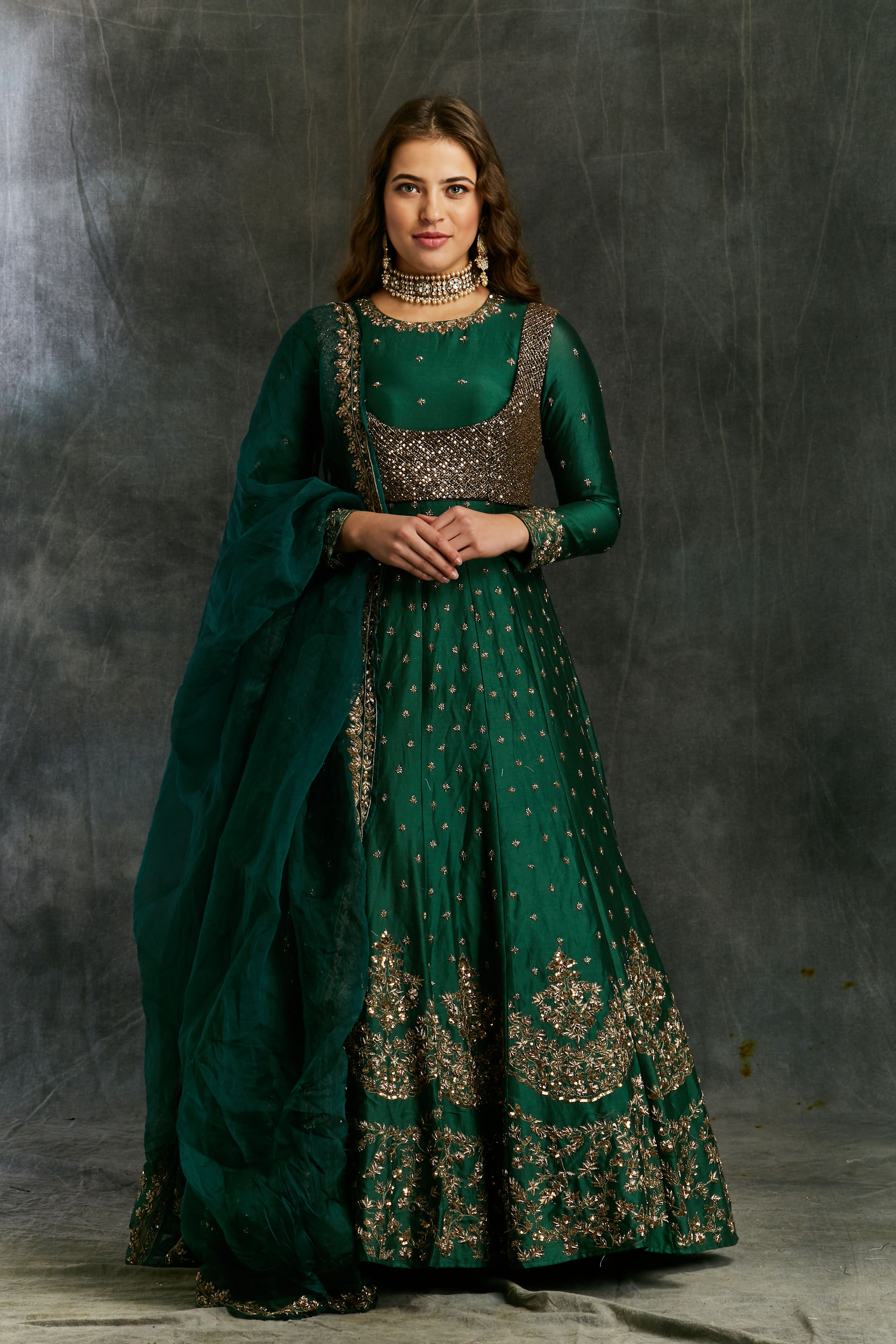 Featuring a DARK GREEN EMERALD ANARKALI SET IN RAW SILK.