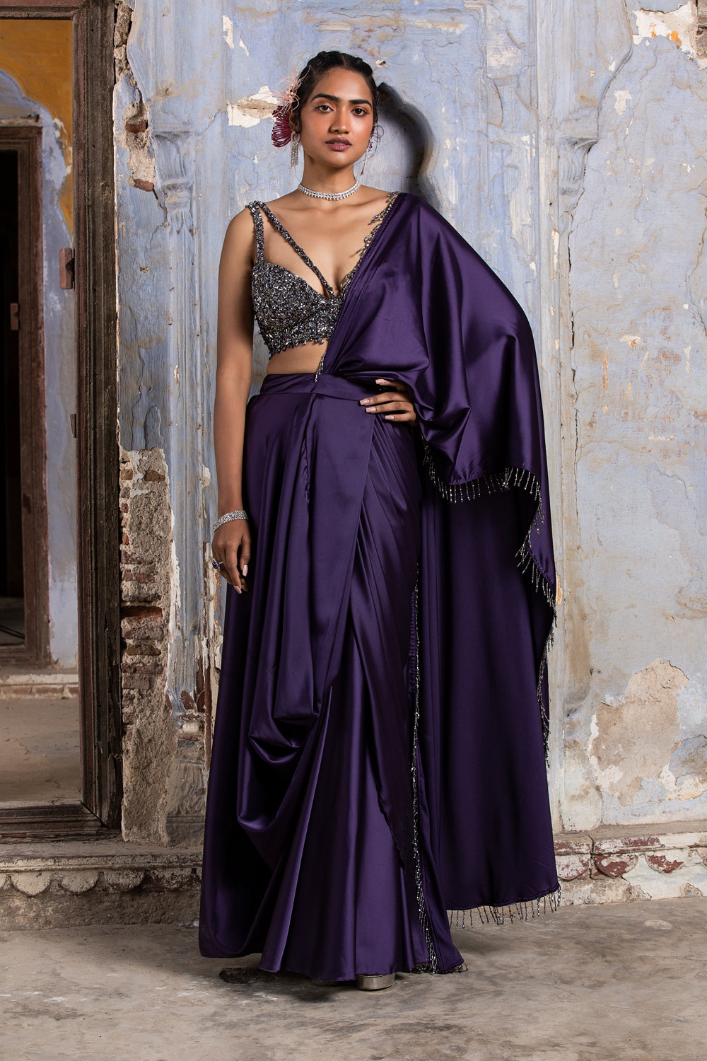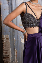 Purple Satin Draped Saree with net bustier with self and gunmetal embroidery in sequins, beadwork, and crystals.