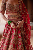 Deep red raw silk lehenga choli and belt, with an all over worked net dupatta; intricately embroidered in antique gold dabka, kasab, sequins and crystals.